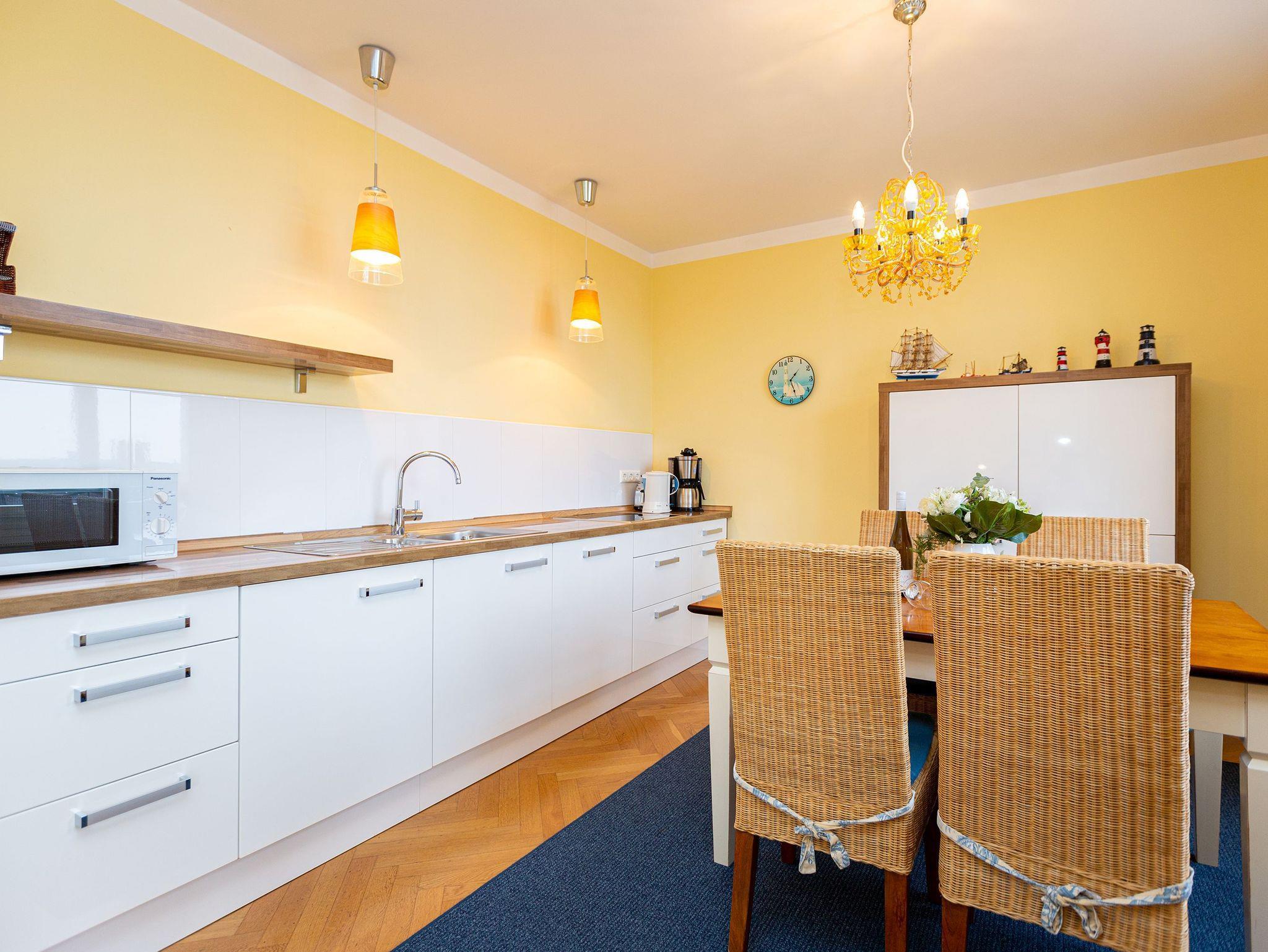 Residieren Sie im Dachgeschoss (56 qm) der Villa. Genießen Sie den schönen Meerblick [&] lassen Sie sich von der modernen, geschmackvollen Einrichtung verwöhnen. Der aufwendig verlegte Naturholzboden, ein elegantes Bad und die zwei Balkone bieten Ihnen besten Wohnkomfort. Eine offene Küche mit Essplatz, das Wohnzimmer mit Schlafcouch, ein Schlafzimmer mit Doppelbett und einem zusätzlichen Einzelbett bieten Platz für 2 bis 4 Personen. Auf Wunsch stellen wir für unsere kleinen Gäste ein Kinderreisebett und einen Kinderhochstuhl ( gegen Aufpreis) zur Verfügung. Für Ihren Komfort sind die Betten bei der Anreise bezogen und Handtücher liegen bereit. Ein Pkw-Stellplatz steht am Haus unter dem Carport zur Verfügung.