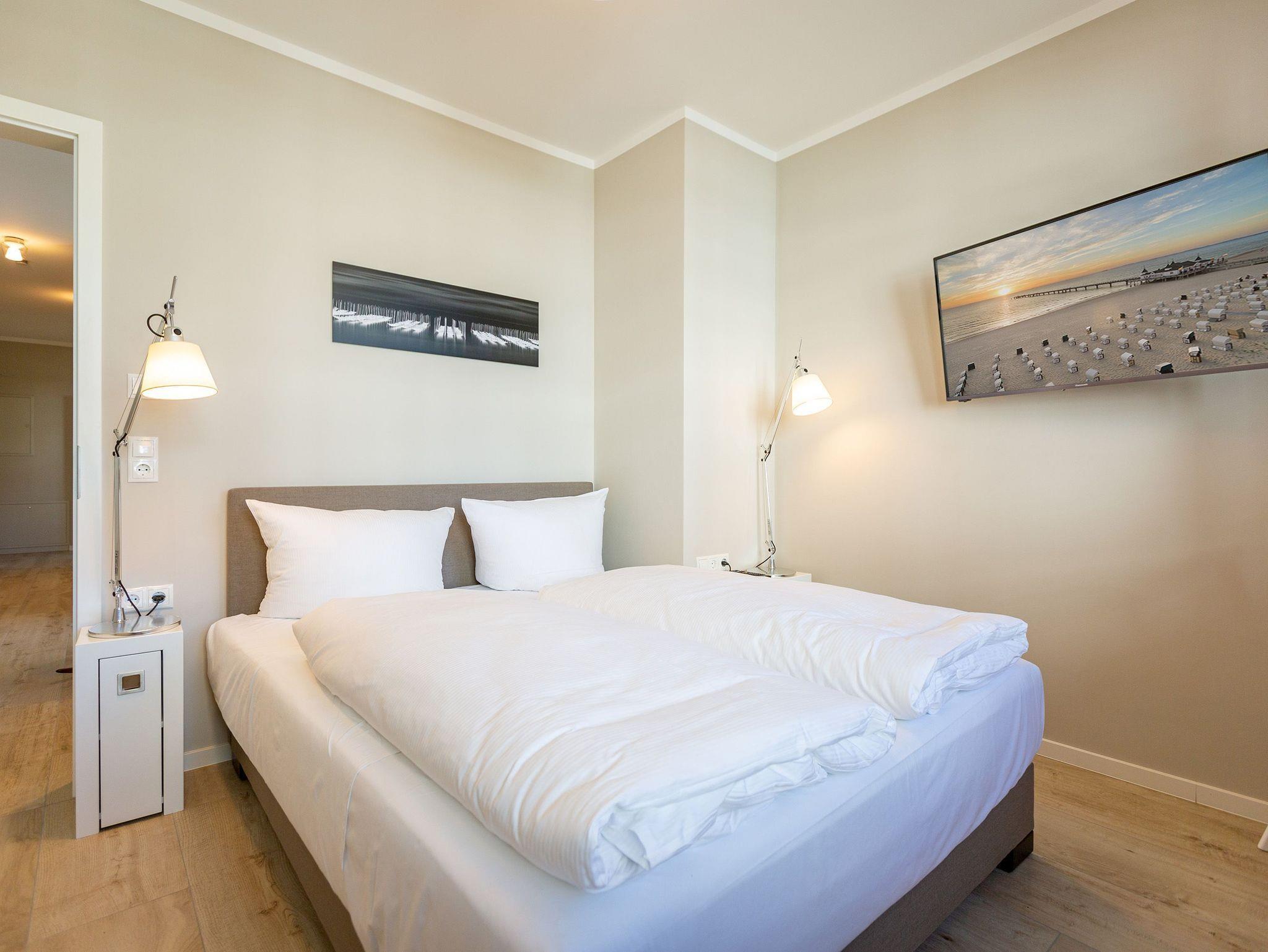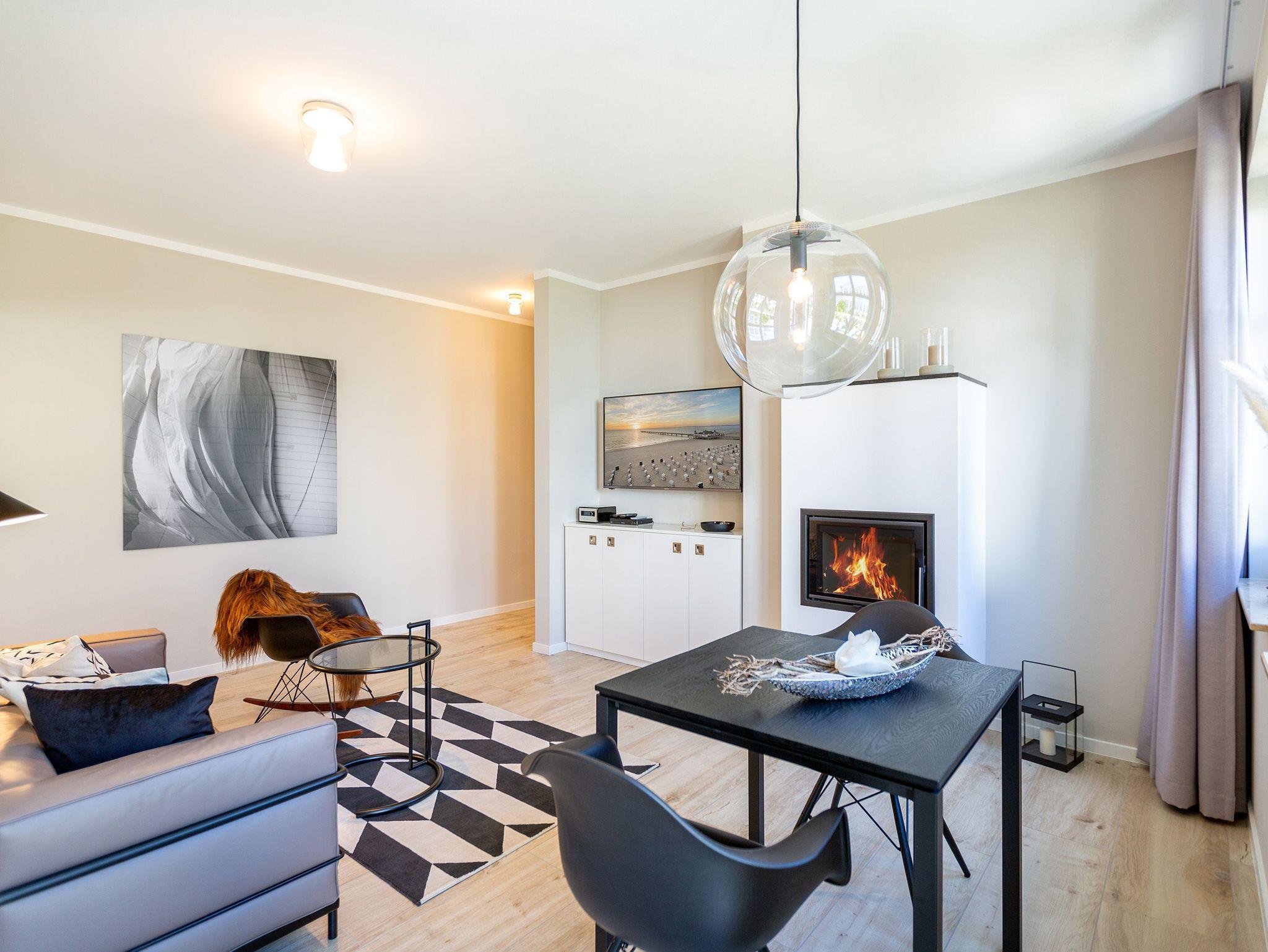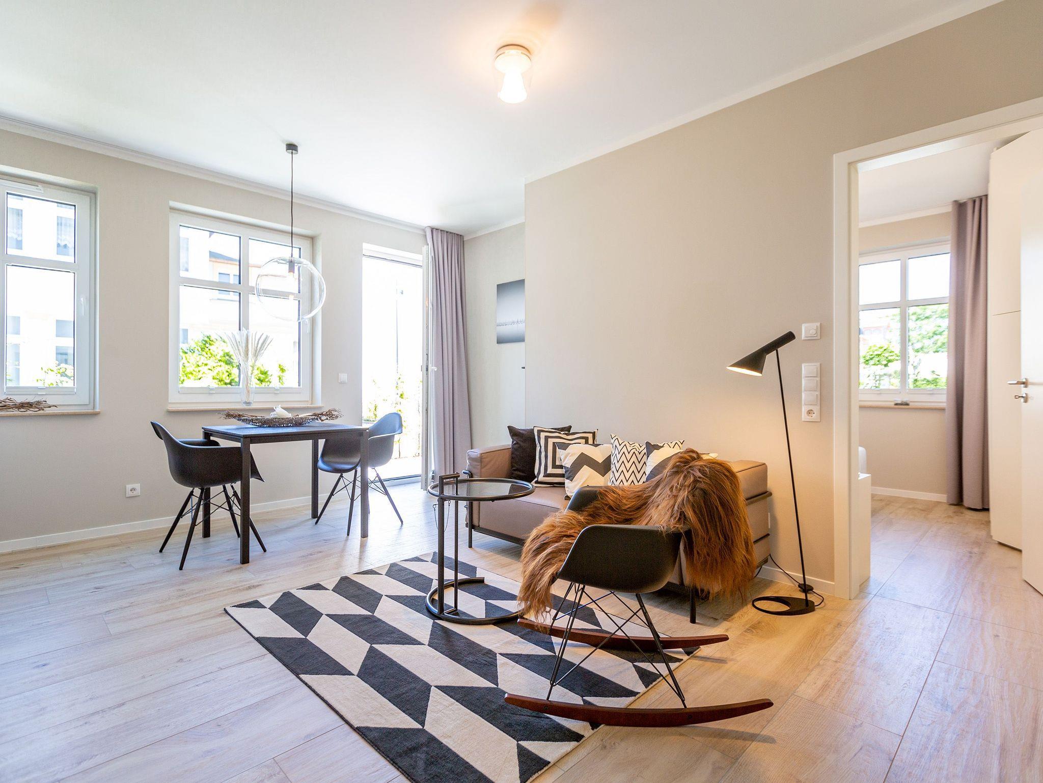 Dieses kleine, aber feine Design-Appartement für zwei Personen mit Kleinkind (im Kinderreisebett) ist das perfekte Erholungsrefugium für alle, die es gern schick, modern und stylisch mögen. Auch Ihren geliebten Vierbeiner dürfen Sie hier mitbringen. Wohlfühlen auf 50 Quadratmetern ist hier garantiert. Da sich das Appartement im Erdgeschoss befindet, hat es Zugang zu einer ? natürlich nur für Sie reservierten und zur Wohnung gehörenden ? Sonnenterasse mit Strandkorb und Gartenmöbeln. Mitten im Grün und umgeben von wunderschönen Bädervillen können Sie hier eine entspannte Zeit beim Essen oder Sonnenbaden genießen. Das Wohnzimmer dieses Zwei-Raum-Appartements ist modern und elegant mit ausgesuchten Design-Möbeln eingerichtet. Die Cassina Couch nach dem berühmten Design von Le Corbusier, aber auch der Schalen-Schaukelstuhl eignen sich perfekt zum Runterkommen und Faulenzen. Ein großer Flat TV (50 Zoll) sorgt für Unterhaltung. An kühlen Inseltagen wärmt der Kaminofen und sorgt für eine gemütliche und romantische Atmosphäre. Die an das Wohnzimmer angrenzende Küche ist mit hochwertigen Markengeräten voll ausgestattet. Ob Qualitätsmesser-Set, Induktionsherd, Senseo Padmaschine, Geschirrspüler oder das Geschirr selbst ? hier werden Sie alles zu Ihrer Zufriedenheit vorfinden. Kochen macht mit diesem Equipment sogar im Urlaub Spaß. Im Wohnzimmer befindet sich zudem ein schöner Essplatz. Im Schlafzimmer wartet viel Gemütlichkeit mit einem bequemen Boxspringdoppelbett (1,60 m x 2,00 m) auf Sie. Viel Platz für die Urlaubsgarderobe bietet der eigens angefertigte Einbauschrank. Das Bad hat Tageslicht und verfügt über eine Regendusche und ein WC. Bei Anreise sind die Betten bezogen und Handtücher liegen für Sie bereit. In der Tiefgarage gehört zu der Wohnung 4a ein Stellplatz. Ein separater Fahrradraum ist im Keller ebenfalls vorhanden.