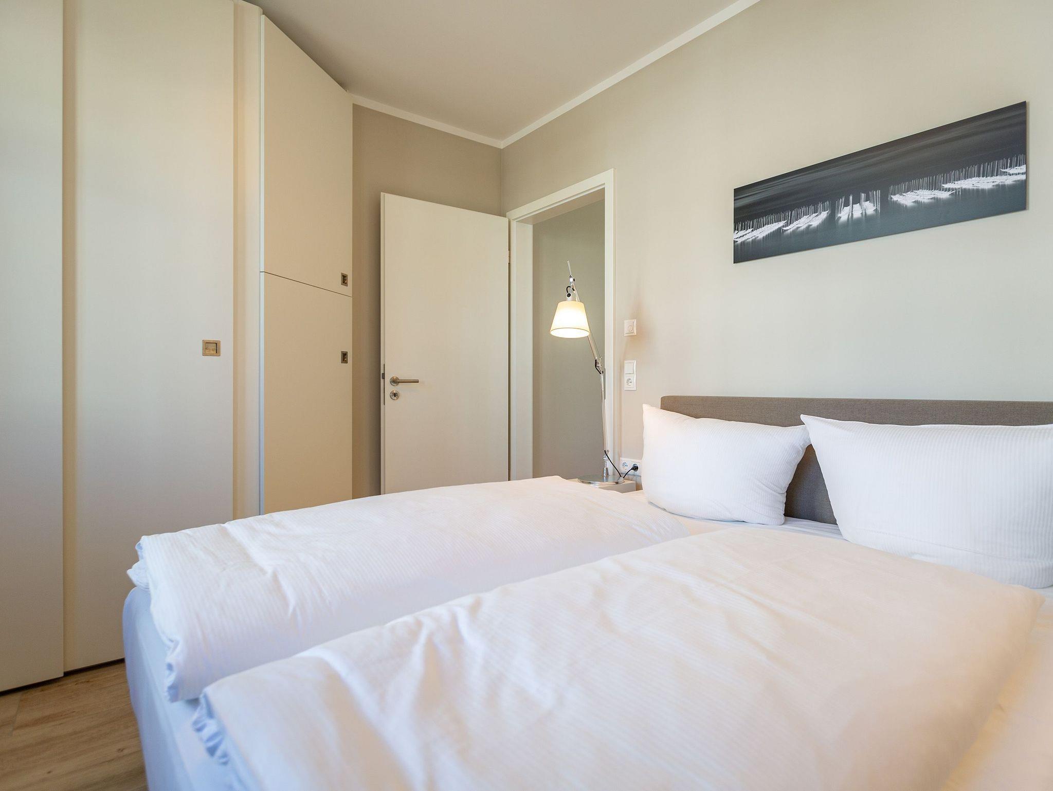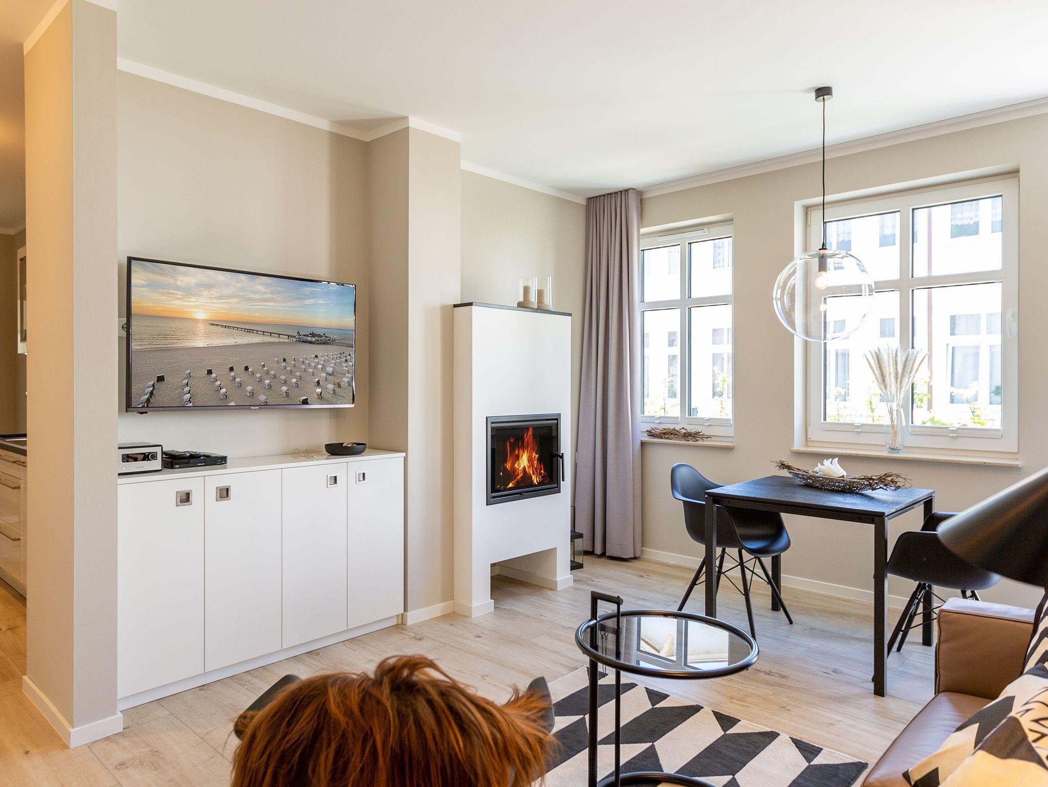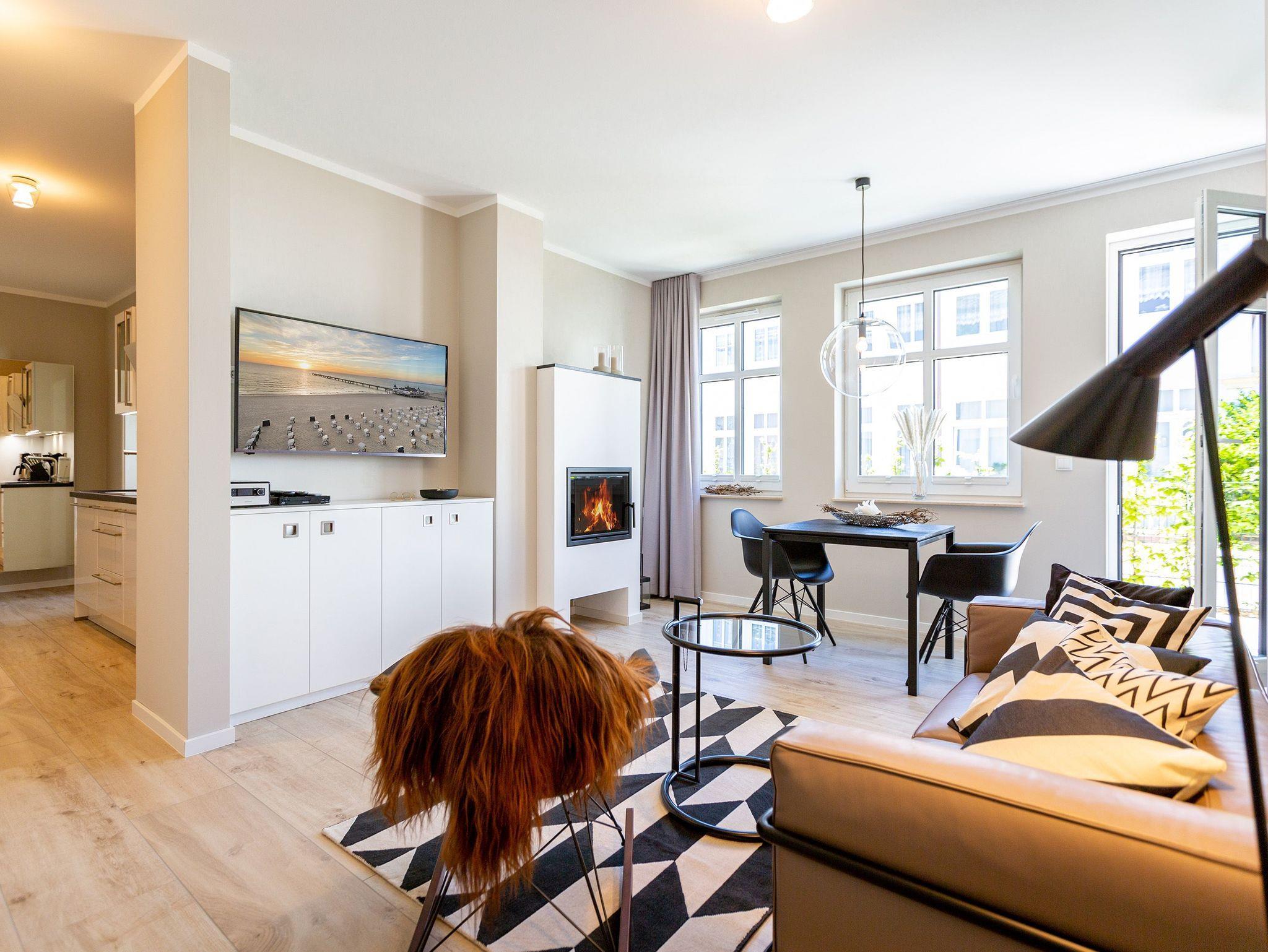 Dieses kleine, aber feine Design-Appartement für zwei Personen mit Kleinkind (im Kinderreisebett) ist das perfekte Erholungsrefugium für alle, die es gern schick, modern und stylisch mögen. Auch Ihren geliebten Vierbeiner dürfen Sie hier mitbringen. Wohlfühlen auf 50 Quadratmetern ist hier garantiert. Da sich das Appartement im Erdgeschoss befindet, hat es Zugang zu einer ? natürlich nur für Sie reservierten und zur Wohnung gehörenden ? Sonnenterasse mit Strandkorb und Gartenmöbeln. Mitten im Grün und umgeben von wunderschönen Bädervillen können Sie hier eine entspannte Zeit beim Essen oder Sonnenbaden genießen. Das Wohnzimmer dieses Zwei-Raum-Appartements ist modern und elegant mit ausgesuchten Design-Möbeln eingerichtet. Die Cassina Couch nach dem berühmten Design von Le Corbusier, aber auch der Schalen-Schaukelstuhl eignen sich perfekt zum Runterkommen und Faulenzen. Ein großer Flat TV (50 Zoll) sorgt für Unterhaltung. An kühlen Inseltagen wärmt der Kaminofen und sorgt für eine gemütliche und romantische Atmosphäre. Die an das Wohnzimmer angrenzende Küche ist mit hochwertigen Markengeräten voll ausgestattet. Ob Qualitätsmesser-Set, Induktionsherd, Senseo Padmaschine, Geschirrspüler oder das Geschirr selbst ? hier werden Sie alles zu Ihrer Zufriedenheit vorfinden. Kochen macht mit diesem Equipment sogar im Urlaub Spaß. Im Wohnzimmer befindet sich zudem ein schöner Essplatz. Im Schlafzimmer wartet viel Gemütlichkeit mit einem bequemen Boxspringdoppelbett (1,60 m x 2,00 m) auf Sie. Viel Platz für die Urlaubsgarderobe bietet der eigens angefertigte Einbauschrank. Das Bad hat Tageslicht und verfügt über eine Regendusche und ein WC. Bei Anreise sind die Betten bezogen und Handtücher liegen für Sie bereit. In der Tiefgarage gehört zu der Wohnung 4a ein Stellplatz. Ein separater Fahrradraum ist im Keller ebenfalls vorhanden.