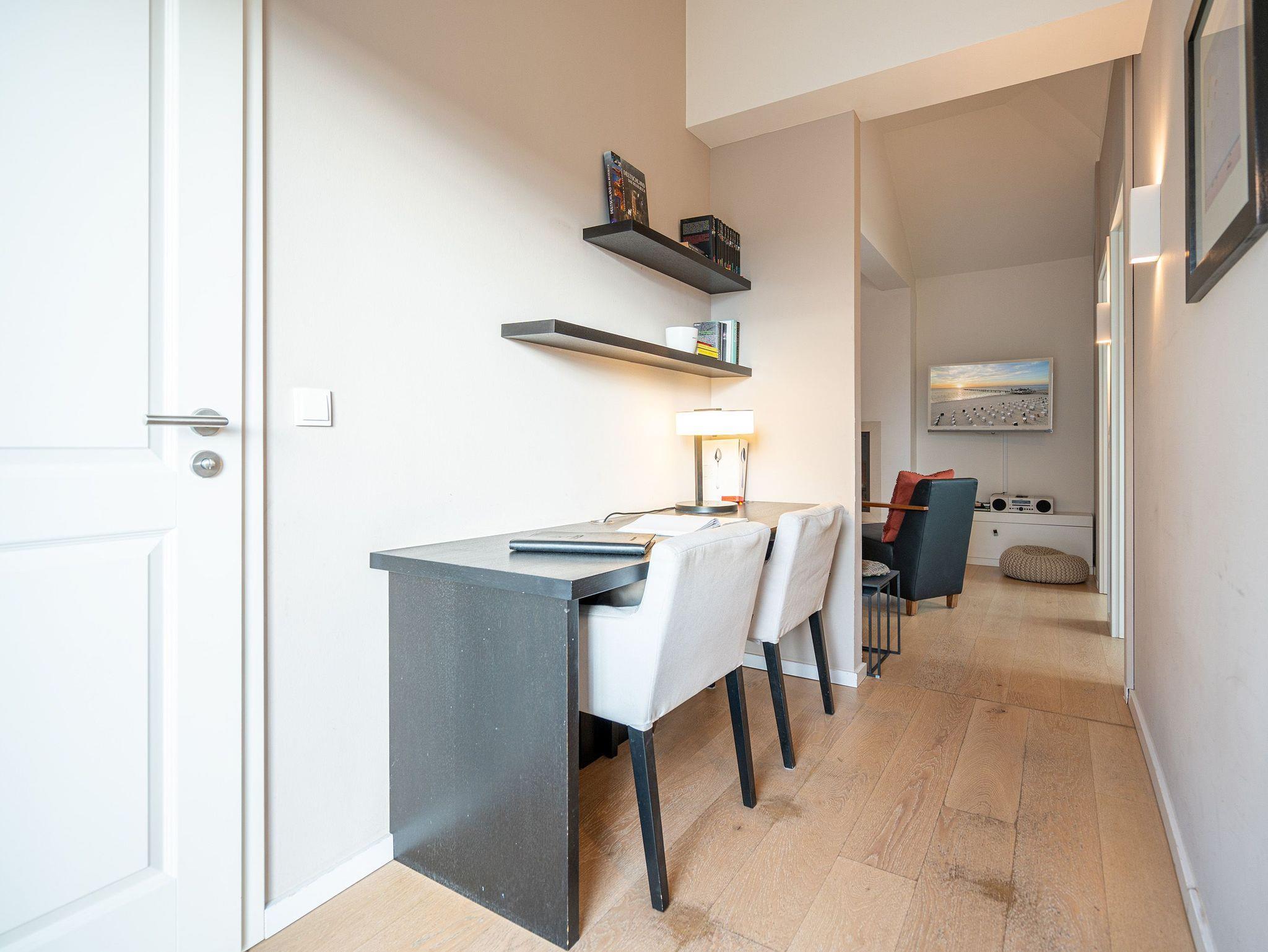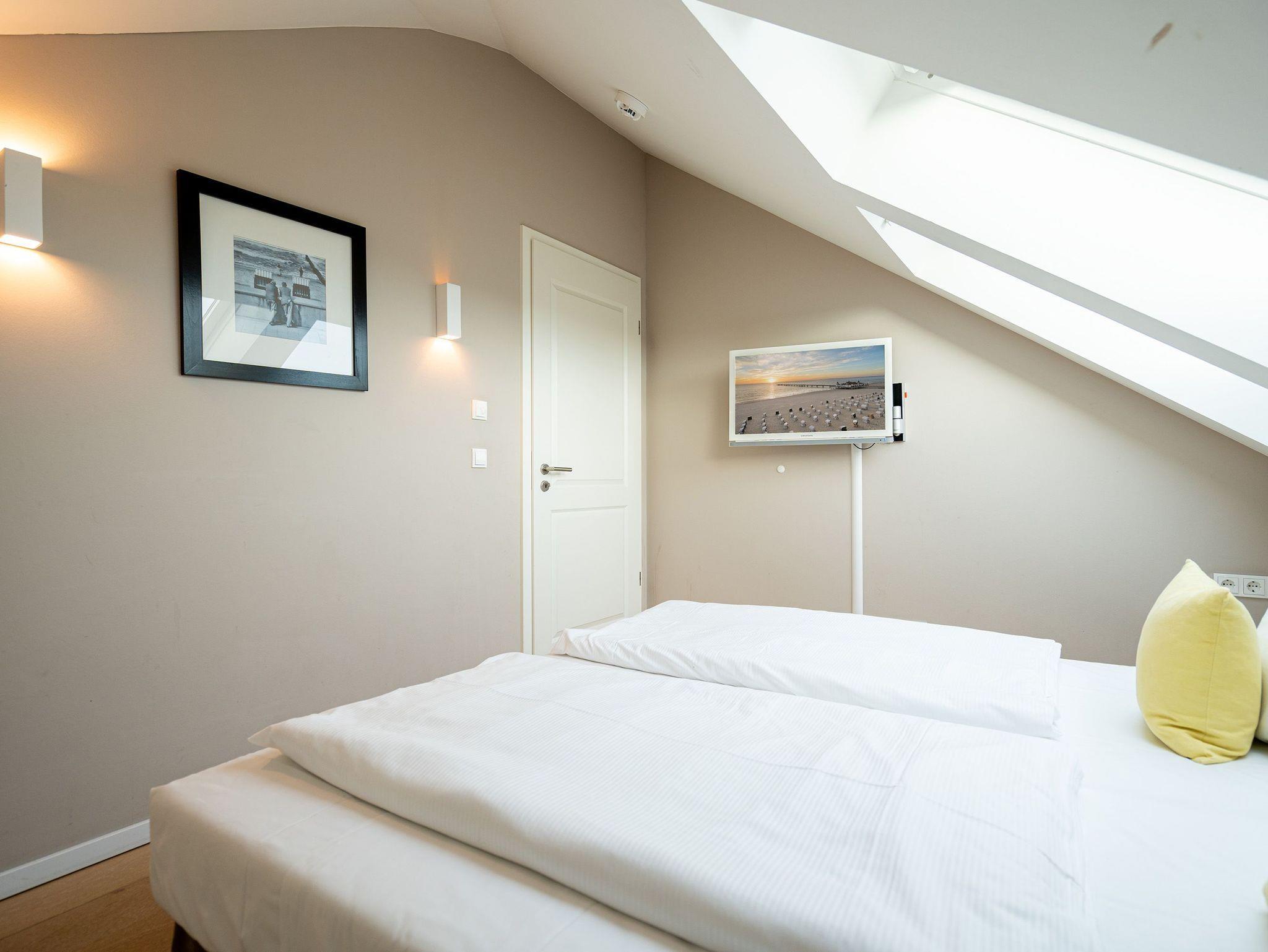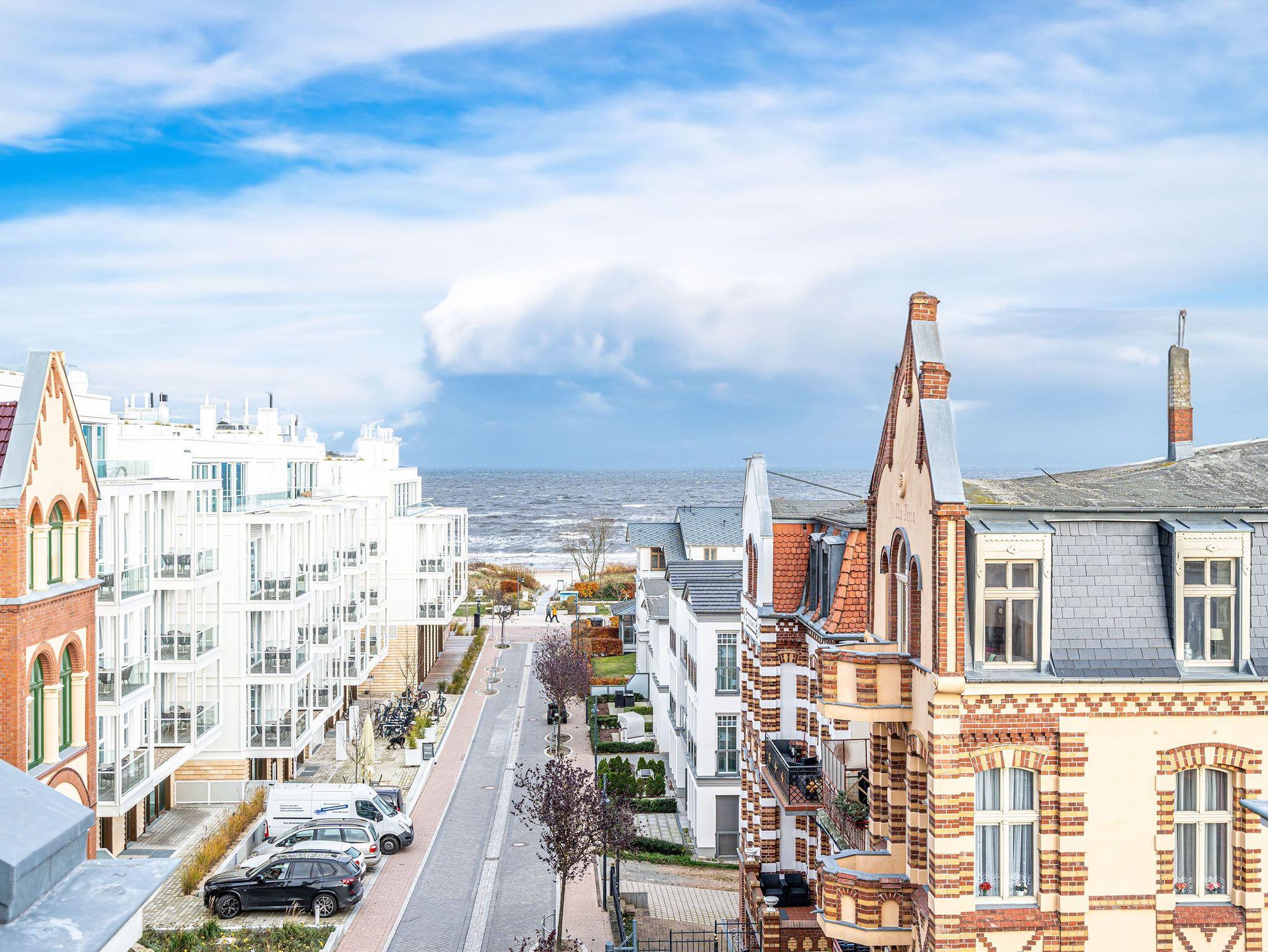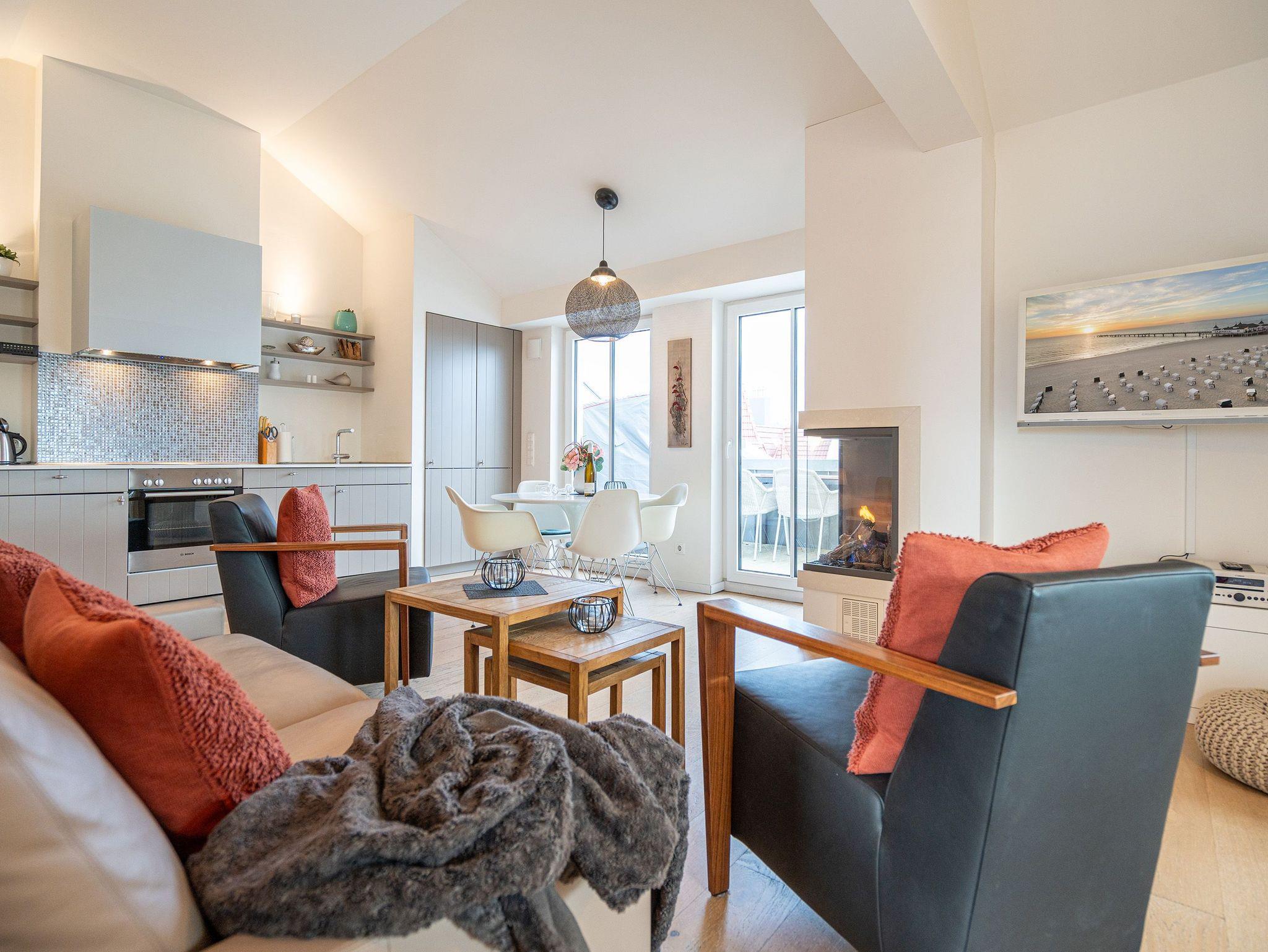 Wohlfühlen maßgeschneidert! Versierte Innenarchitektenhände schufen hier eine charmante 3-Raum-Ferienwohnung (68 qm für max. 4 Personen) unter dem Dach des Dünenpalais. Geschmackvolles Design, perfekte Einbauten und der tolle Meerblick machen diese Wohnung sicher schnell zu Ihrem Lieblingsdomizil. Der stylische Wohnraum mit gemütlichem Sofa und Flat-TV wird durch die komplett ausgestattete Küchenzeile mit Essplatz ergänzt. Der per Fernbedienung zu benutzende Gaskamin sorgt zusätzlich für heimelige Stunden. Zwei Schlafzimmer mit Doppelbetten (1,80m) und schönen Einbauten ( 1x mit eigenem Flat-TV) sorgen für ruhige Nächte. Zum Emails checken oder zum entspannten Lesen empfiehlt sich der Schreibtisch, der in einem kleinen Extra-Bereich gestaltet wurde. Von hier aus hat man auch Zugang zum schönen Bad mit Dusche, WC und der dort integrierten Sauna und zum kleinen, sonnigen Südbalkon. Der größere Balkon mit Strandkorb ist zur Meerseite ausgerichtet. Neben einem tollen Blick auf die Ostsee, ist dies der ideale Platz für ein Frühstück in der Morgensonne. Für Ihren Komfort sind die Betten bei der Anreise bezogen und Handtücher liegen bereit. Ein Pkw-Stellplatz ( Nr.13) steht in der Tiefgarage zur Verfügung. Das WLAN-Netz kann kostenfrei genutzt werden.