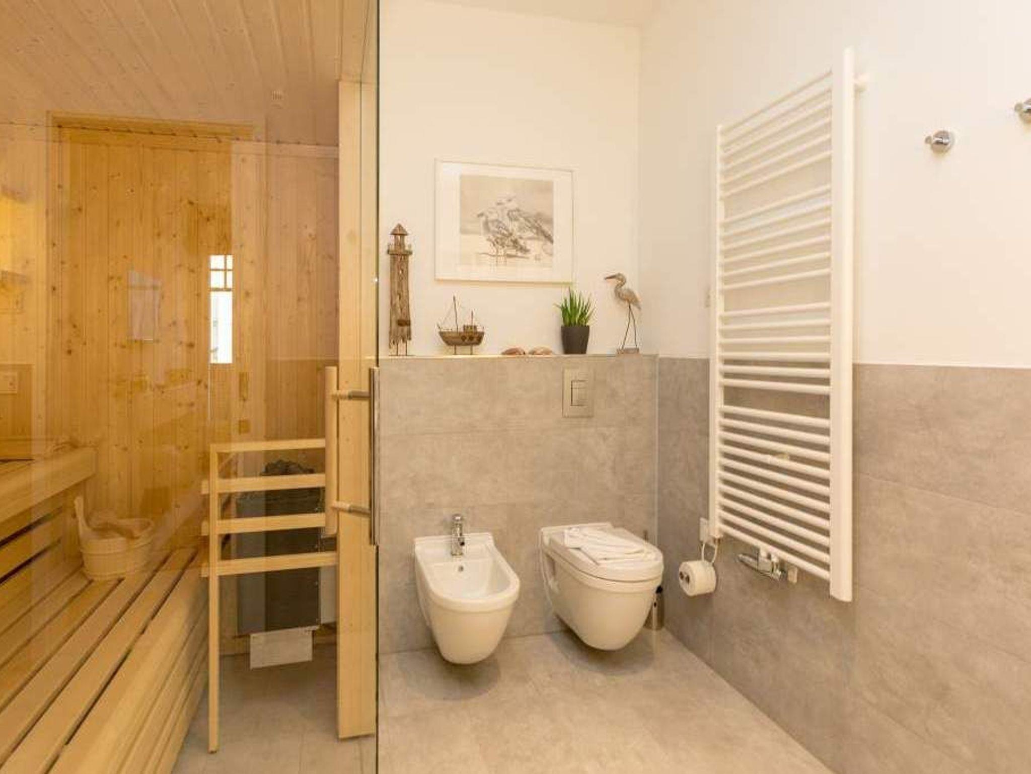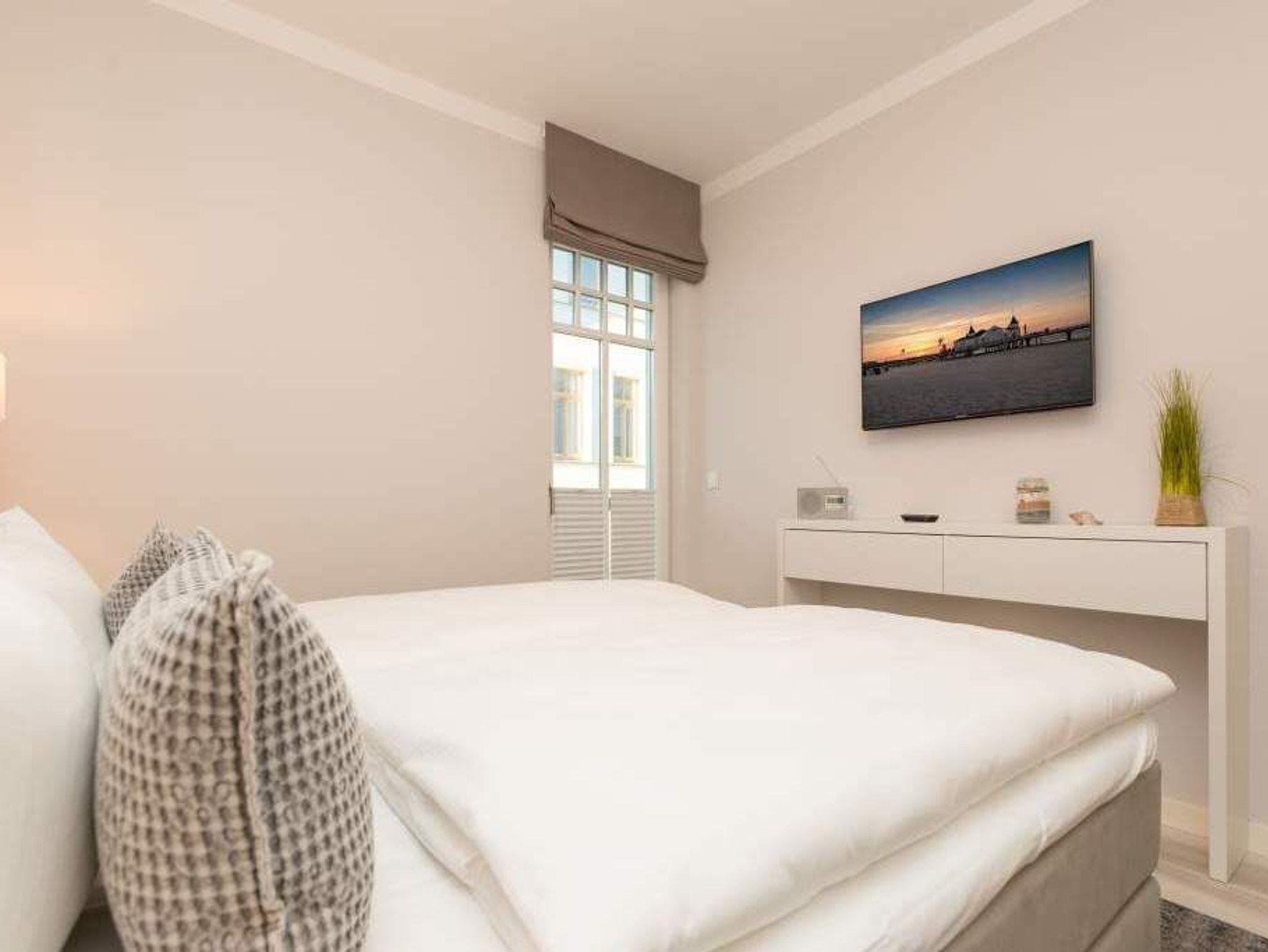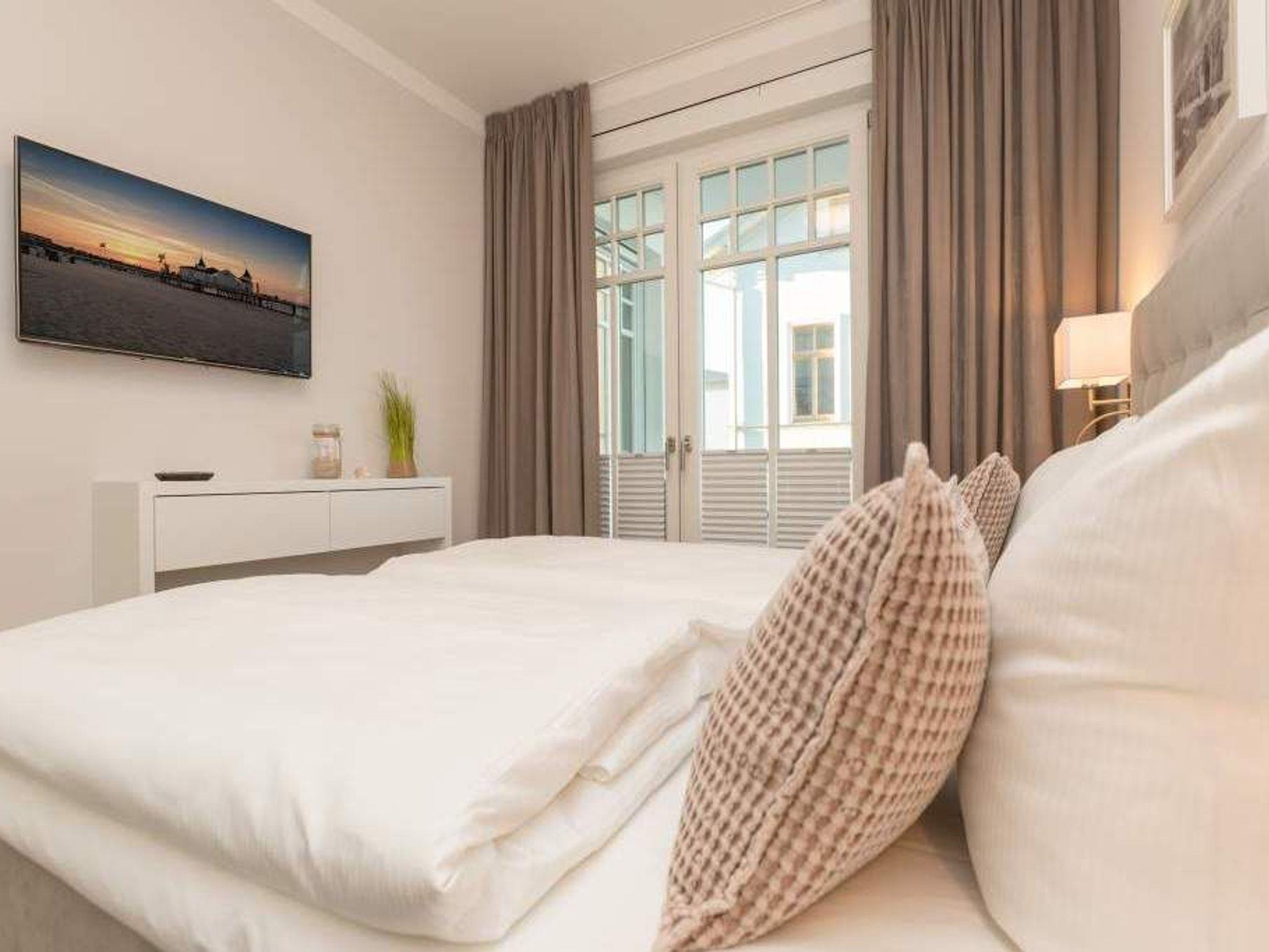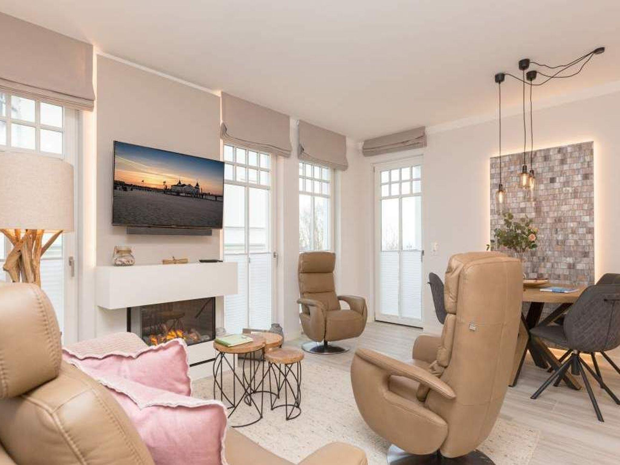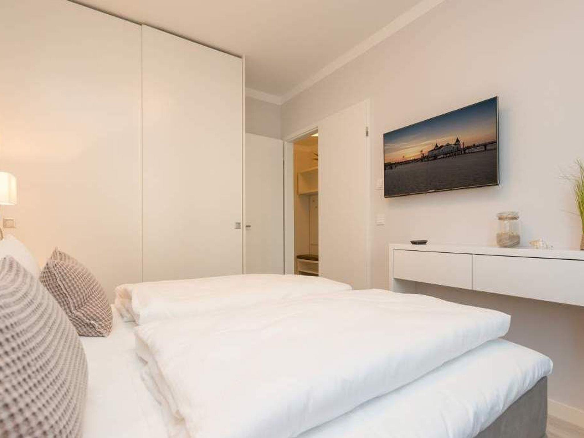 Stellen Sie sich vor, die Ostsee rauscht in sanften Wellen an den Strand. Keine 50 Meter von Ihrem Frühstückstisch auf dem Balkon entfernt. Stellen Sie sich vor, Sie schauen über den Rand Ihrer Kaffeetasse mitten hinein in die beruhigende Weite des endlosen Blaus. Urlaubsgefühl pur macht breit. Abschalten und sich einfach fallen lassen können ? auf die bequemen Relaxsessel vor dem Kamin Ihres 77 Quadratmeter großen und geräumigen Urlaubsparadieses. Nehmen Sie Ihre Freunde oder die Familie mit. Denn in dem 3-Zimmer-Appartement im 1. Obergeschoss der Villa Westend haben vier Personen Platz zum Aus- und Entspannen. Das Wohn-Ess-Zimmer ist mit einem schönen Esstisch und einer kuscheligen Sitzgruppe eingerichtet, dessen Sofa durch ausfahrbare Fußteile noch gemütlicher werden kann. Vom Wohnzimmer aus geht es auf einen kleinen Balkon mit seitlichem Blick auf die Ostsee. Elektrokamin mit Fernbedienung, Flat-TV und eine voll ausgestattete Küche lassen keine Urlaubswünsche offen. Durch die großen, bodentiefen Fenster fällt viel Sonnenlicht in das Appartement. Wie schön, dass Usedom damit reich gesegnet ist. Luftig und offen wirkt der Wohnraum zudem durch die Spiegel der Küchenrückwand. Auch das Schlafen wird zum Genuss. Die beiden Schlafzimmer verfügen über jeweils ein großes Boxspringdoppelbett (einmal 1,80 m x 2,00m sowie 1,80 m x 2,10 m) und Flat-TV. Kleiderschränke und Kommoden bieten reichlich Platz zur Ablage. Die zwei Bäder der Wohnung sind mit Dusche, WC und Waschtisch ausgestattet. Das Masterbad besitzt zudem ein Bidet und ein ganz besonderes Highlight: eine Finnische Sauna. Für Ihren sorgenfreien Urlaub liegen Handtücher bereit und die Betten sind frisch bezogen. Ein Pkw-Stellplatz steht in der Tiefgarage (Stellplatz Nummer 18) zur Verfügung. Sie wollen Ihr Urlaubsparadies auch mal verlassen, um den feinen, weißen Strandsand zu genießen? Kein Problem.