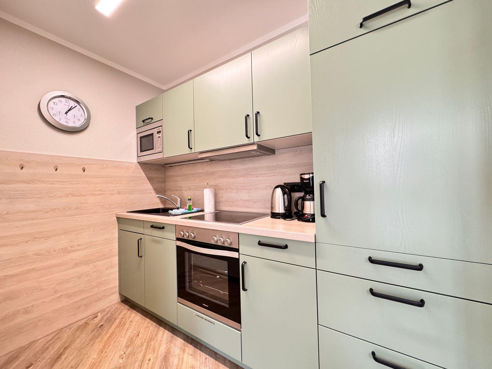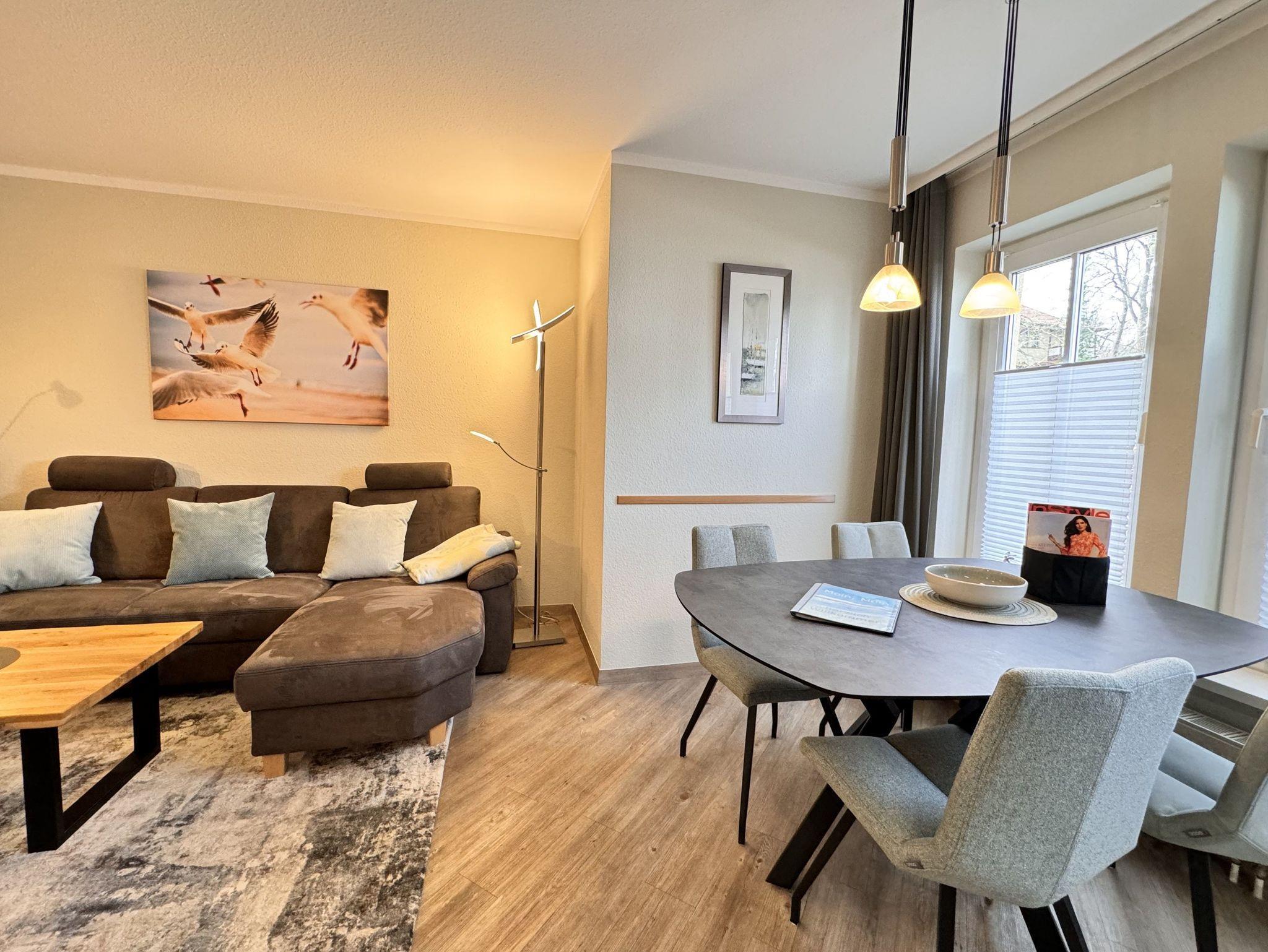 Die 49 qm große 2-Raum-Ferienwohnung befindet sich im Erdgeschoss (Westlage) der Appartementanlage und ist für 2 Personen und ein Kleinkind ausgestattet. Die Wohnung verfügt über ein Wohnzimmer mit Sofa, einen bequemen Fernsehsessel sowie einen Esstisch mit 4 Stühlen. Für die Unterhaltung sorgt ein Flachbild-TV und Stereo-Anlage. Die vollständig ausgestattete Küchenzeile mit Ceranherd, Backofen, Mikrowelle, Kühlschrank mit Gefrierfach und Spülmaschine lässt keine Wünsche offen. Im Schlafzimmer befinden sich ein Doppelbett und ein zweiter Flachbild-TV. Das Bad ist mit bodengleicher Dusche, WC und Haarfön ausgestattet. Eine Terrasse lädt zum Sitzen und Verweilen ein. Ein Kinderbett mit Wäsche sowie ein Hochstuhl können auf Anfrage gegen eine Gebühr von einmalig 50 € vom Verwalter zur Verfügung gestellt werden. In der Zeit vom 15.04. bis 15.10. steht ein Strandkorb am Strand zur Nutzung zur Verfügung.