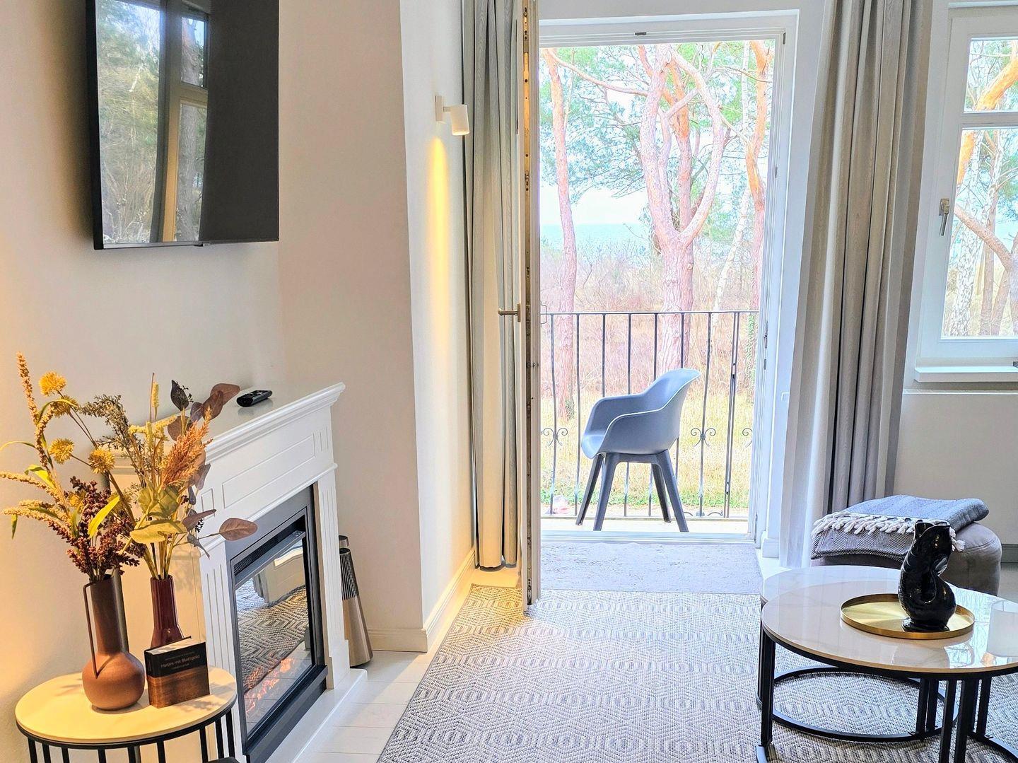Die Ostsee kann man durch die wunderschönen, pinienartigen Strandkiefern hindurch glitzern sehen und der Blick vom Balkon auf die Promenade ist immer interessant.