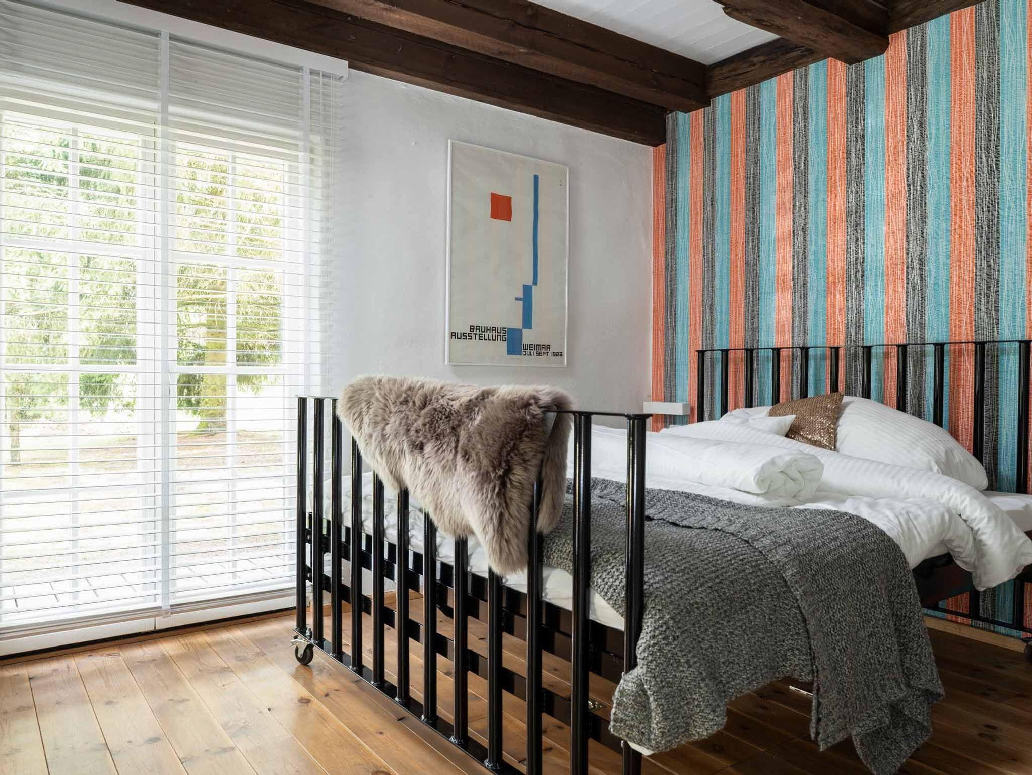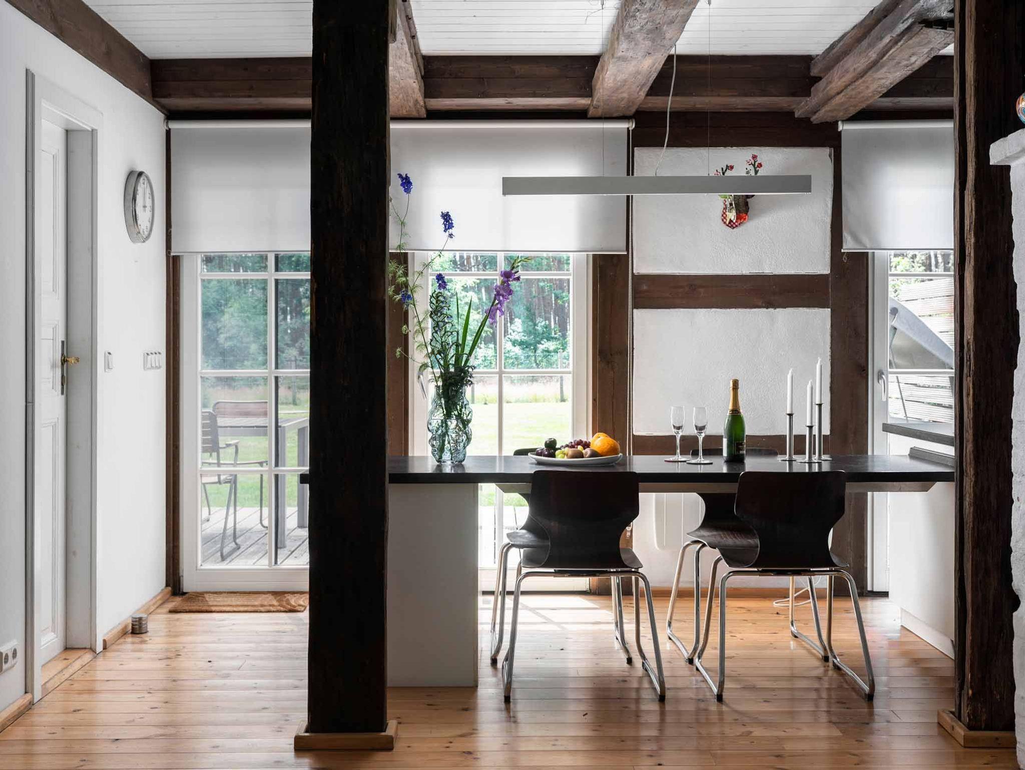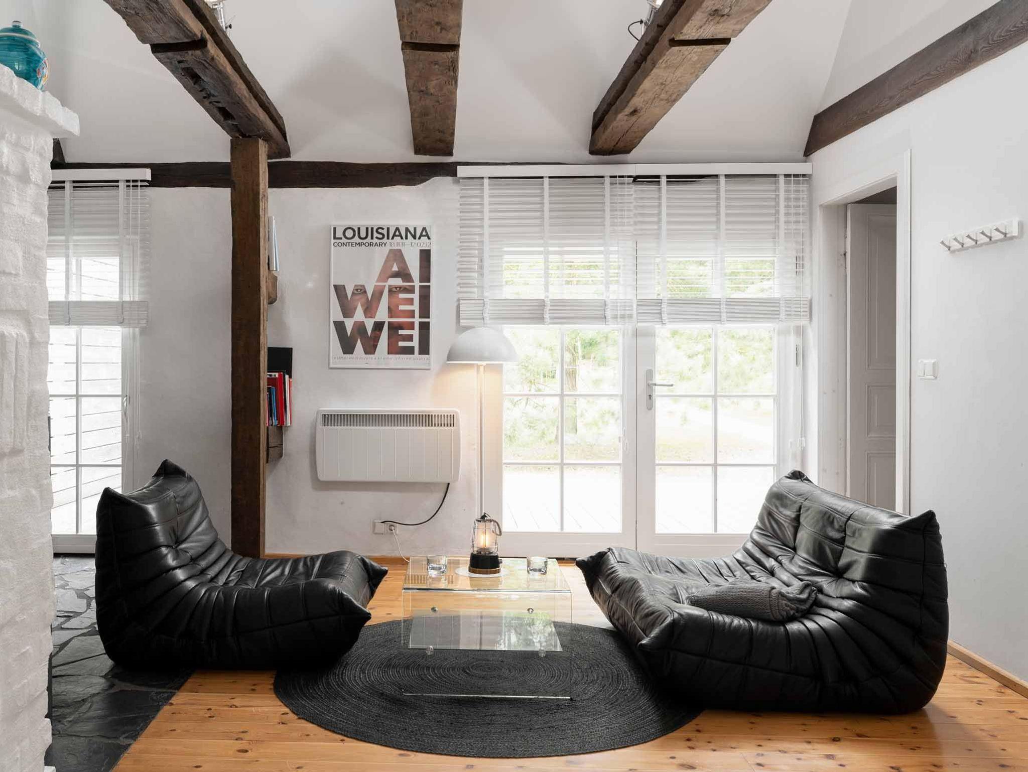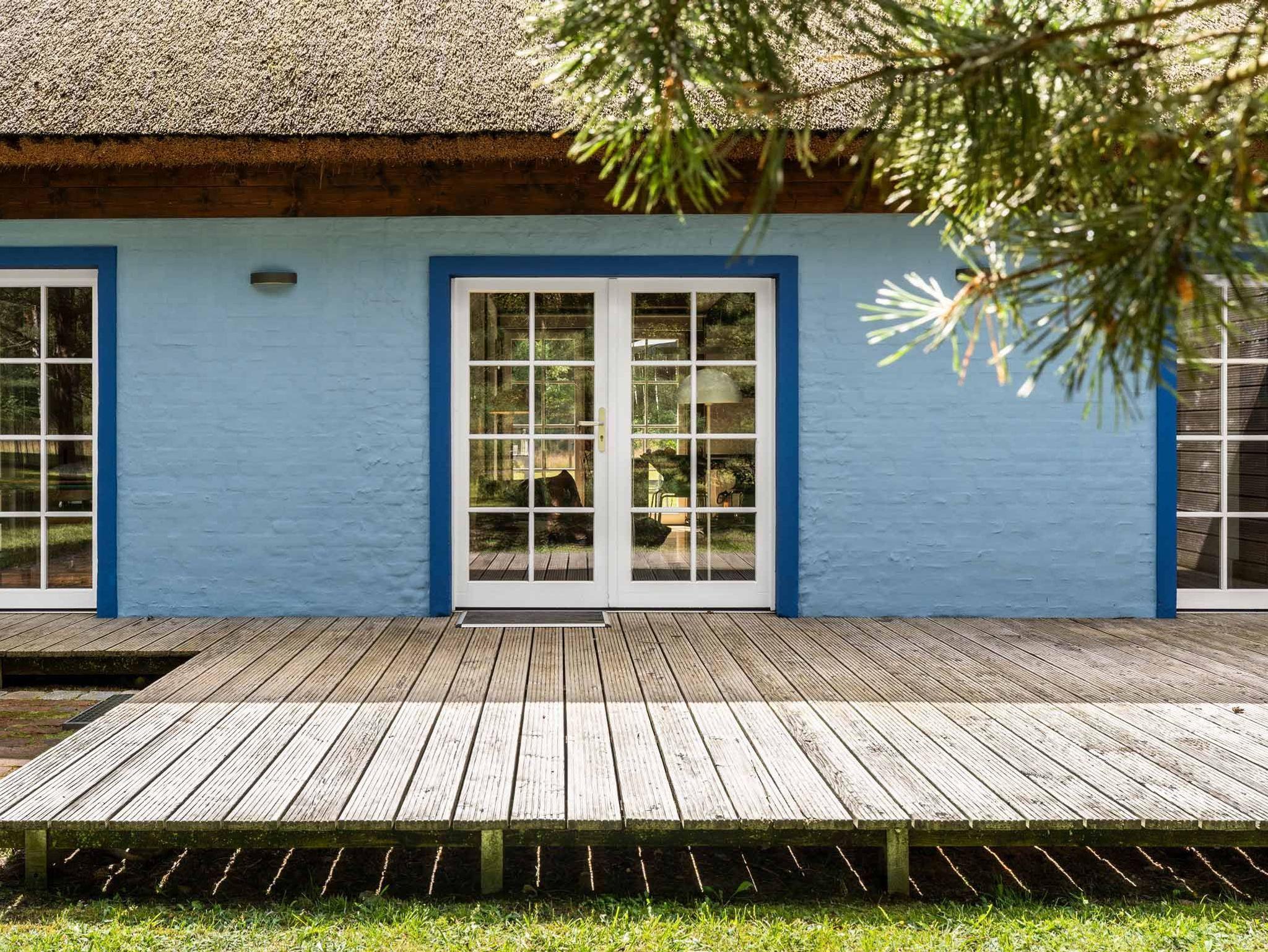 Das reetgedeckte Kolonistenhaus aus dem 18. Jahrhundert wurde 2013 aufwendig umgestaltet und modernisiert. Dabei lag der Fokus darauf, die markantesten historischen Elemente des Hauses zu erhalten und Ihnen moderne, zeitgenössische Ausstattungselemente gegenüberzustellen. In der Folge entstand durch das Freilegen der originalen Fachwerkbalken im Inneren ein großzügiger, luftiger und lichtdurchfluteter Wohnraum mit offener Galerie, in dessen Mitte der robust gemauerte Schornstein wie ein Monolith den Raum dominiert. Auf hellen Holzdielen sind nun mit vielen anderen liebevollen Details Möbelklassiker der früher 70er Jahre eingezogen, welche den modernen Stil des Hauses und gleichzeitig den Kontrast zu den historischen Stilelementen unterstreichen. Im vorderen Teil des Wohnraums empfängt Sie heute ein stylisches Sofa Set der Firma Ligne Roset mit Kamin und TV, im hinteren Bereich die offene, moderne Designerküche mit praktischer Kochinsel und langgezogenem Esstisch. Seitlich schließen sich eines der beiden Schlafzimmer mit gemütlichem Doppelbett und ein großzügiges Bad mit Wanne, Dusche und WC an. Sämtliche Fenster im Erdgeschoß sind bodentief und bilden Ausgänge auf die das Haus umgebende, weitläufige Holzterrasse. Die maßgeschneiderte Einbautreppe - geschickt hinter der Kücheneinbauwand versteckt - führt schließlich ins luftige Obergeschoss, welches hinter dem Bereich der offenen Galerie ein weiteres abgeschlossenes Schlafzimmer bietet.