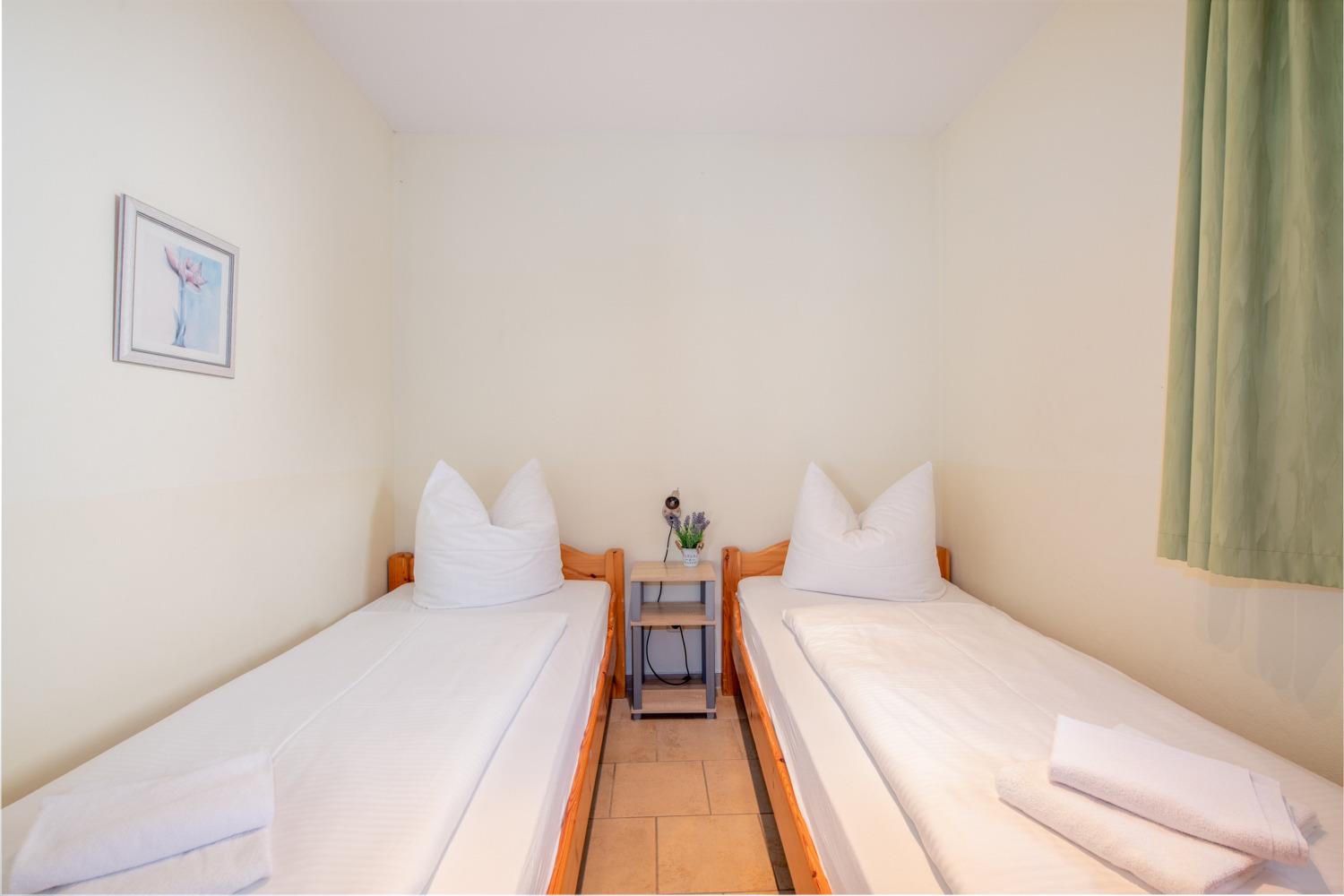 Wohnkomfort: Zwei Schlafzimmer – eines mit Doppelbett, eines mit zwei Einzelbetten – und ein großzügiger Wohnraum mit moderner Küchenzeile und Essbereich.