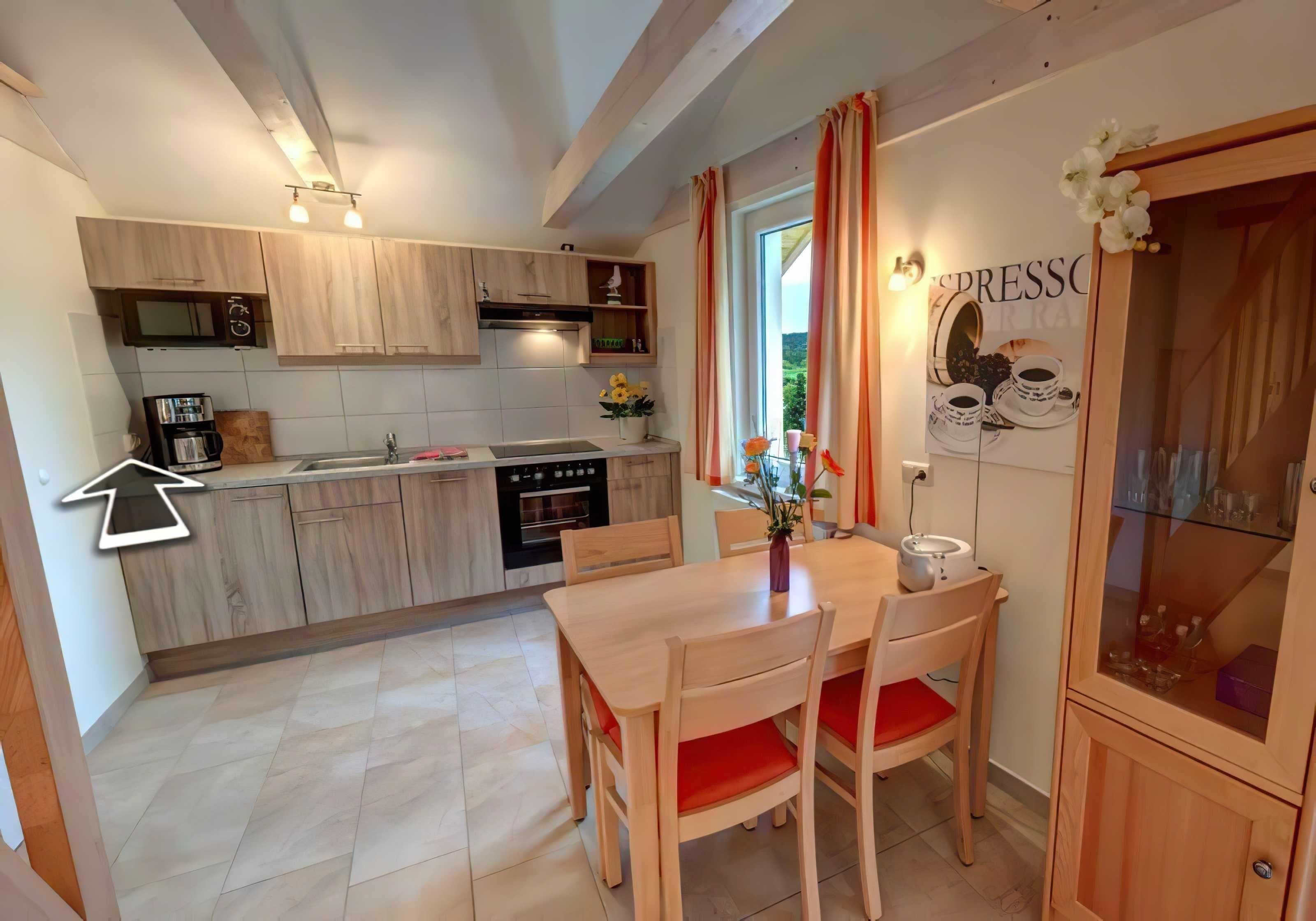 Obergeschoss 54 m² (4 Personen) Zur Ausstattung im Obergeschoss gehören 1 Schlafzimmer mit Doppeltbetten und ein Schlafzimmer mit 2 Einzelbetten. Das Schlafzimmer mit den beiden Einzelbetten befindet sich im Dachboden der Ferienwohnung und ist über eine Holztreppe erreichbar. Zur weiteren Ausstattung gehören ein Wohnzimmer mit integrierter vollausgestatteter Küche (Geschirrspüler, Ceranherd mit Backofen, Mikrowelle, Kaffeemaschine) einem Bad mit Dusche/WC und einen Balkon.