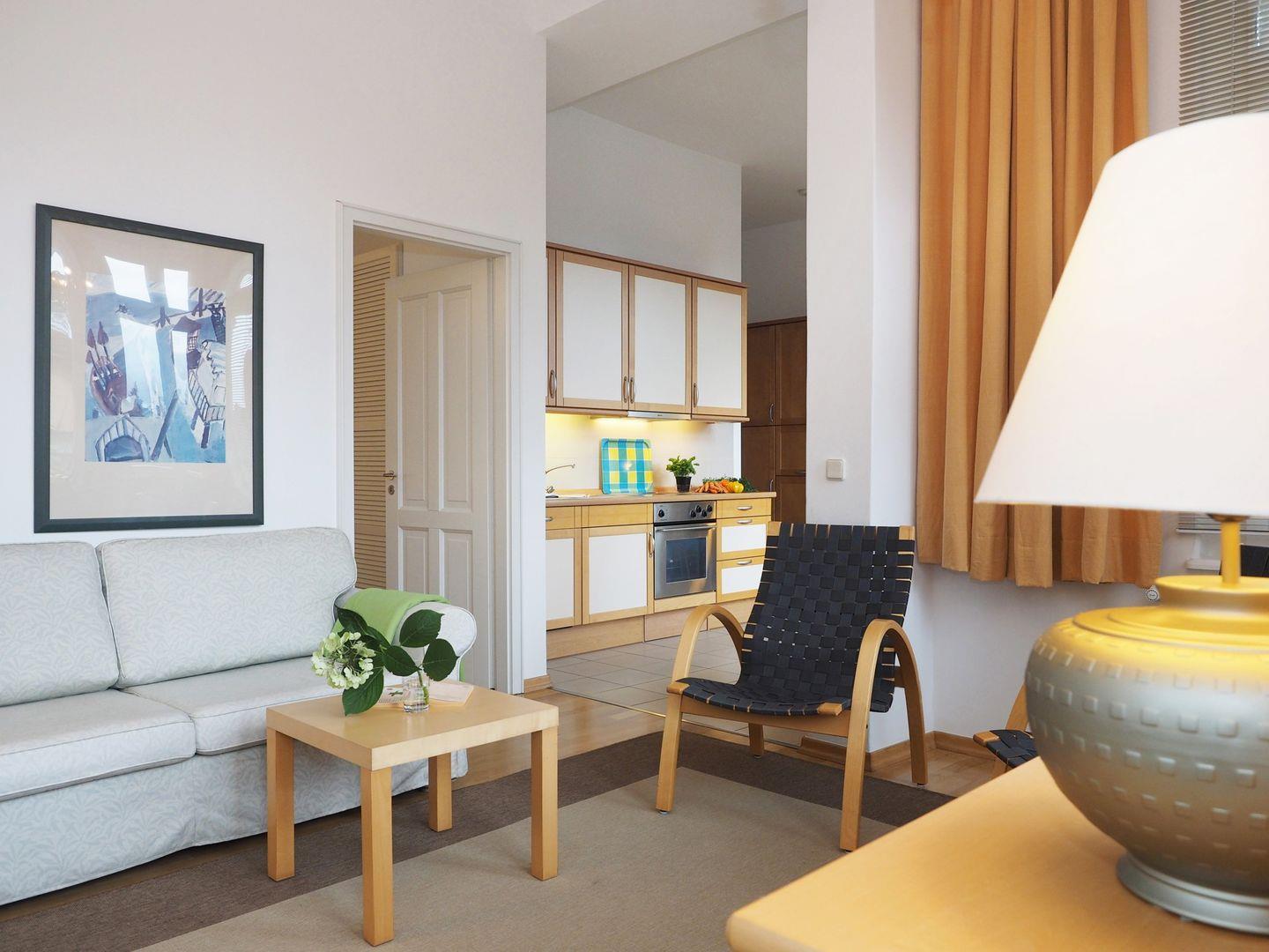 Genießen Sie sonnige Stunden auf dem großen Balkon in Süd-Ost-Lage, während Sie das Meeresrauschen im Hintergrund vernehmen. Das Wohnzimmer verfügt über eine Veranda und eine komfortable Doppel-Schlafcouch ( 140 x 200 cm ) für zusätzliche Schlafmöglichkeiten.