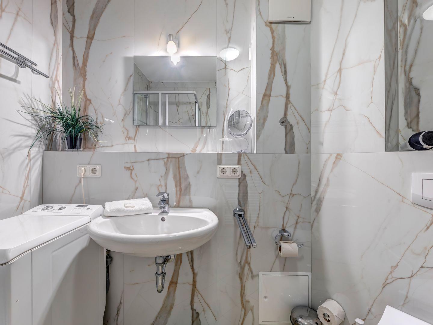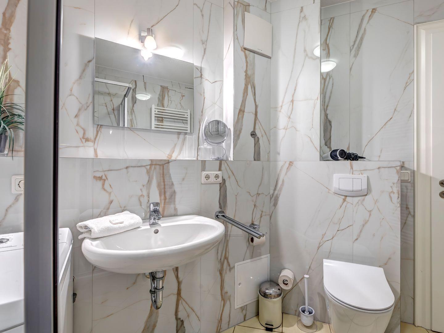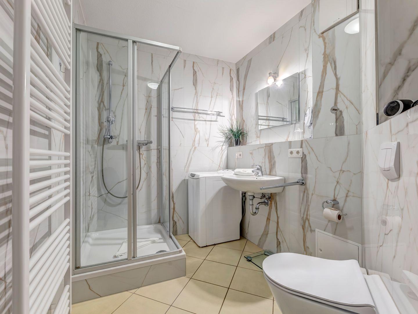 - Ein modernes Badezimmer mit Dusche, das Ihre Bedürfnisse perfekt erfüllt.
