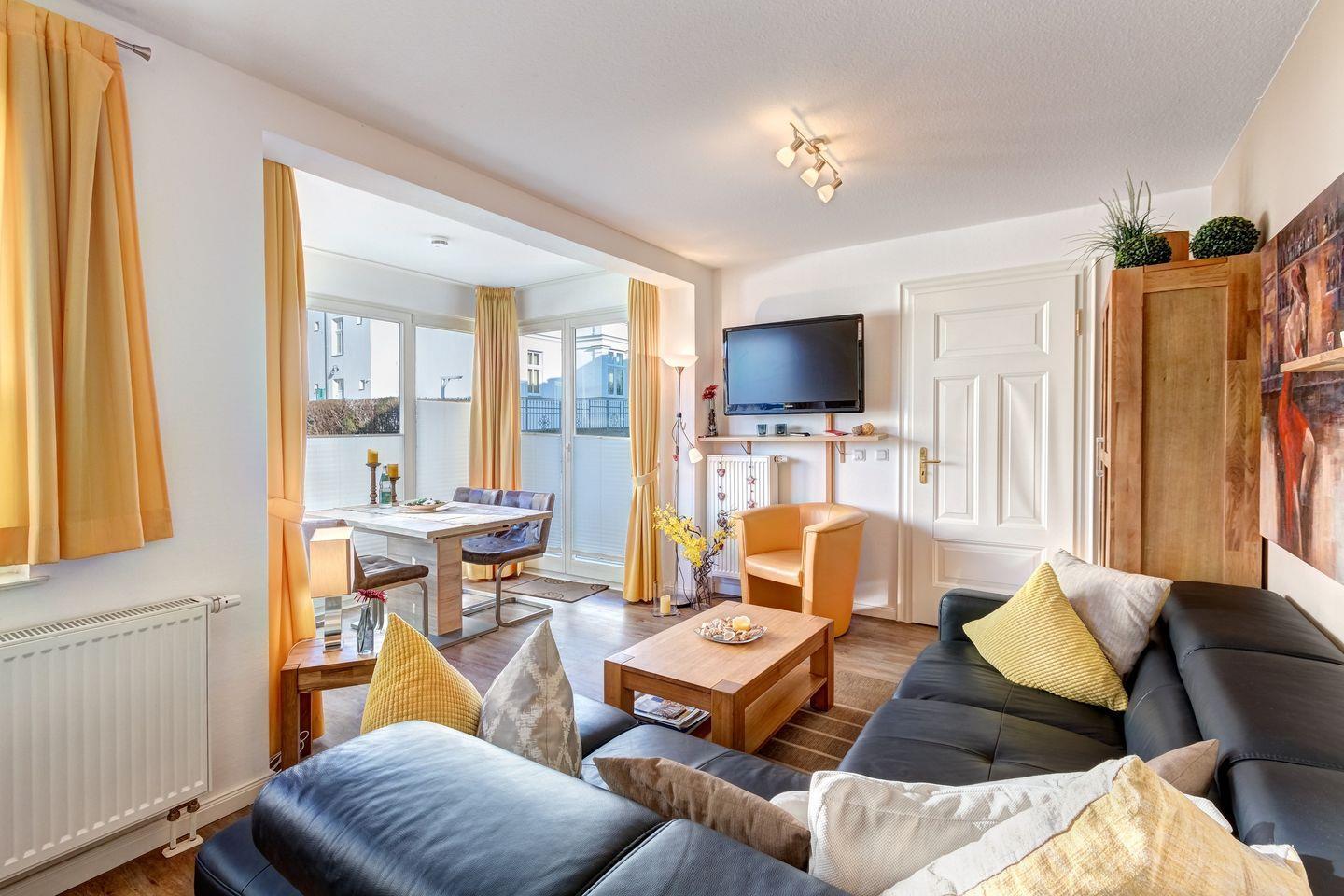 - Wohnzimmer mit gemütlicher Sitzecke und einer voll ausgestatteten Küchenzeile, die unter anderem mit einem Geschirrspüler für Ihren Komfort ausgestattet ist.