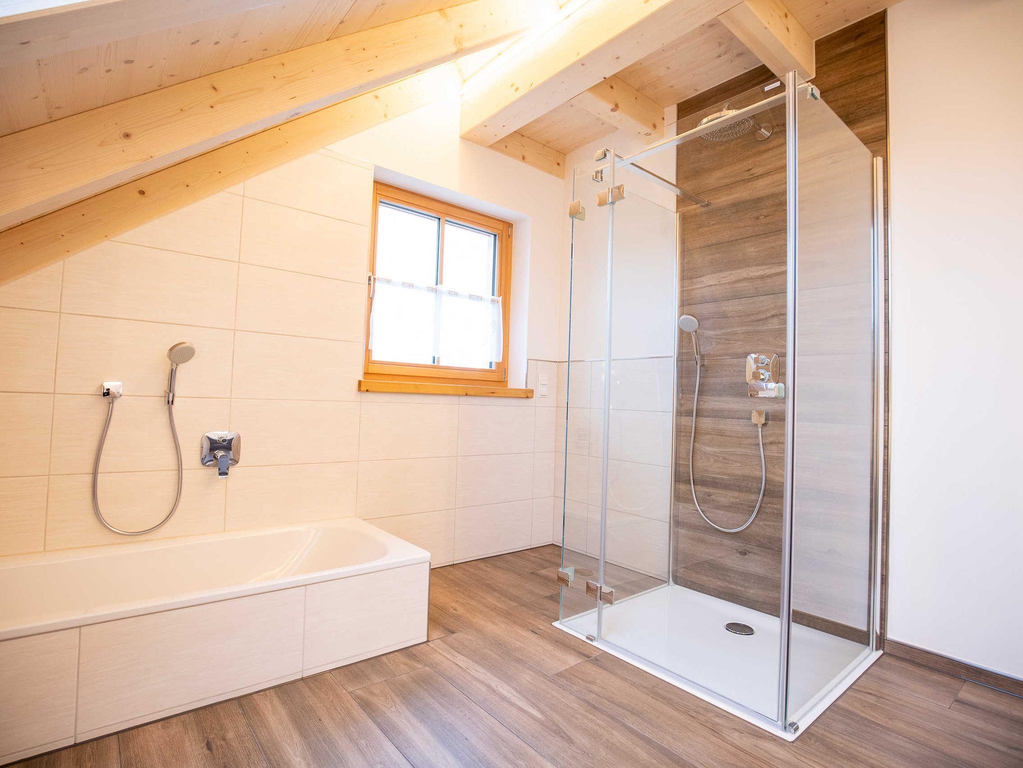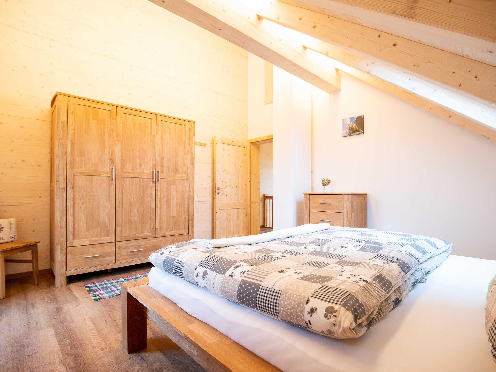 Im Obergeschoss befinden sich zwei Schlafzimmer mit Doppelbett und ein Schlafzimmer mit 2 Einzelbetten sowie ein großes Bad mit Wanne, Dusche und WC.