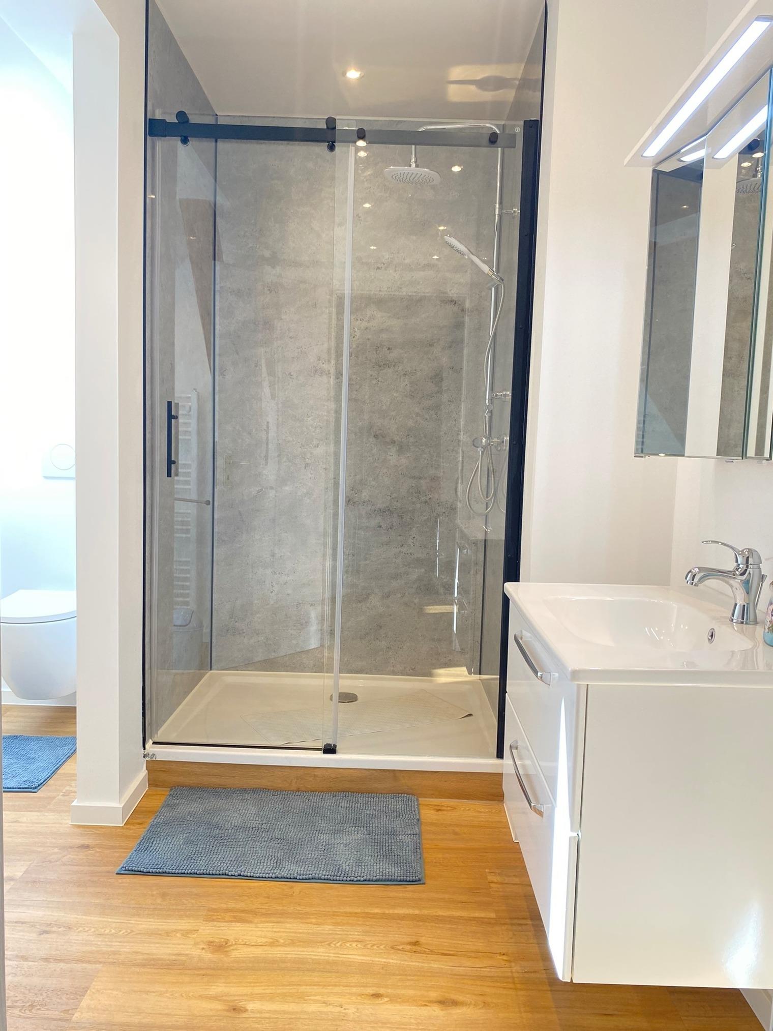 Die Wohnung erreicht man über eine separate Außentreppe auf der Rückseite des Hauses. Dort befindet sich außerdem eine Terrasse mit Gartenmöbeln und einer Grillmöglichkeit.