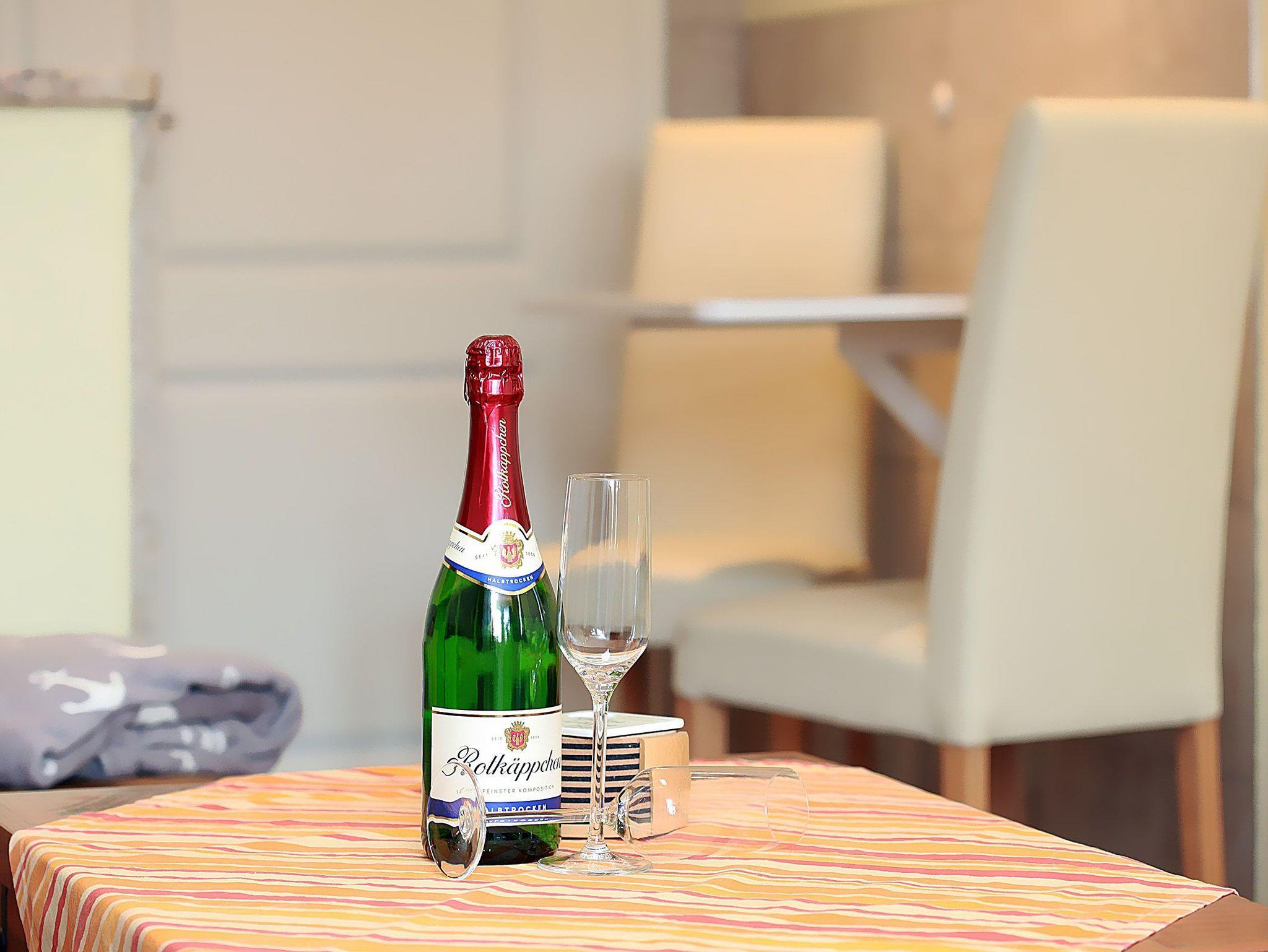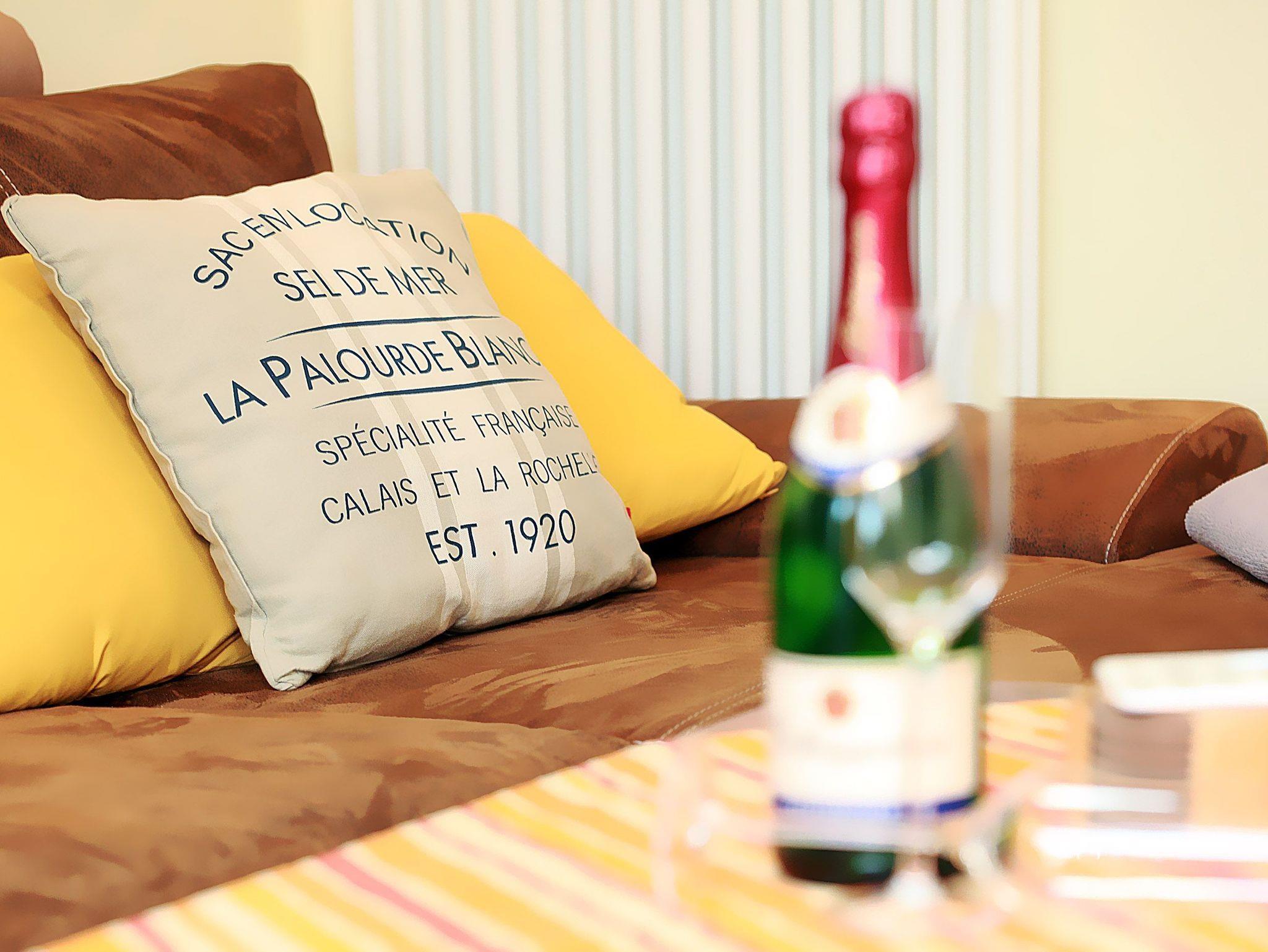 Im liebevoll eingetrichterten Schlafzimmer befindet sich ein Doppelbett 1,60 x 2,00 m. Die Bettwäsche ist inklusive und die Handtücher können Sie gegen eine Gebühr von 8,00 € pro Set dazu buchen.