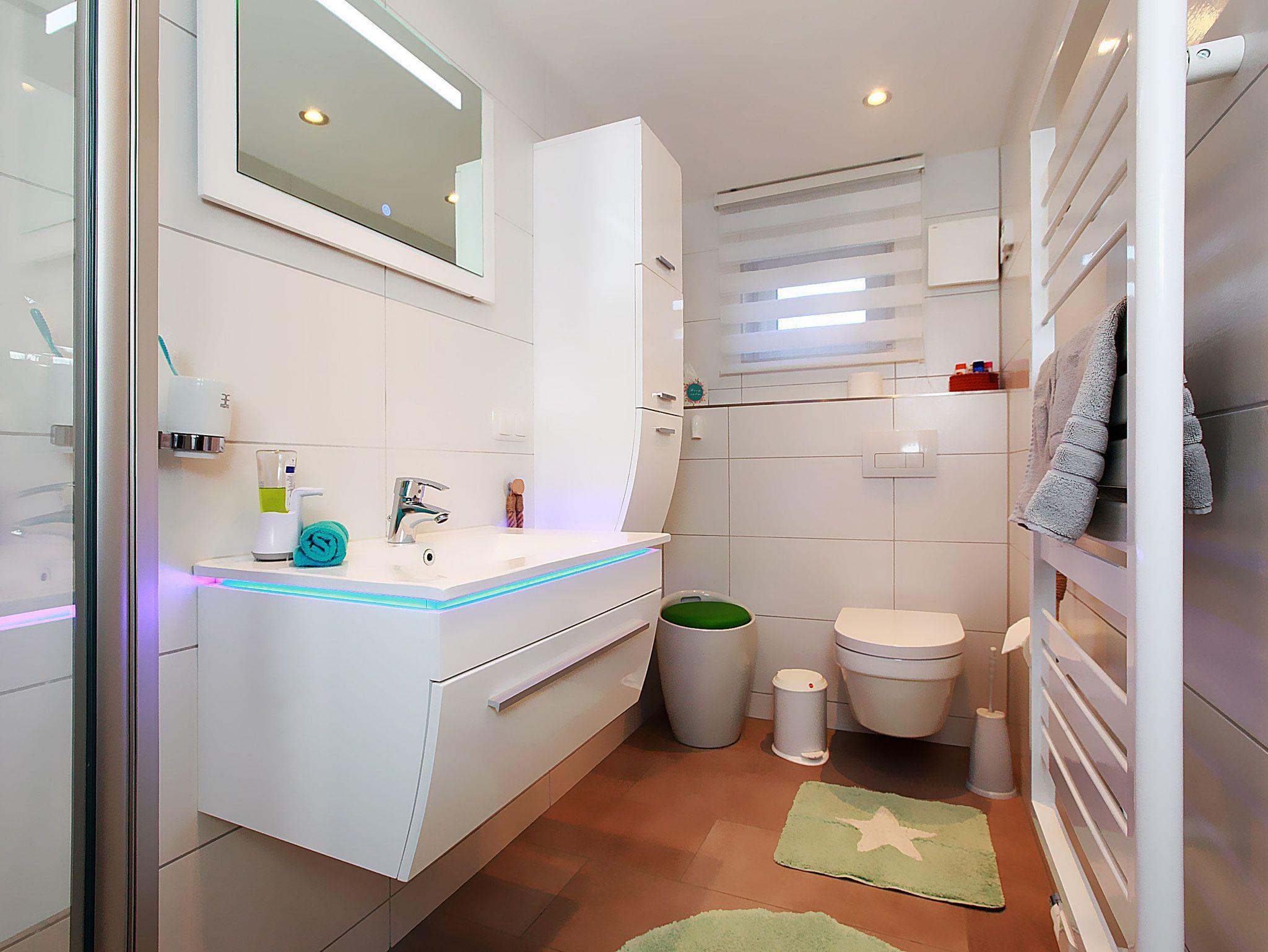 Das Badezimmer mit Dusche und WC ausgestattet.