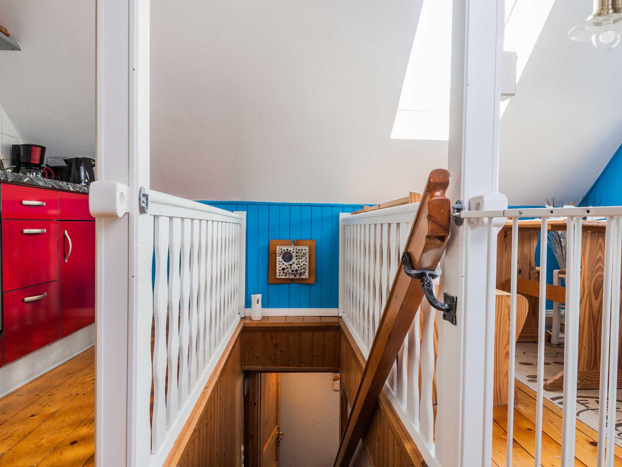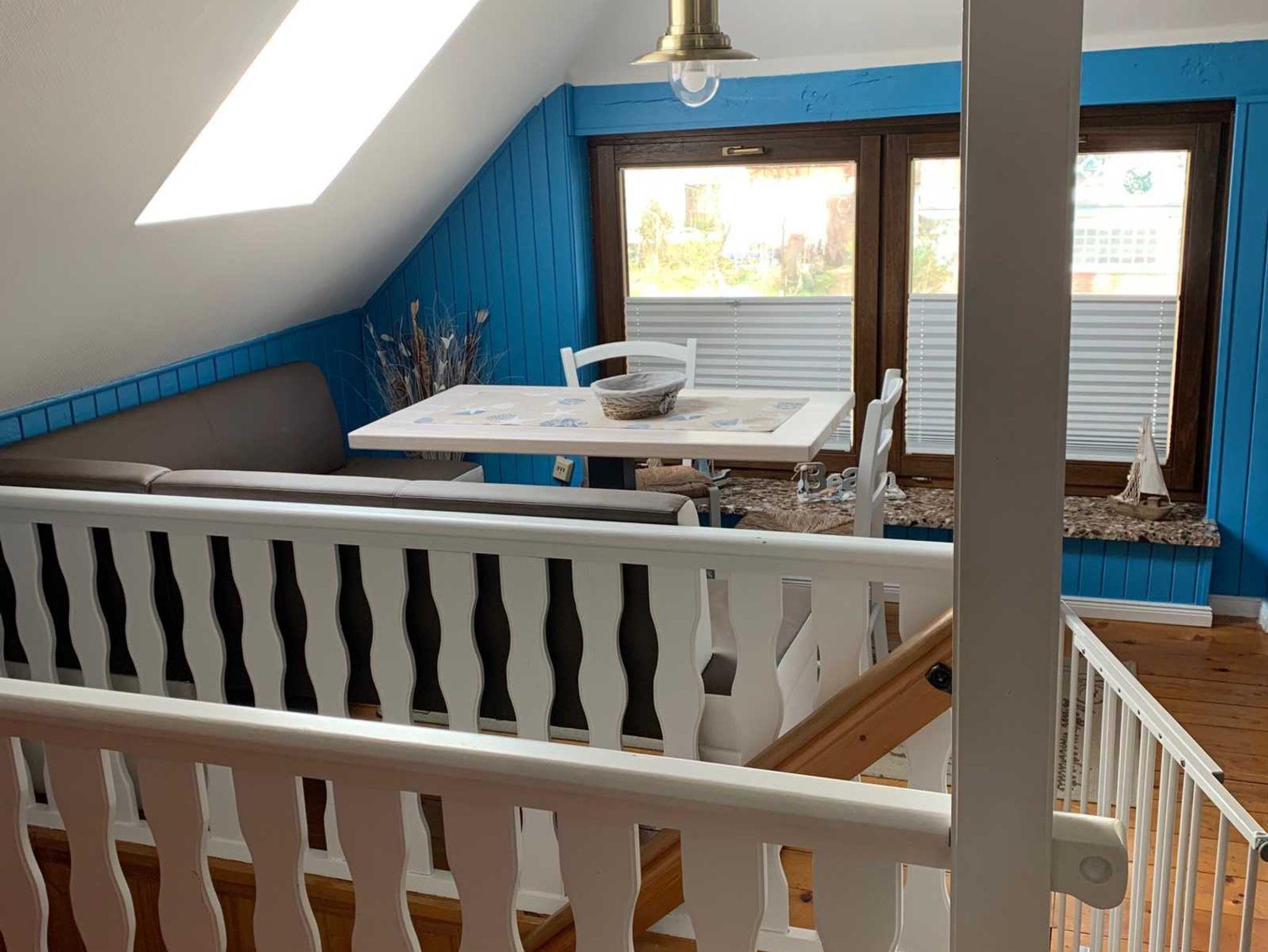 Die lichtdurchflutete offen gestaltete Dachgeschoss-Wohnung ist gemütlich eingerichtet, so dass Sie sich vom ersten Urlaubstag an wohlfühlen können. Hier gibt es ein Schlafzimmer mit Doppelbett und einer Schlafnische für ein kleineres Kind (max. 6 Jahre). Der Wohnbereich ist mit einer Schlafcouch und einer offenen Küche mit Essecke ausgestattet. Das Badezimmer verfügt über eine Dusche. Auch zu dieser Wohnung gehört eine Terrasse.