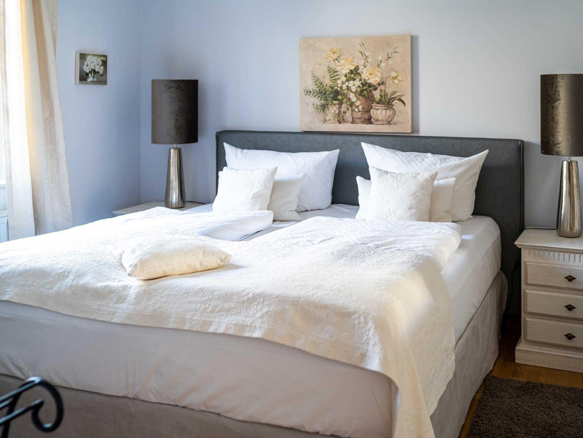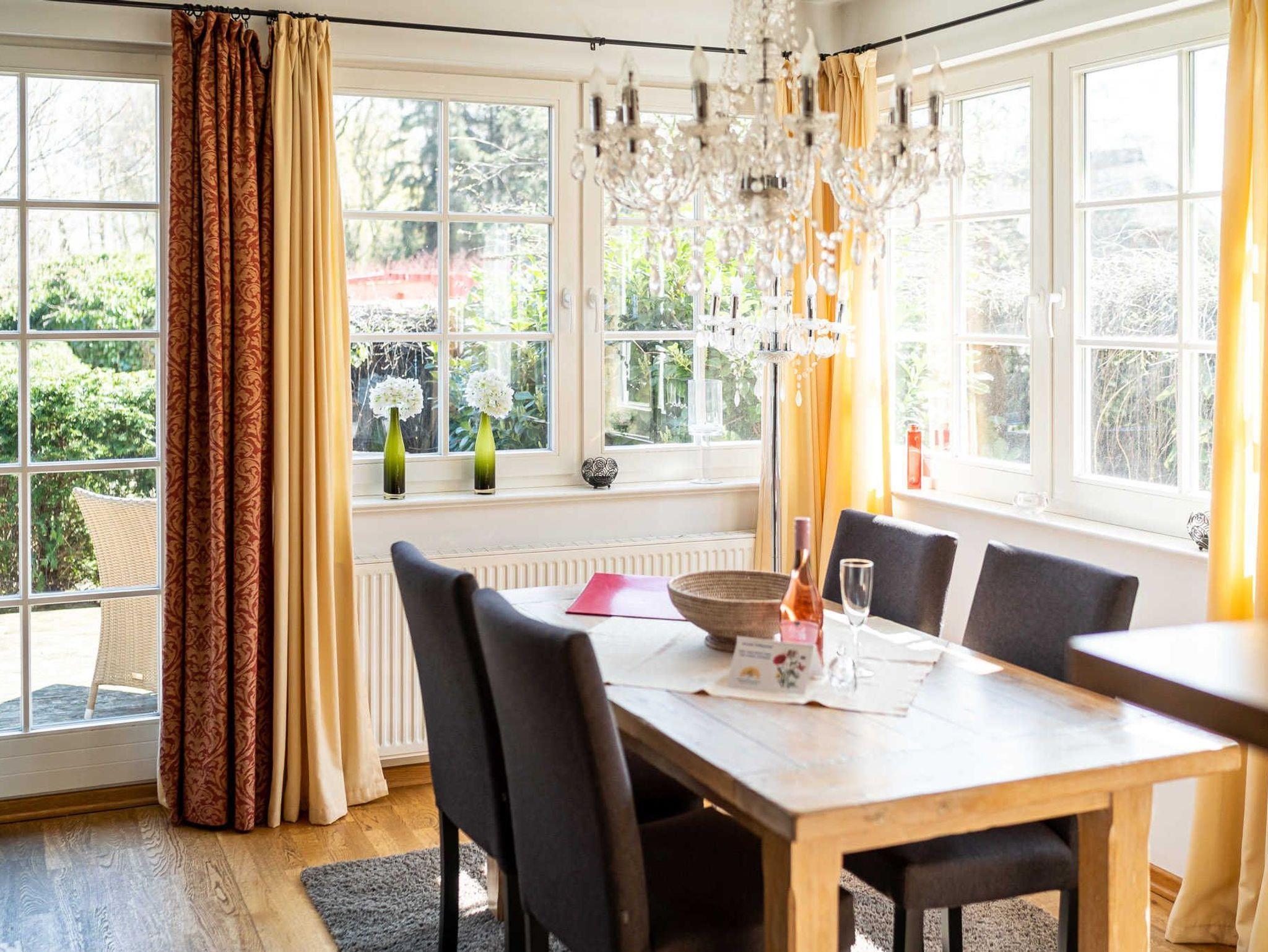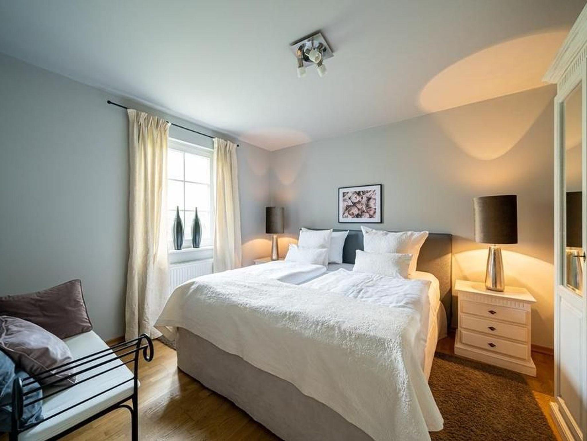 Alle Räume sind hochwertig und geschmackvoll eingerichtet und wirken hell und freundlich durch die großen Sprossenfenster. Die Küche ist ausgestattet mit einem Geschirrspüler und einem Herd mit Backofen. Die Wohnung verfügt über eine TV-SAT-Anlage. In der Wohnküche können Sie es sich am Kamin gemütlich machen. In der Wohnung finden 2 - 4 Personen Platz. Es gibt zwei Schlafzimmer mit Doppelbett (1 Bett 140x200). Im Badezimmer finden Sie eine Dusche / WC. Die Terrasse ist nach hinten ausgerichtet und Sie können den Blick ins Grüne genießen.