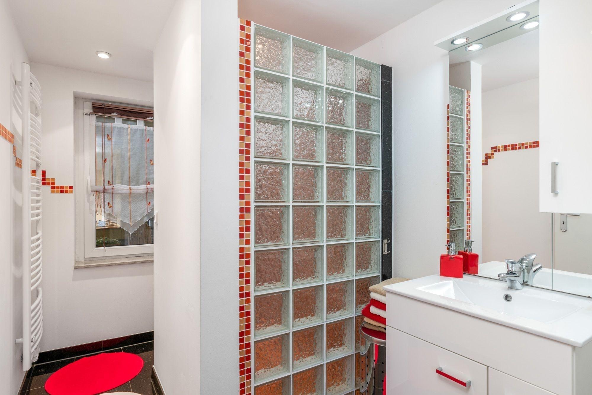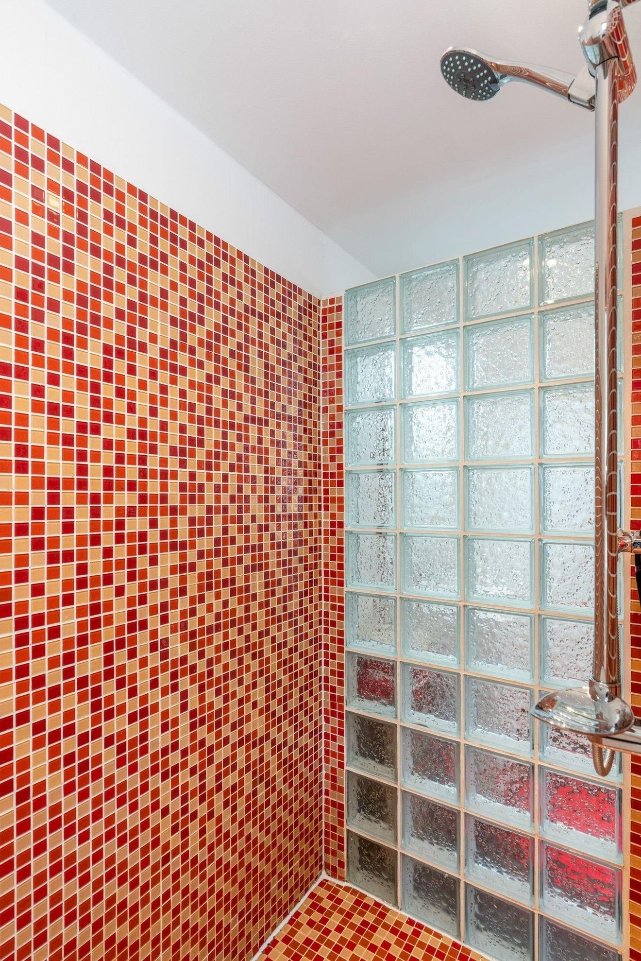 Das Bad wurde aufwendig mit Mosaiksteinen verziert. Eine offenen Dusche mit ausreichend Platz ist hier sicherlich besonders zu erwähnen und gibt diesem Badezimmer auch eine besondere Note.