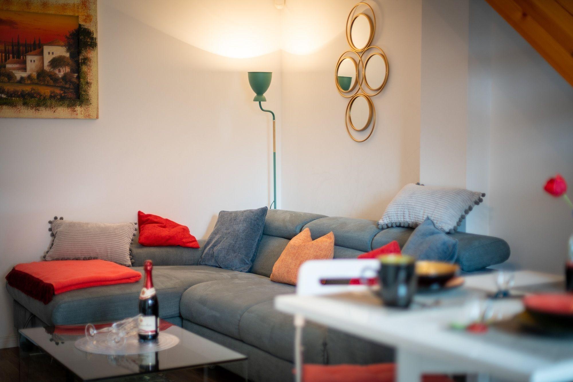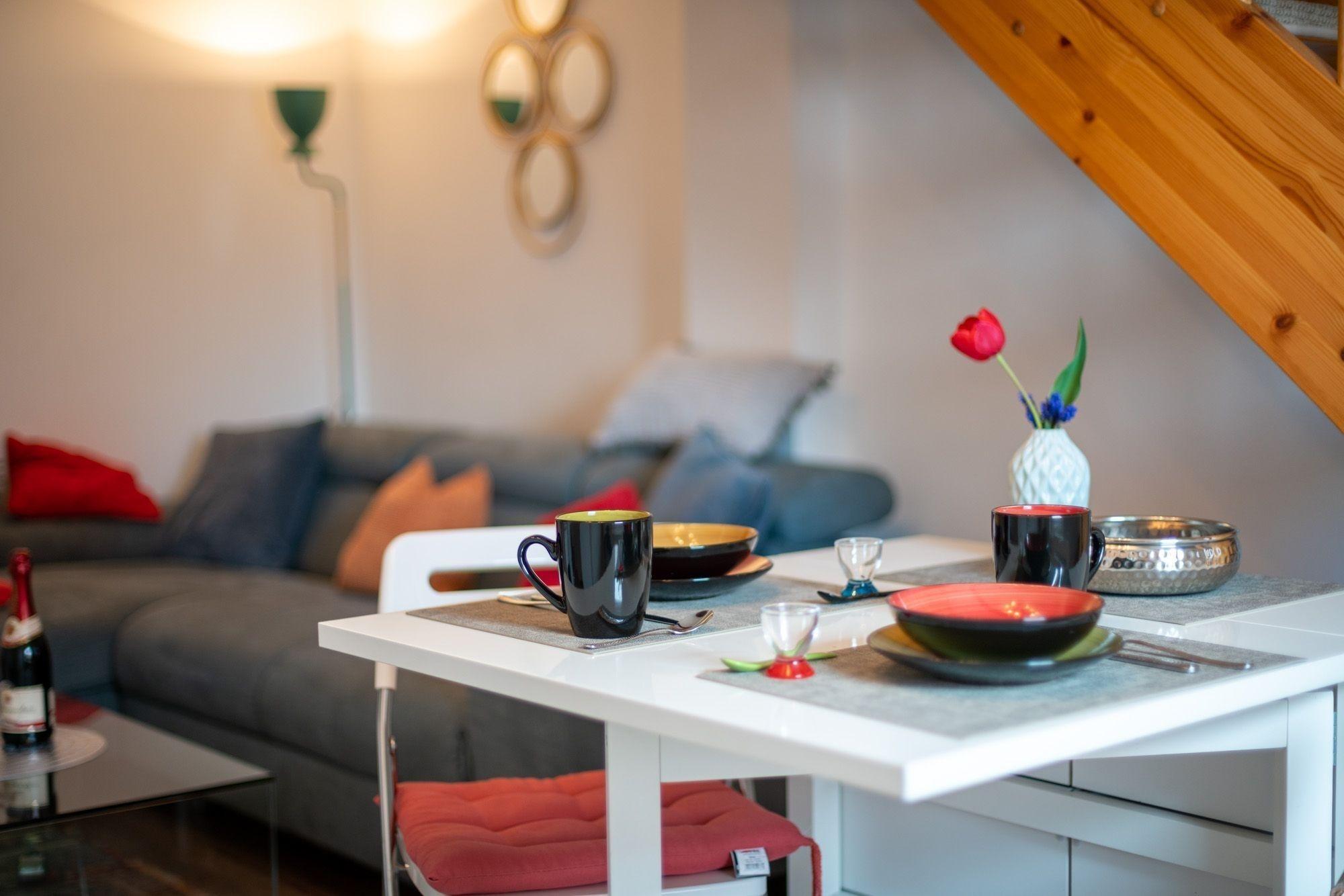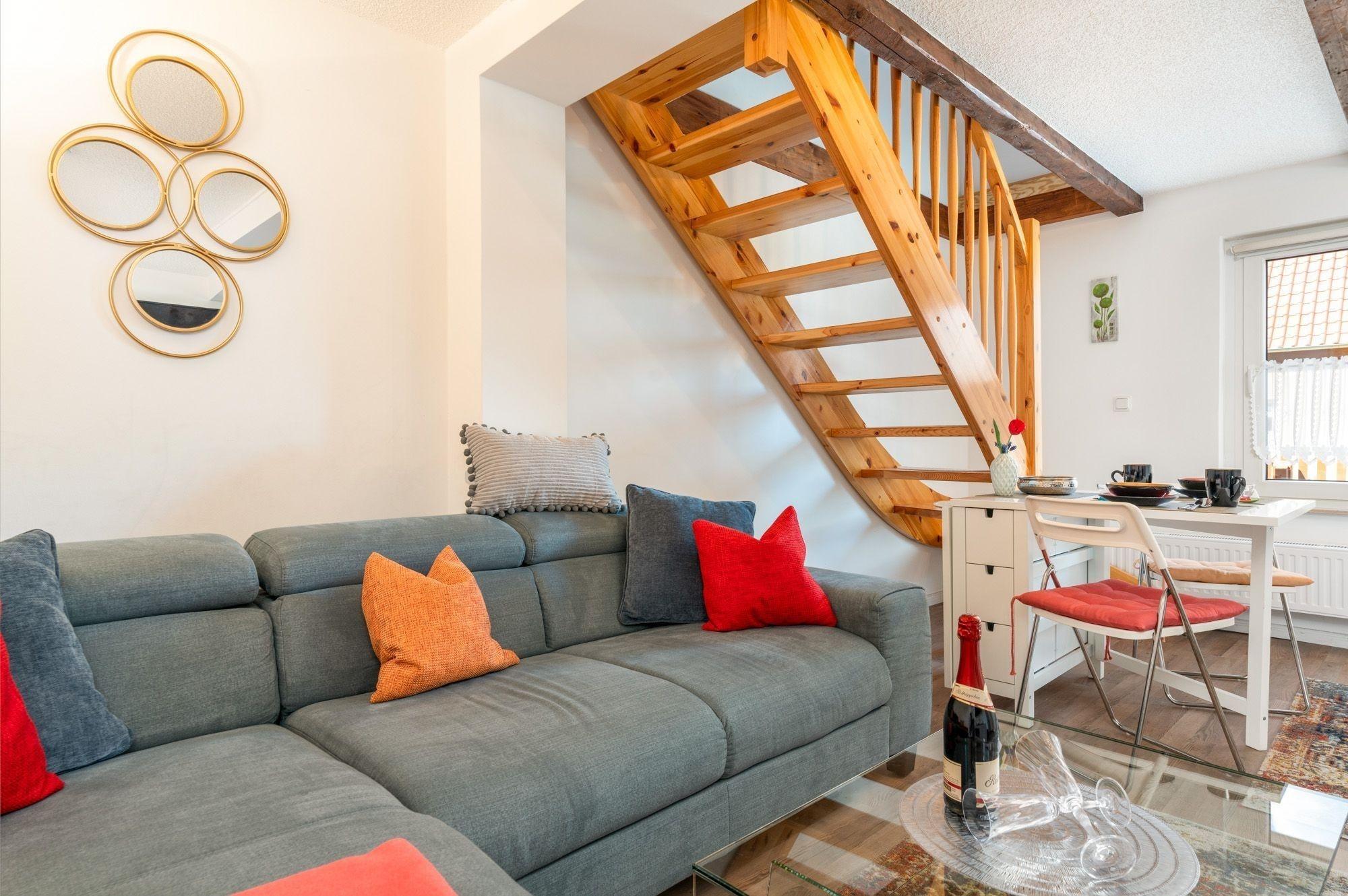 Das Wohnzimmer ist hell und modern eingerichtet, natürlich mit Sat-TV und Internet ausgestattet. Ein Highlight in diesem Bereich sind sicher die wunderschönen alten Dachbalken die nach der Instandsetzung nun einen besonderen Charme versprühen.