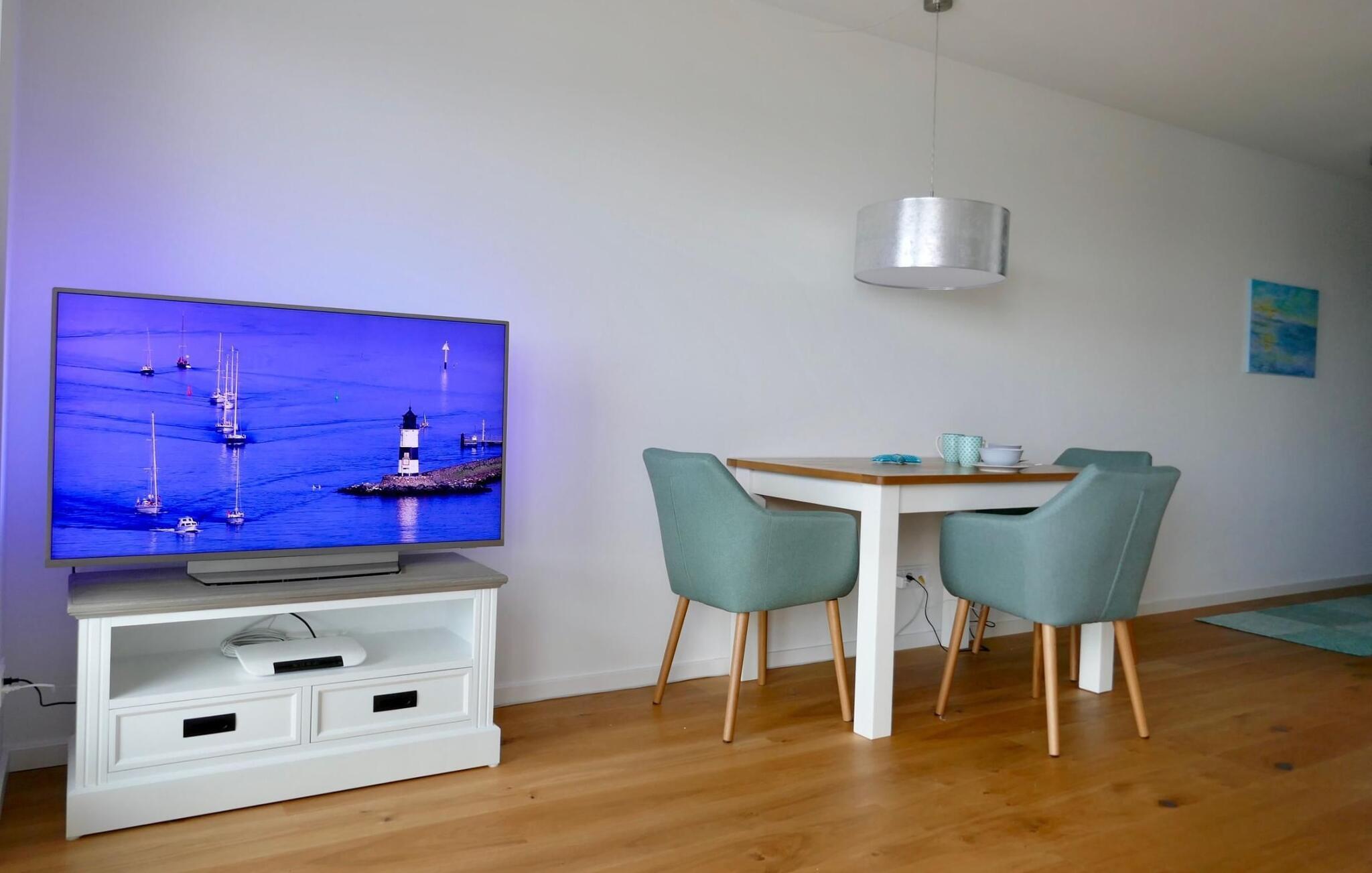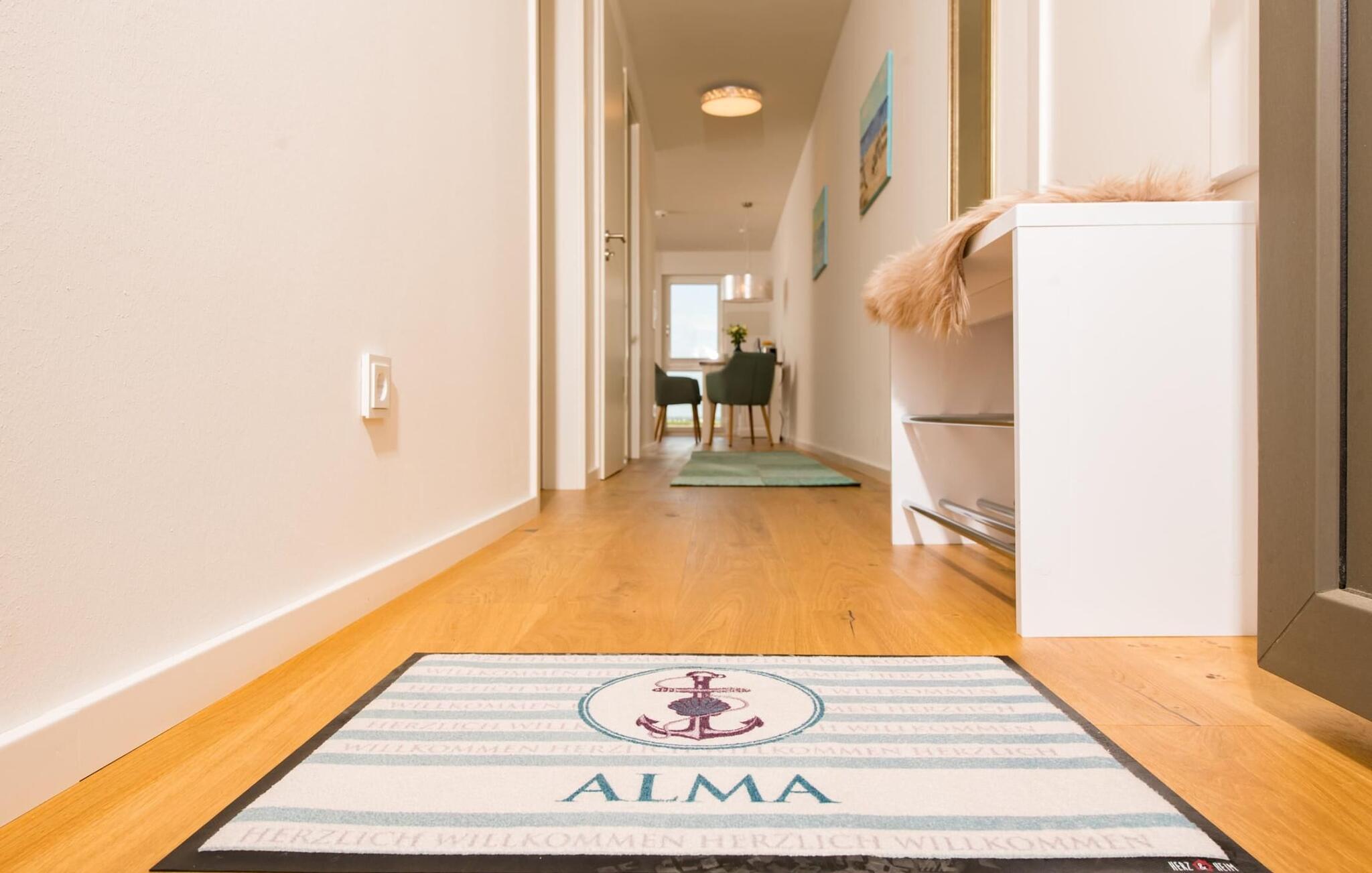 Højt udstyret og stilfuldt møbleret, Alma ferielejlighed scorer med en eksklusiv beliggenhed direkte på havnepromenaden i OstseeResort Olpenitz. Oversvømmet med lys med gulv til loft vinduer og en fænomenal udsigt over sejler- og sportsbådshavnen tilbyder denne ferielejlighed fuld ferieluksus. Udsigten falder på de flydende huse og østersøfjorden Slien med sejlskibe, der passerer og Schimmelünde fyrtårn. En havnebiograf er garanteret, ligesom de billedskønne solnedgange, der kan iagttages fra balkonen.