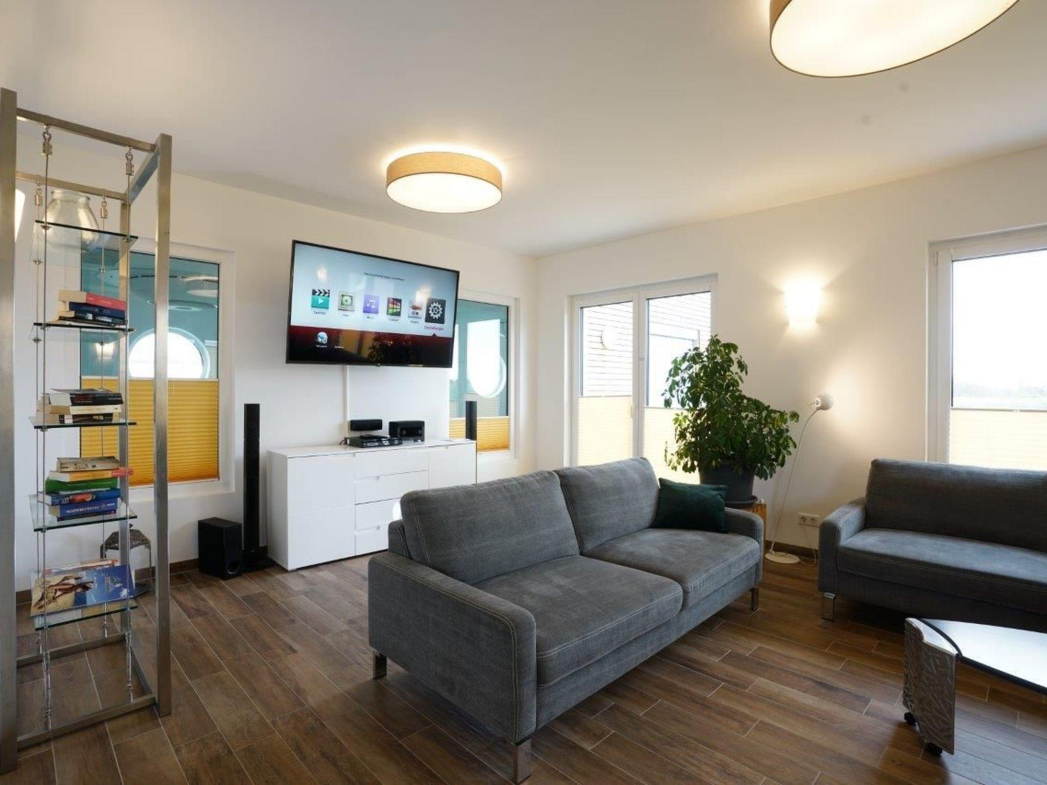 You can watch the children in the swimming pool through the panoramic window in the living room and watch TV at the same time. All bedrooms are equipped with TV. You can listen to music via the TV or via Bluetooth speakers. The seating areas inside and on the large terrace can accommodate up to 8 people. A large awning protects you from the sun and rain - the beach chairs and seats offer a holiday feeling outside.