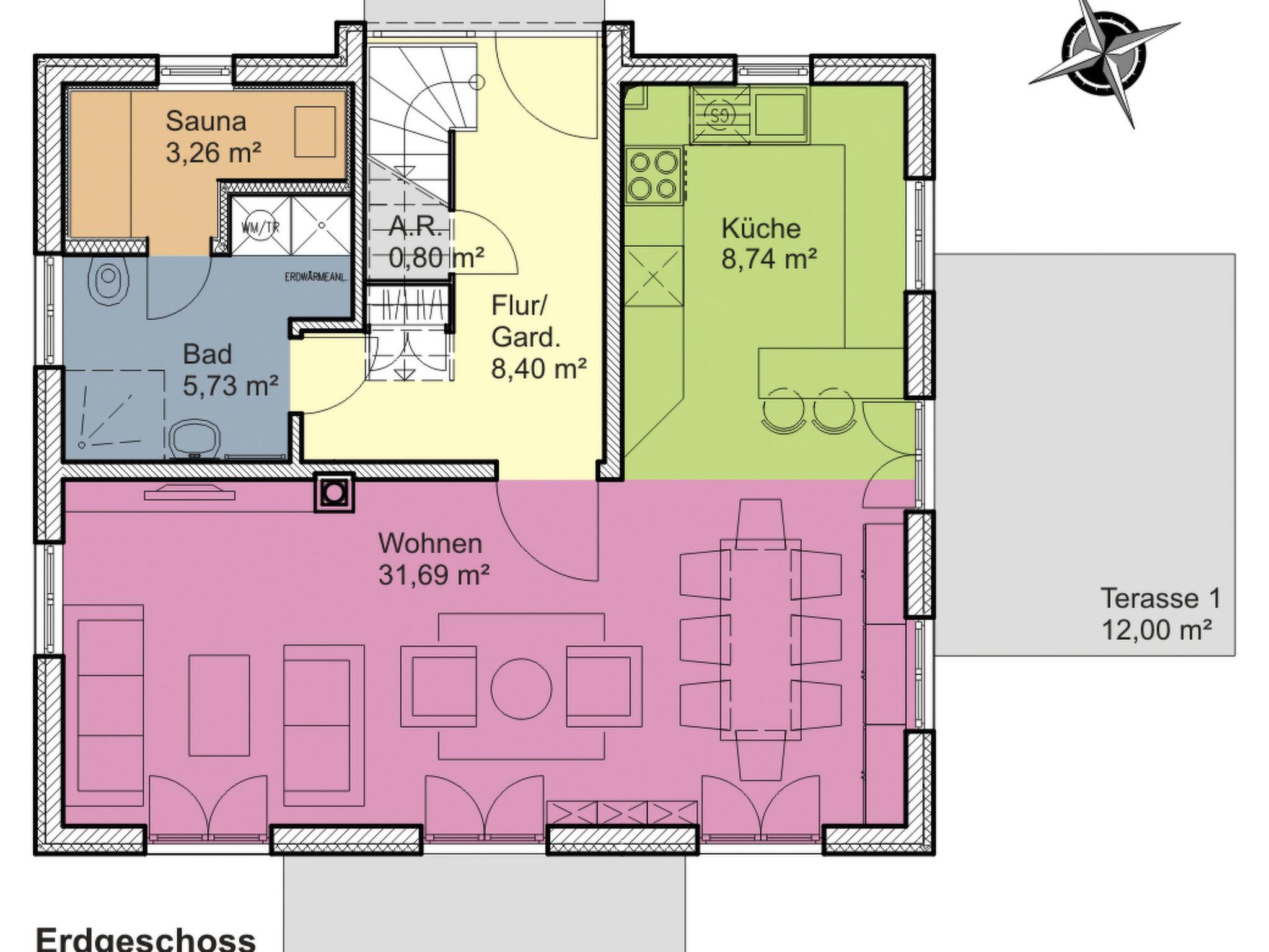 The outdoor area of the house impresses with its spacious garden for exclusive use, which offers enough space for relaxation and activities in the open air. The terrace invites you to linger with its seating and awning, which offers protection from the sun. The hot tub provides refreshment and relaxation, while the beach chair is the perfect reading and resting oasis. The highlight is the covered outdoor pool (shared use from April to early November), complemented by a sauna for pure wellness and relaxation.