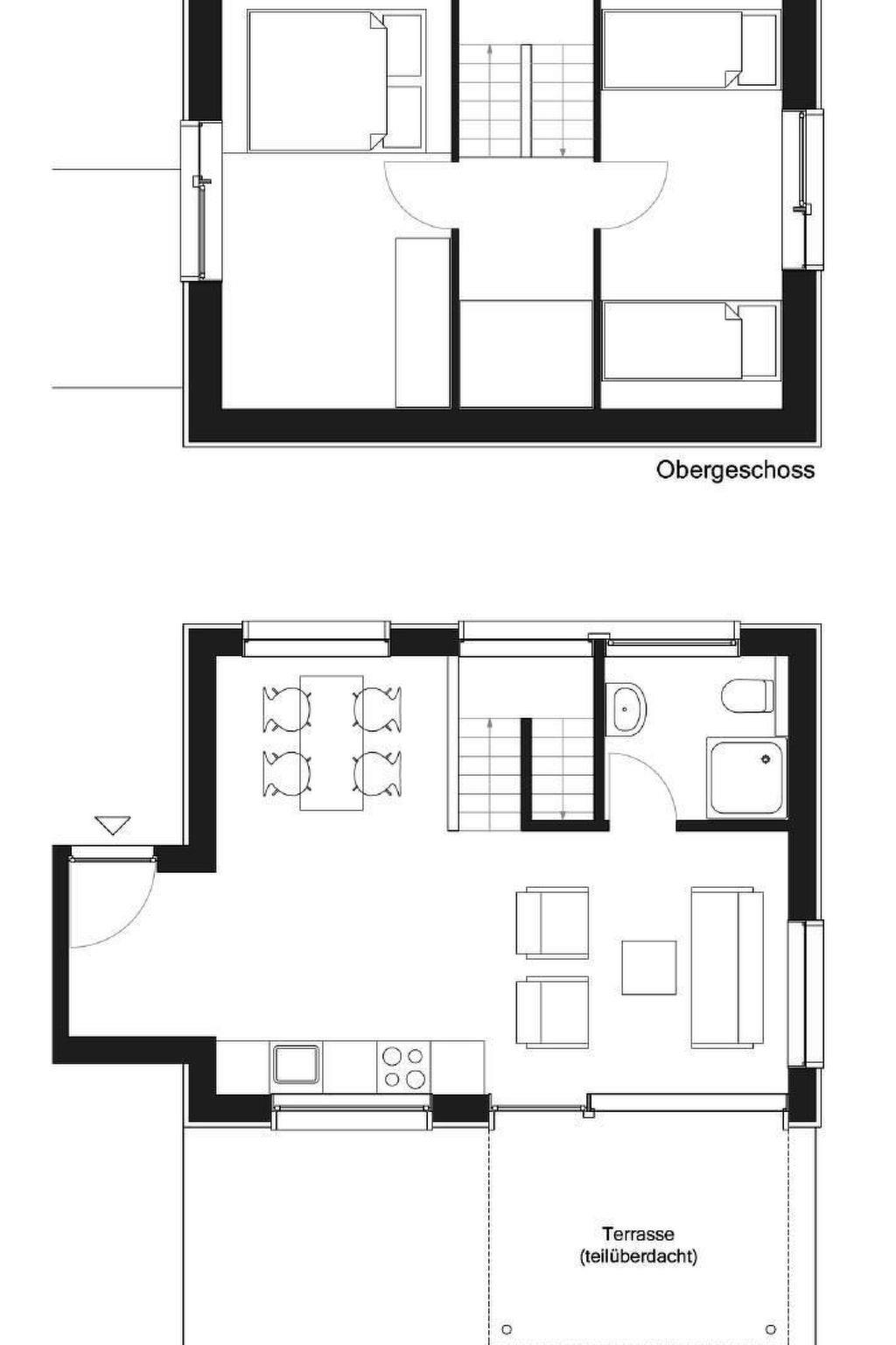 A spacious open-plan living area awaits you on the ground floor, which is particularly bright and friendly thanks to floor-to-ceiling windows. A cosy TV corner with sofa, armchairs and satellite TV invites you to relax. The modern kitchen is fully equipped with a ceramic hob, oven, dishwasher and other amenities for 4 people - ideal for enjoying meals together. The bathroom with shower and WC rounds off the comfortable interior.