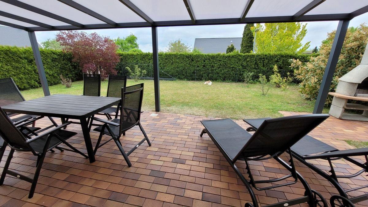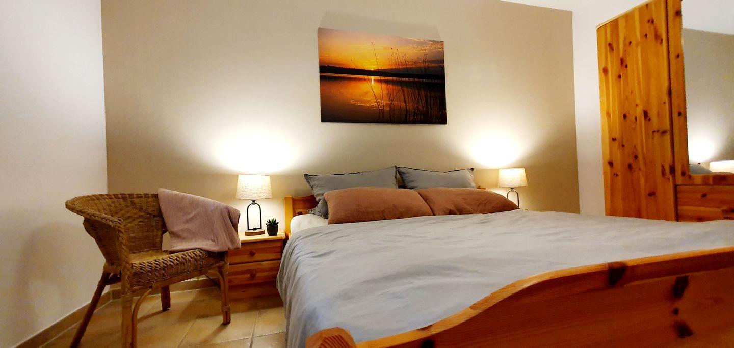 ersten Schlafzimmer steht ein Doppelbett und ein Kleiderschrank. Das zweite Schlafzimmer ist mit zwei einzelnen Betten und einem Kleiderschrank möbliert. Am Haus gibt es eine 20 m² große Südterrasse mit Gartenmöbeln und Holzkohlegrill, zum Entspannen und Erholen bestens geeignet. Ein PKW-Stellplatz ist vorhanden.