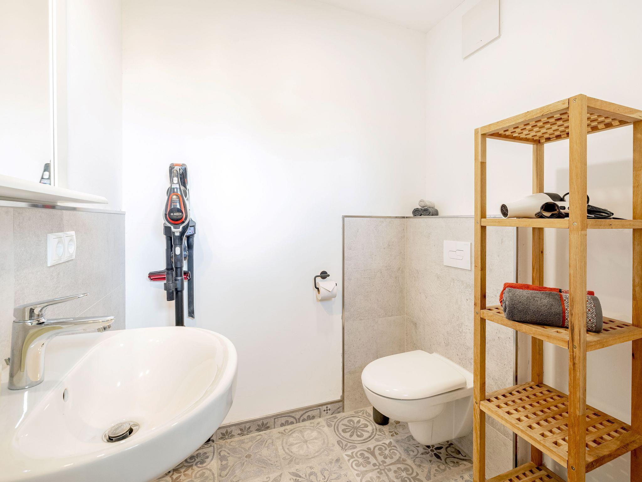 Der zentrale Treffpunkt im Gebäude ist der große Wohnbereich in den eine vollständige Küche mit Essbereich integriert ist. Vom Wohnbereich aus kommt man in die vier einzelnen Schlafzimmer, die alle mit Doppelbetten (bei Bedarf auch als Einzelbetten nutzbar) ausgestattet sind. Die 3 Bäder sind ebenso separat zugänglich, so dass auf Durchgangszimmer gänzlich verzichtet wird. Der gesamte Innenbereich ist durch eine zentral gesteuerte Fußbodenheizung beheizt.