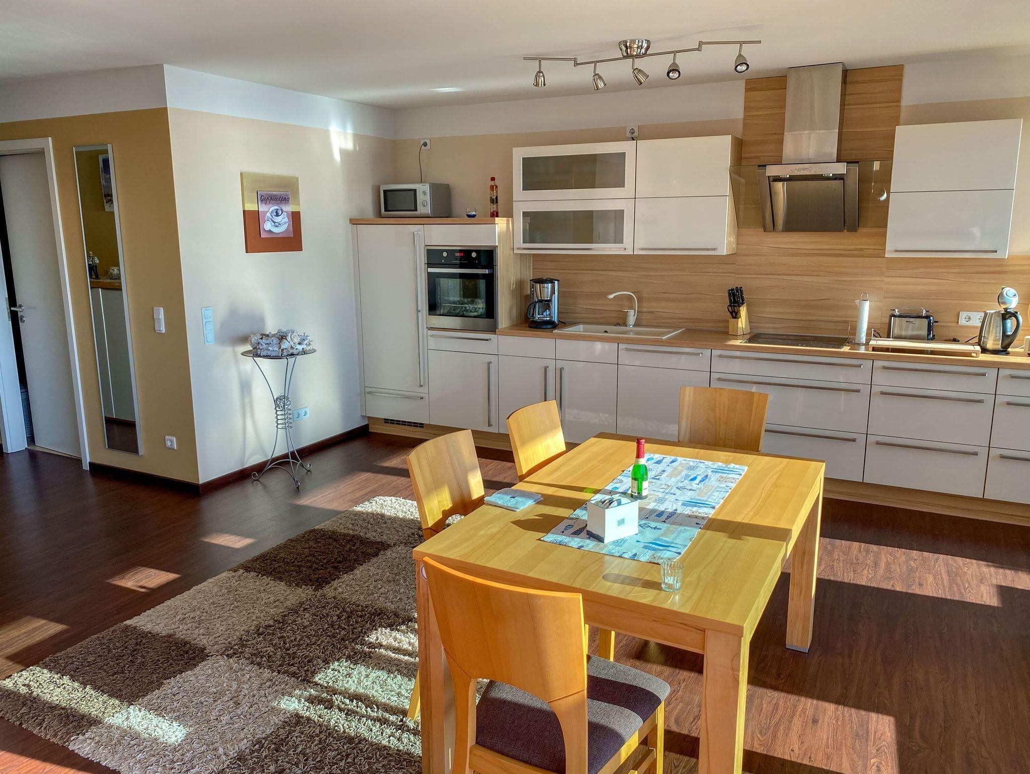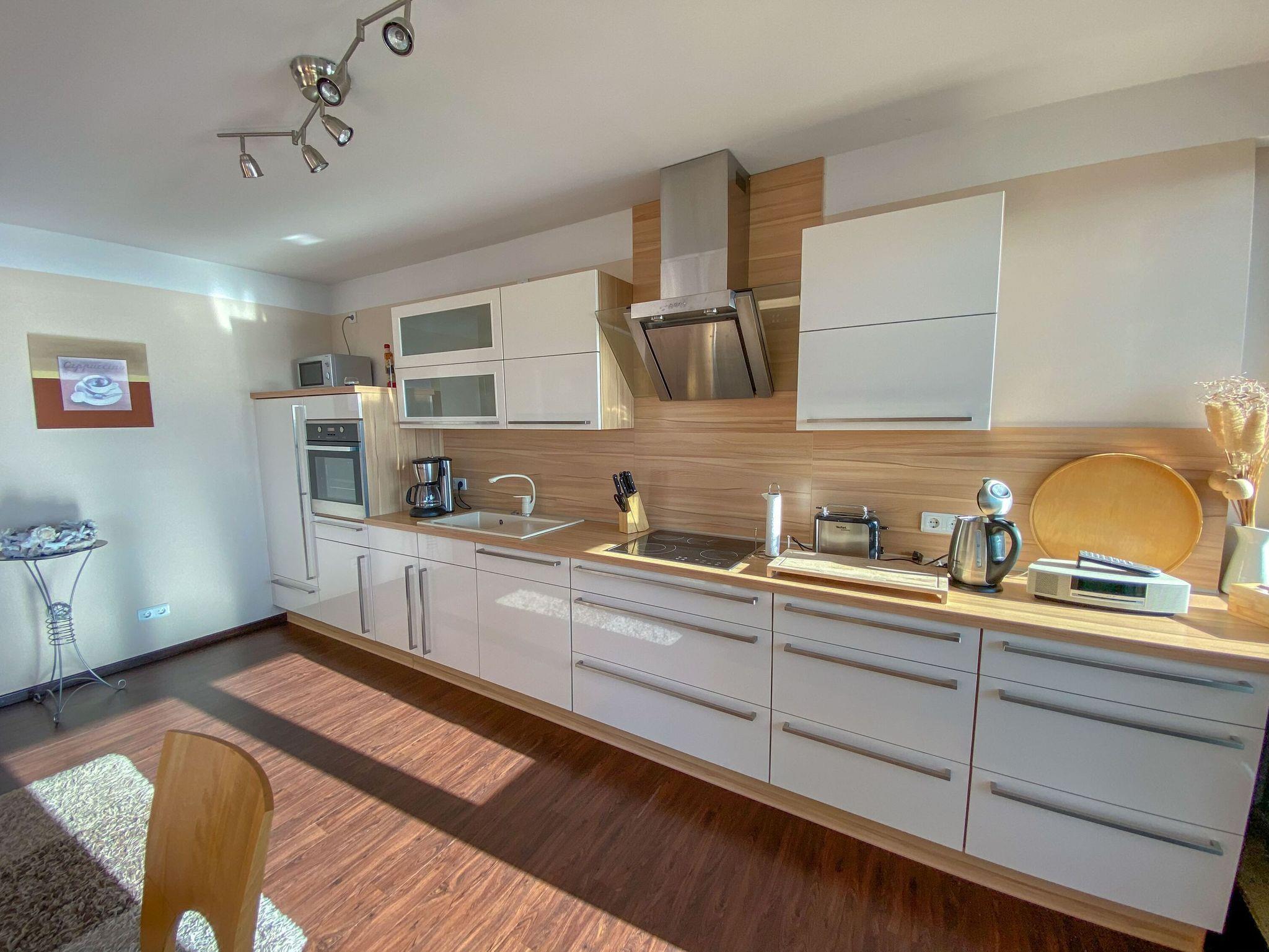 Die moderne Küchenzeile fügt sich harmonisch in den Wohn-/Essbereich ein. Zur Ausstattung gehören unter anderem ein Kühlschrank mit Gefrierfach, ein 4-Zonen-Cerankochfeld, ein Backofen, eine Mikrowelle, eine Spülmaschine, Kaffeemaschine, Toaster, Wasserkocher und diverses Kleininventar.