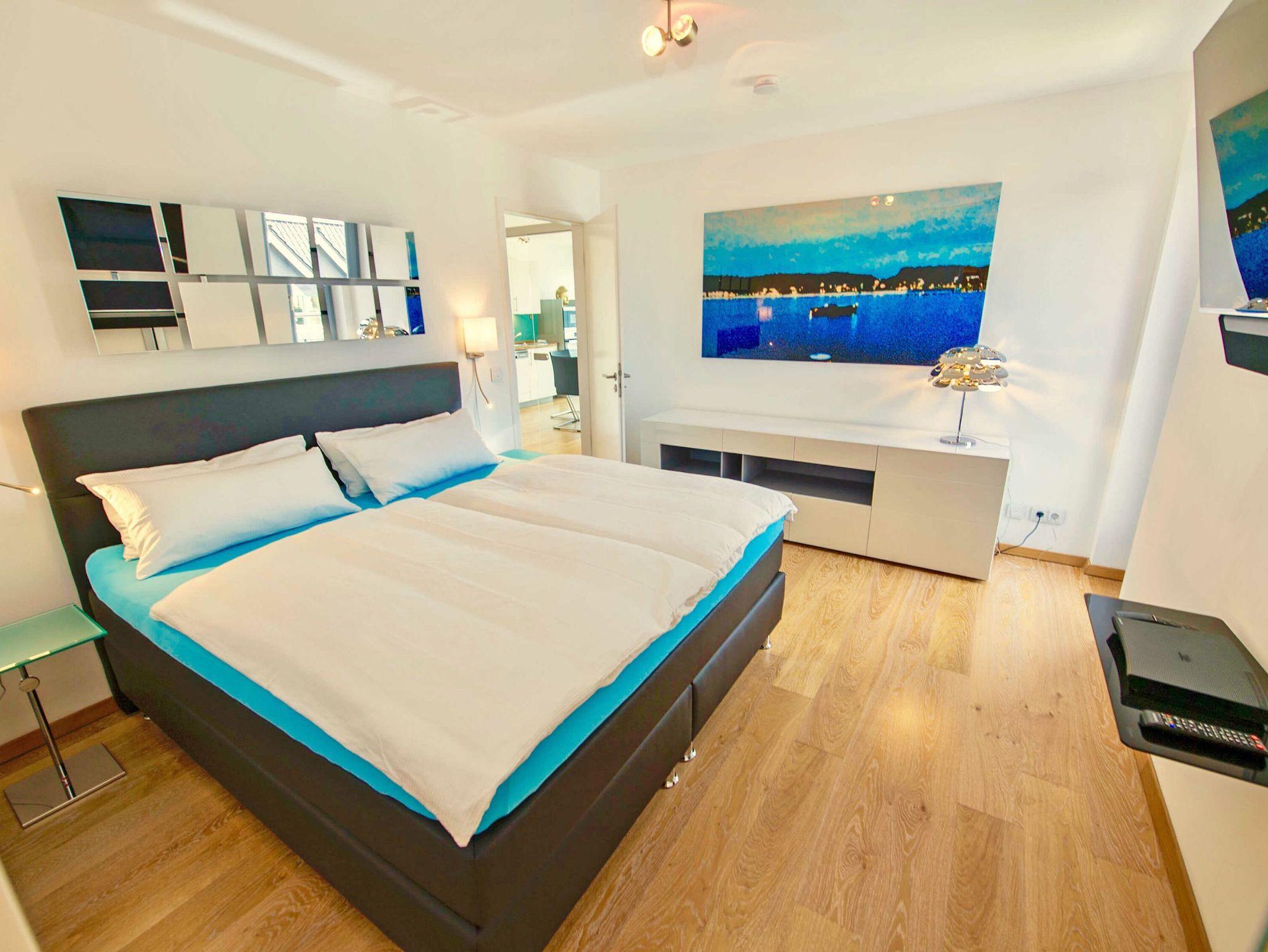 Das gemütliche ca. 13 m² große Schlafzimmer ist mit einem bequemen Boxspringbett (1,80m x 2,00m) und einem Flachbild-TV ausgestattet. Ein großer Kleiderschrank zum Verstauen Ihrer Urlaubsgarderobe befindet sich in einem, durch eine Schiebetür vom Schlafzimmer getrennten Ankleideraum. Dieser ist auch vom Flur aus begehbar.