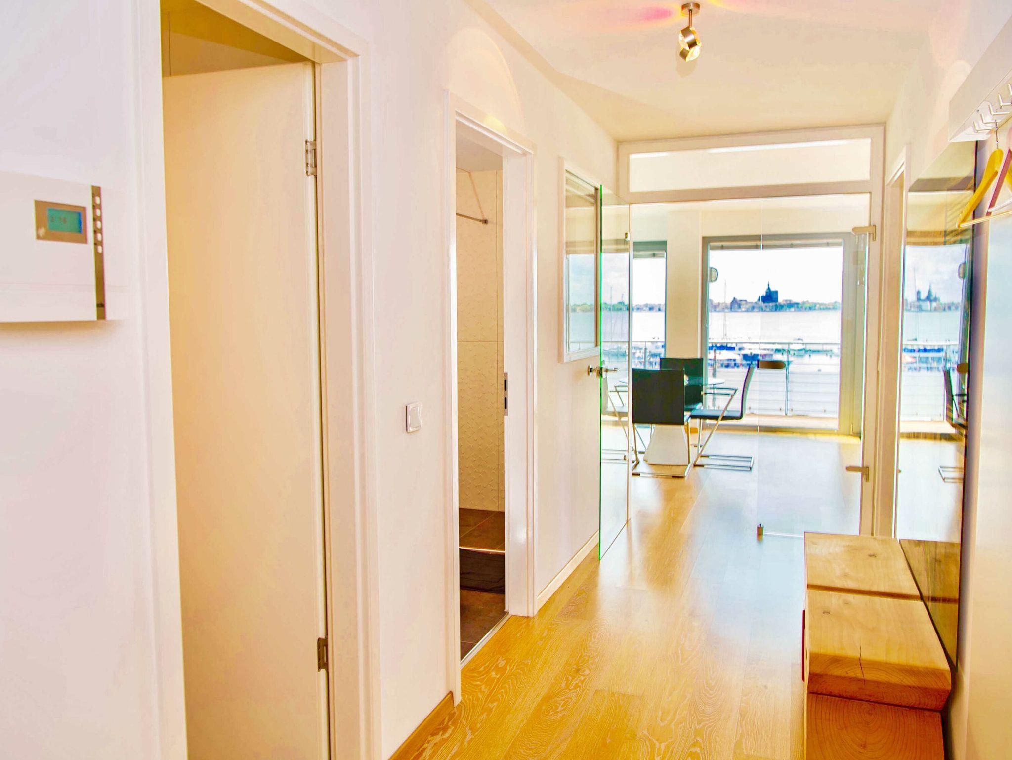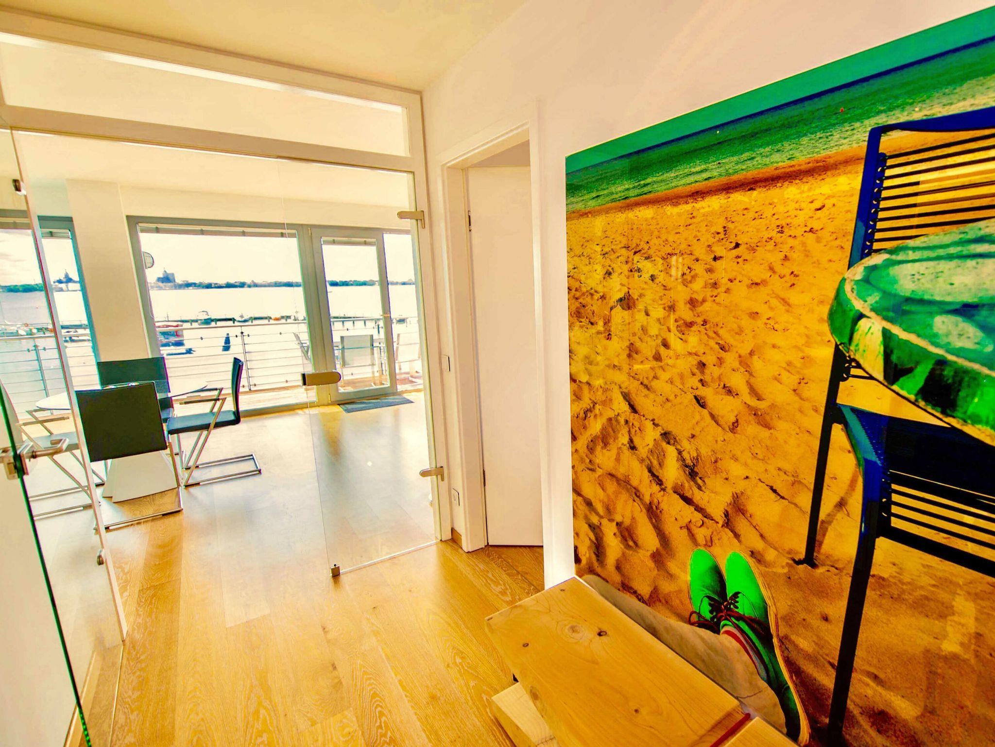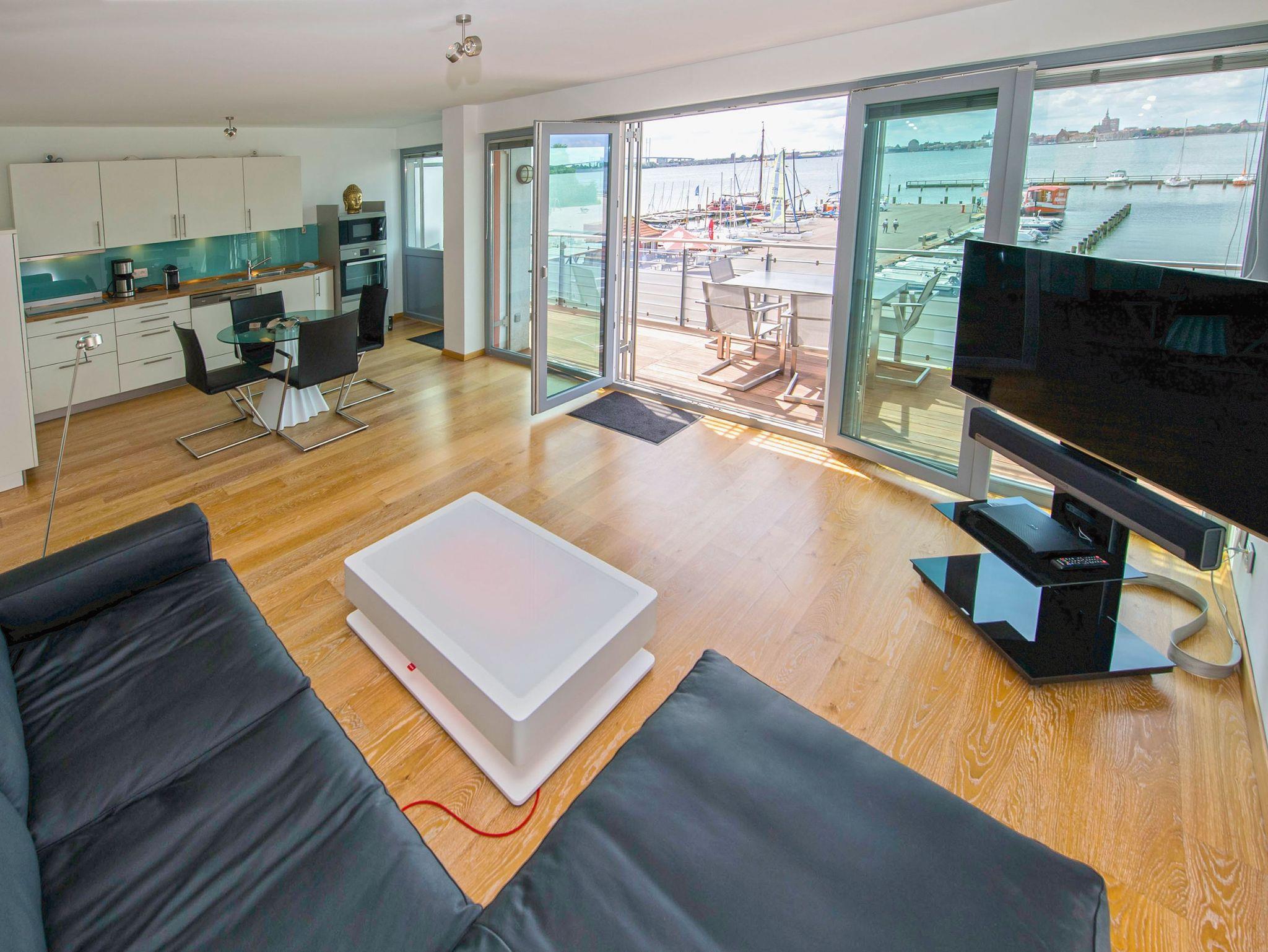 Sie schätzen das Besondere? Dann wird Sie dieses rund 71 m² große, barrierefreie 2-Raum-Appartement im zweiten Obergeschoss begeistern. Es ist ganz bequem per Lift zu erreichen und bietet Ihnen von seinem gut 15 m² großen Südwest-Balkon mit Designersitzecke und Liege einen spektakulären Panoramablick auf die Weltkulturerbe - Stadt Stralsund, den Strand, den Strelasund - die Meeresenge zwischen Stralsund und der Insel Rügen sowie auf den kleinen Yachthafen mit Bootsvermietung. Genießen Sie von hier aus den längsten Sonnenuntergang auf der Insel Rügen!