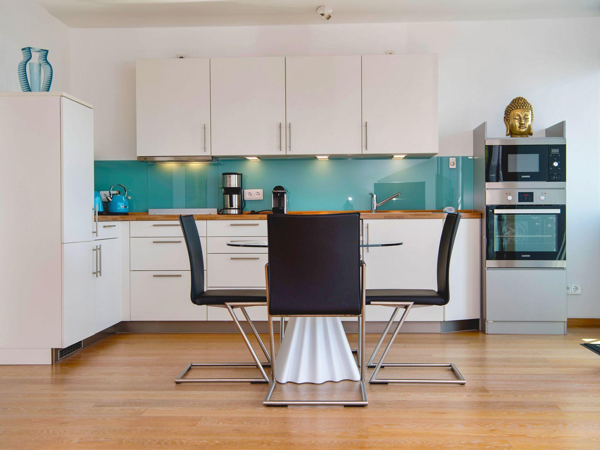 Eine komplett ausgestattete Küchenzeile wurde harmonisch in den Wohn-/Essbereich integriert. Zur Ausstattung gehören unter anderem ein Kühlschrank mit Gefrierfach, ein 4-Zonen-Cerankochfeld, ein Backofen, eine Mikrowelle, eine Spülmaschine, eine Nespresso-Kaffeemaschine (Kapseln sind nicht vorhanden), Kaffeemaschine, Toaster, Wasserkocher und diverses Kleininventar.