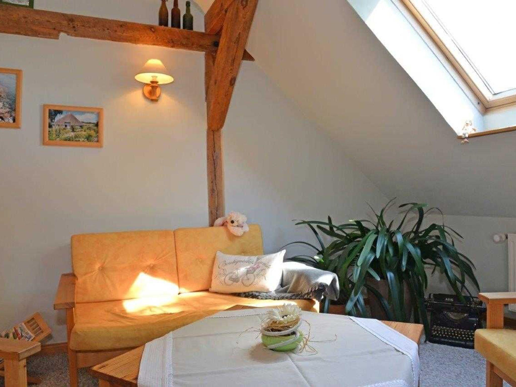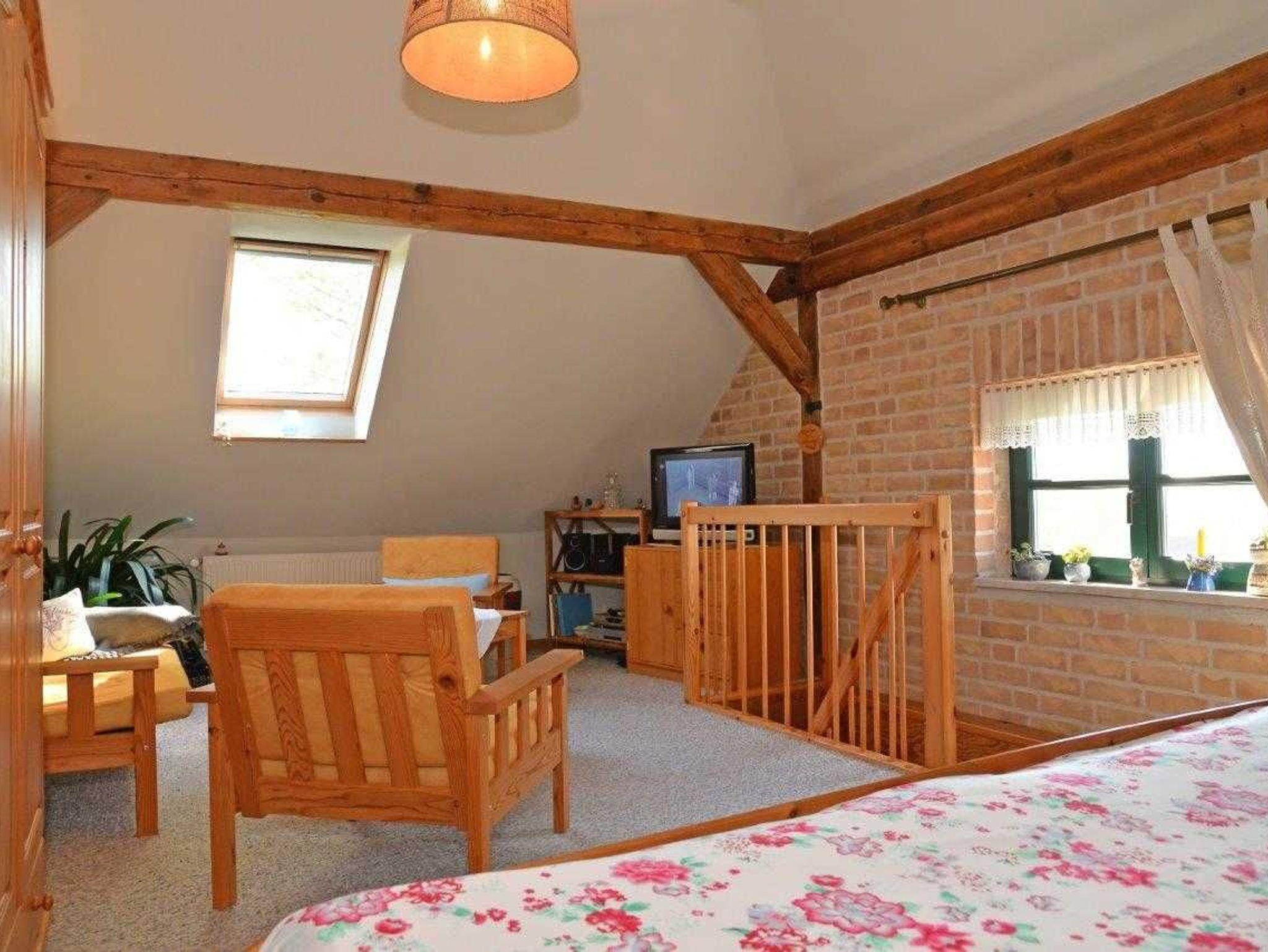 Die ca. 60m² große Ferienwohnung ist in 2 Etagen aufgeteilt und bietet ein gemütliches, komfortables und ländliches Ambiente. Wohn- und Schlafbereich befinden sich in der oberen Etage und ist mit einem Doppelbett 180x200 und Kleiderschrank ausgestattet, Küche und Bad mit Dusche befinden sich im Erdgeschoss. Ihr Feriendomizil hat Sat-TV, Radio, Terrasse, Grill und einen PKW Stellplatz am Haus.