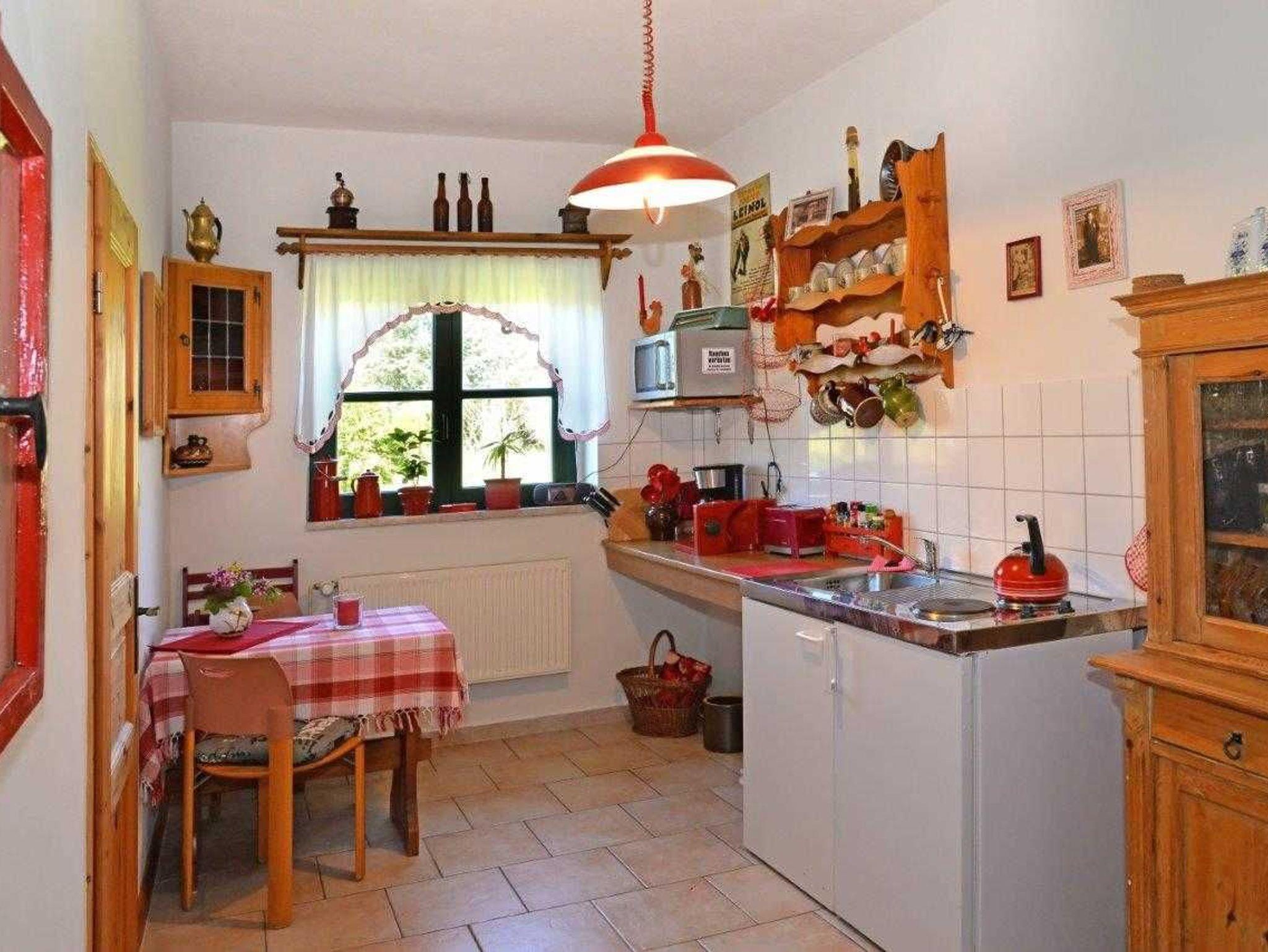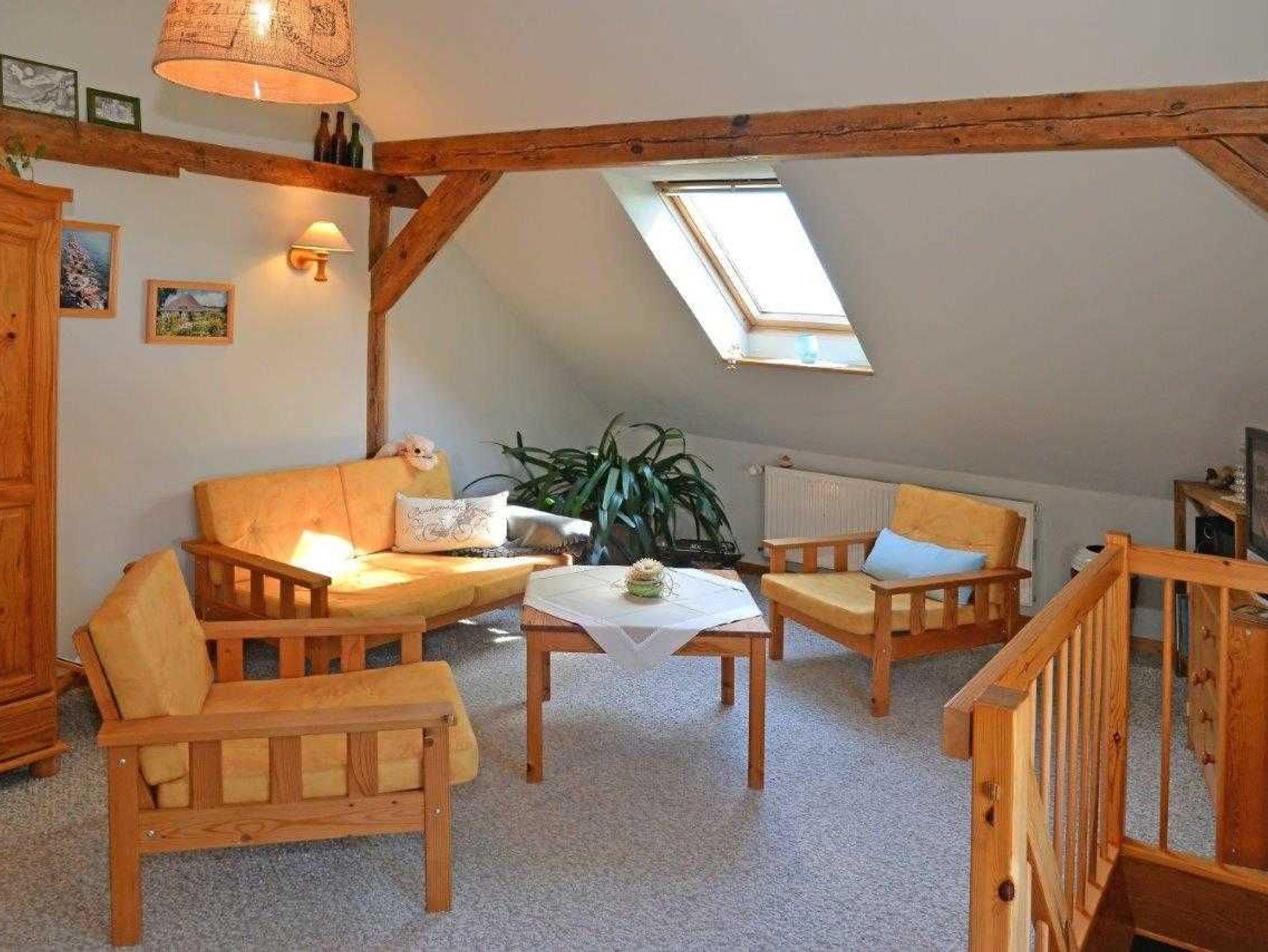 Die ca. 60m² große Ferienwohnung ist in 2 Etagen aufgeteilt und bietet ein gemütliches, komfortables und ländliches Ambiente. Wohn- und Schlafbereich befinden sich in der oberen Etage, Küche und Bad mit Dusche im Erdgeschoss. Ihr Feriendomizil hat Sat-TV, Radio, Terrasse, Grill und einen PKW Stellplatz am Haus.