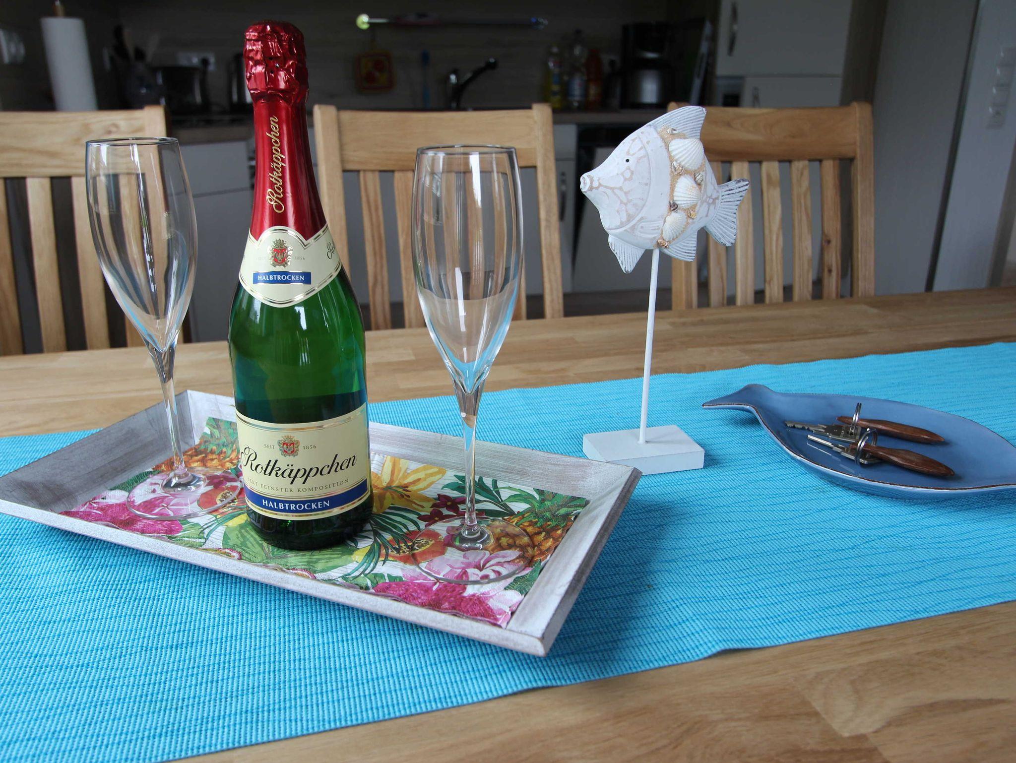Das Wohnzimmer mit Terrasseszugang ist mit einer Couch, Sesseln, TV und einen Essbereich für 6 Personen ausgestattet. Im Wohnbereich befindet sich ebenfalls ein vollausgestatteter Küchenbereich mit Kühl- und Gefrierschrank, Backofen, Herd mit Ceranfeld, Mikrowelle, Kaffeemaschine, Wasserkocher und einer Geschirrspülmaschine.