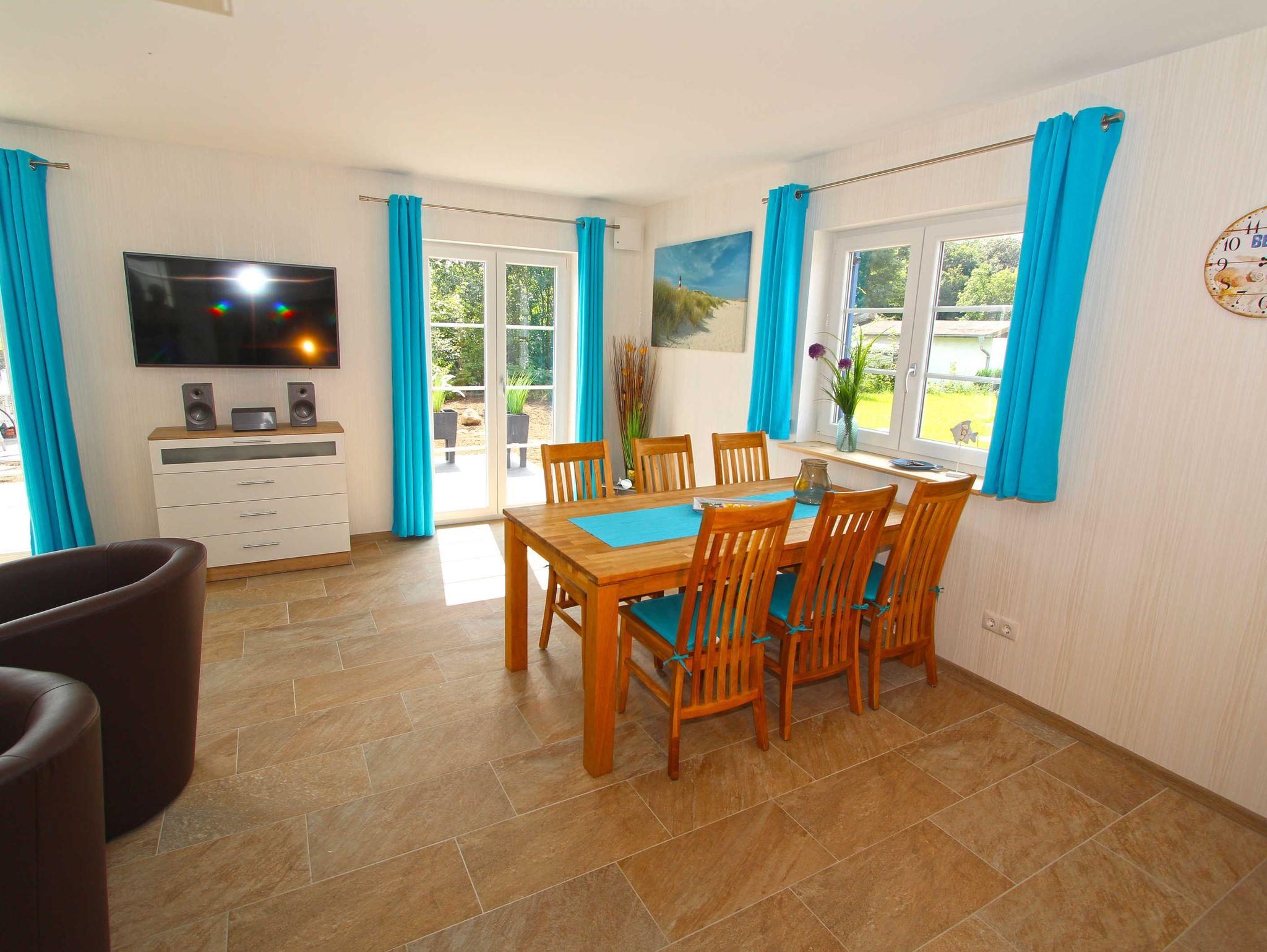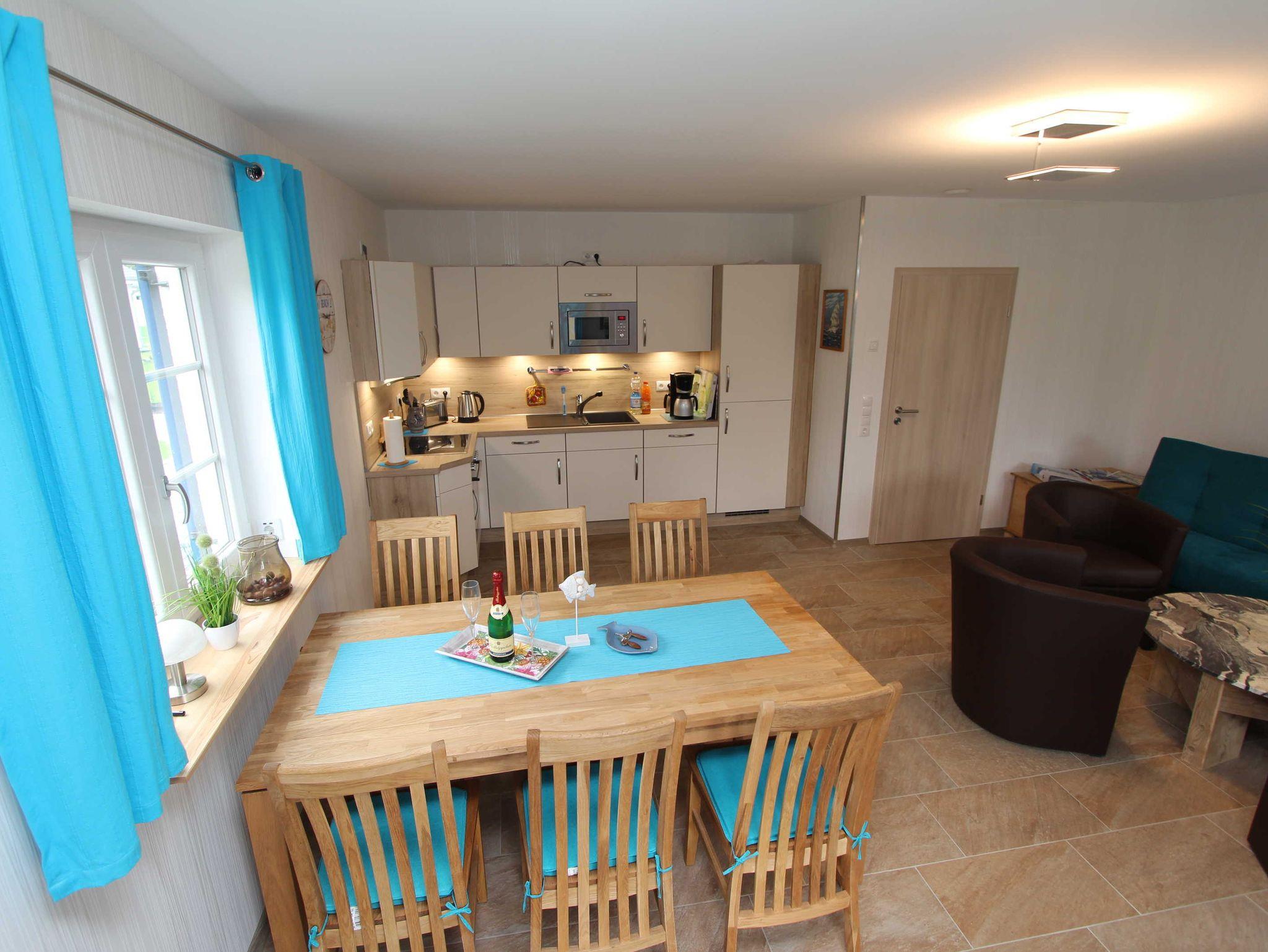Das Wohnzimmer mit Terrasseszugang ist mit einer Couch, Sesseln, TV und einen Essbereich für 6 Personen ausgestattet. Im Wohnbereich befindet sich ebenfalls ein vollausgestatteter Küchenbereich mit Kühl- und Gefrierschrank, Backofen, Herd mit Ceranfeld, Mikrowelle, Kaffeemaschine, Wasserkocher und einer Geschirrspülmaschine.