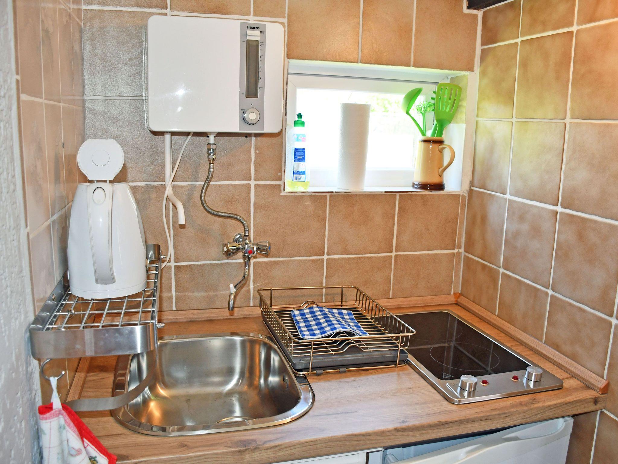 Die kleine Küchenzeile ist mit einem Herd, Wasserkocher, Kaffeemaschine, Toaster und Kühlschrank komplett ausgestattet.