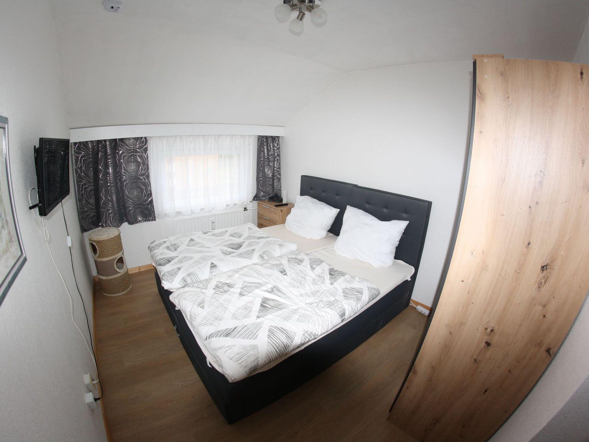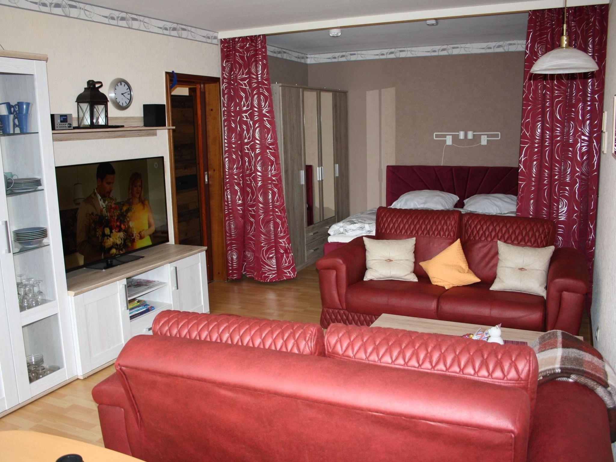 Die Katzenfreundliche Ferienwohnung im Harz verfügt über ein kombiniertes Wohn-/Schlafzimmer und ein kleines Schlafzimmer. Im Wohnbereich findet man eine 2-er-Sitzcouch, 2 Sessel, Wohnzimmerschrank, Couchtisch und ein Flachbild-TV. In der Essecke findet man einen ausziehbaren Tisch und 4 Stühle. Weiterhin steht hier ein Katzenkratzbaum. Die kleine Küche ist ausgestattet mit Cerankochfeld, Spülmaschine, Kühlschrank, Minibackofen und Mikrowelle. Der Schlafbereich mit einem Doppelbett, Kleiderschrank und Nachttisch ist durch einen Vorhang abgetrennt. In dem separaten kleinen Schlafzimmer stehen 2 rollbare Boxspringbetten (als Einzelbetten und kombinierbar) und ebenfalls ein Kleiderschrank und Nachtschrank.