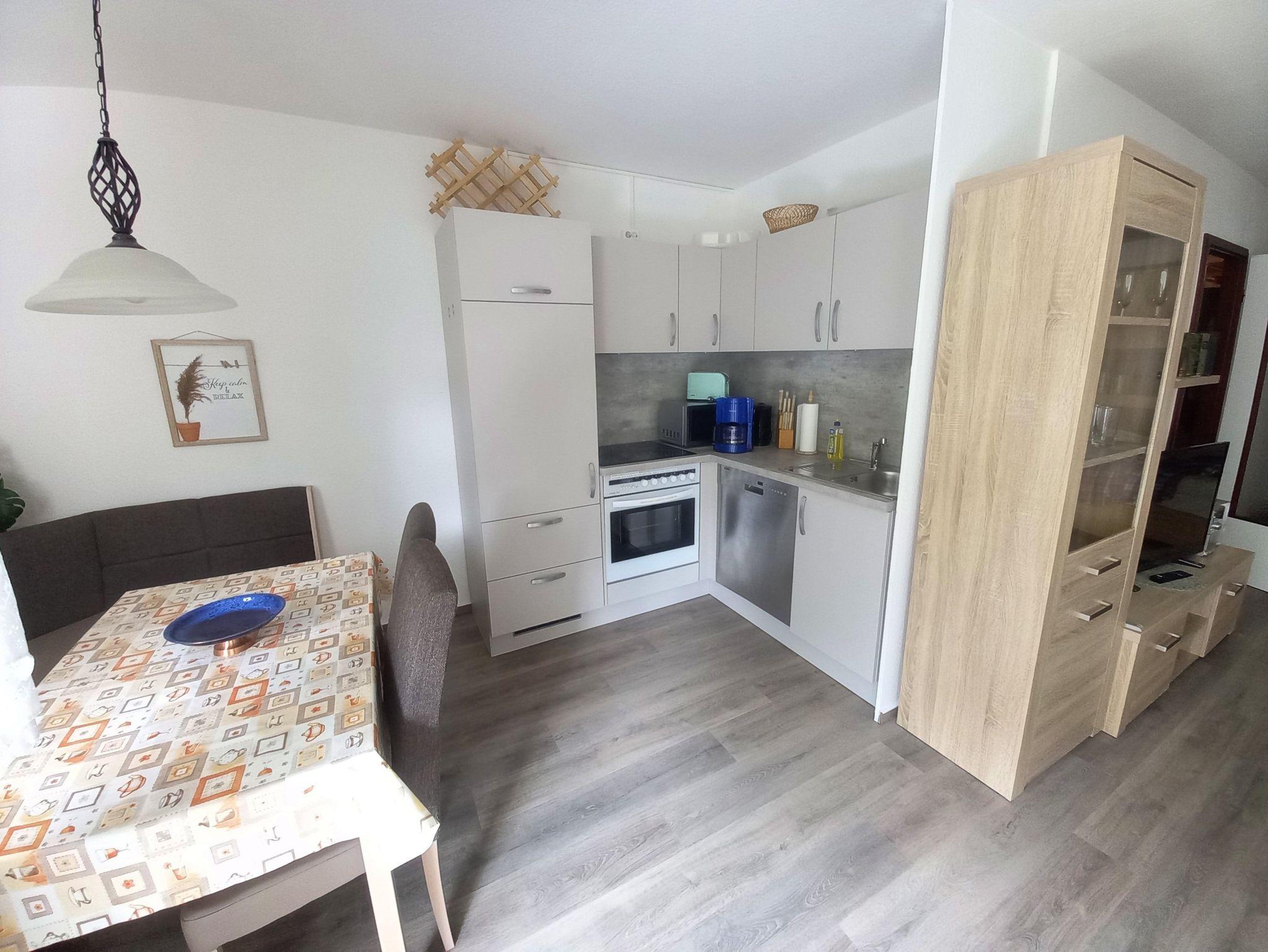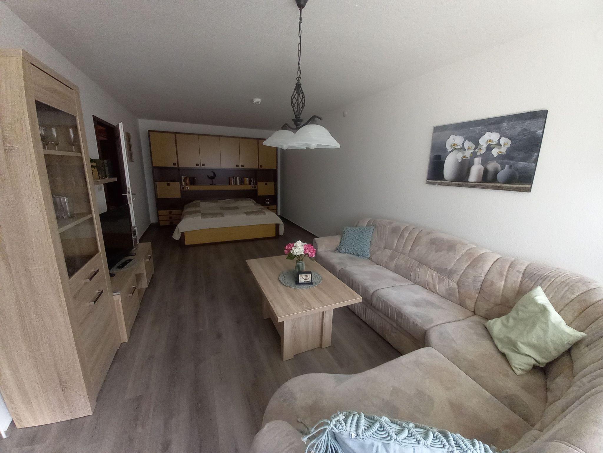 Das Ferienappartement verfügt in offener Bauweise über einen Schlafbereich mit Doppelbett, einen gemütlichen Wohnbereich mit Kabel-TV und Mini-Hifi-Anlage und einer gut ausgestatteten Einbauküche mit Essecke.
