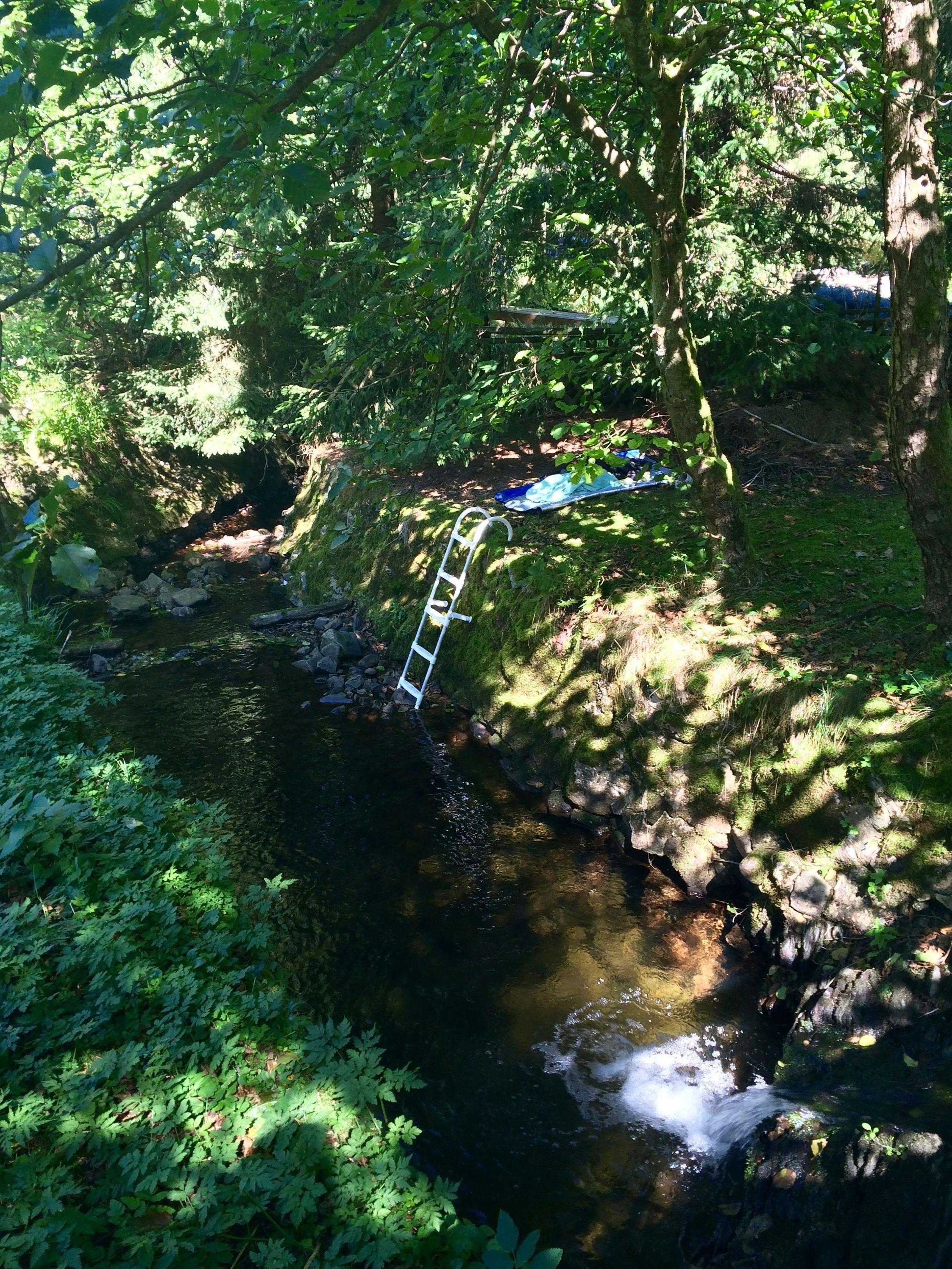 Naturbelassener Garten mit Terrasse am romantischen Waldbach. Lagerfeuer mit Feuerschale möglich. Der tieferliegende Bach ist nicht abgegrenzt. Wer mag, kann sich hier im Naturtauchbecken des Waldbaches nach einer Wanderung oder Sauna erfrischen.