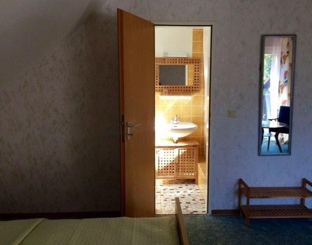 Hell, modern und individuell: Zwei Schlafzimmer ( ein Doppelbett 160 x 200 und Waschtisch sowie zwei Einzelbetten á 90 x 200), ein Wohnzimmer mit Satellit-TV und bequemer Schlafcouch (160 x 200), ein Duschbad mit WC und Fenster (über das Wohnzimmer erreichbar). Zusätzlich steht Ihnen ein separates WC zu Ihrer alleinigen Nutzung auf der Etage zur Verfügung. Alle Zimmer mit großzügigem Balkon. Gemütliche, komplett ausgestattet Küche mit Blick auf den Waldbach. WLAN/Internet. Gäste der Ferienwohnung können unsere hauseigene Sauna (nach Absprache mit Aufpreis) sowie Massagen oder Meditationen für Ruhe, Entspannung und Vitalisierung nach Absprache mit unserer Therapeutin im Haus genießen.