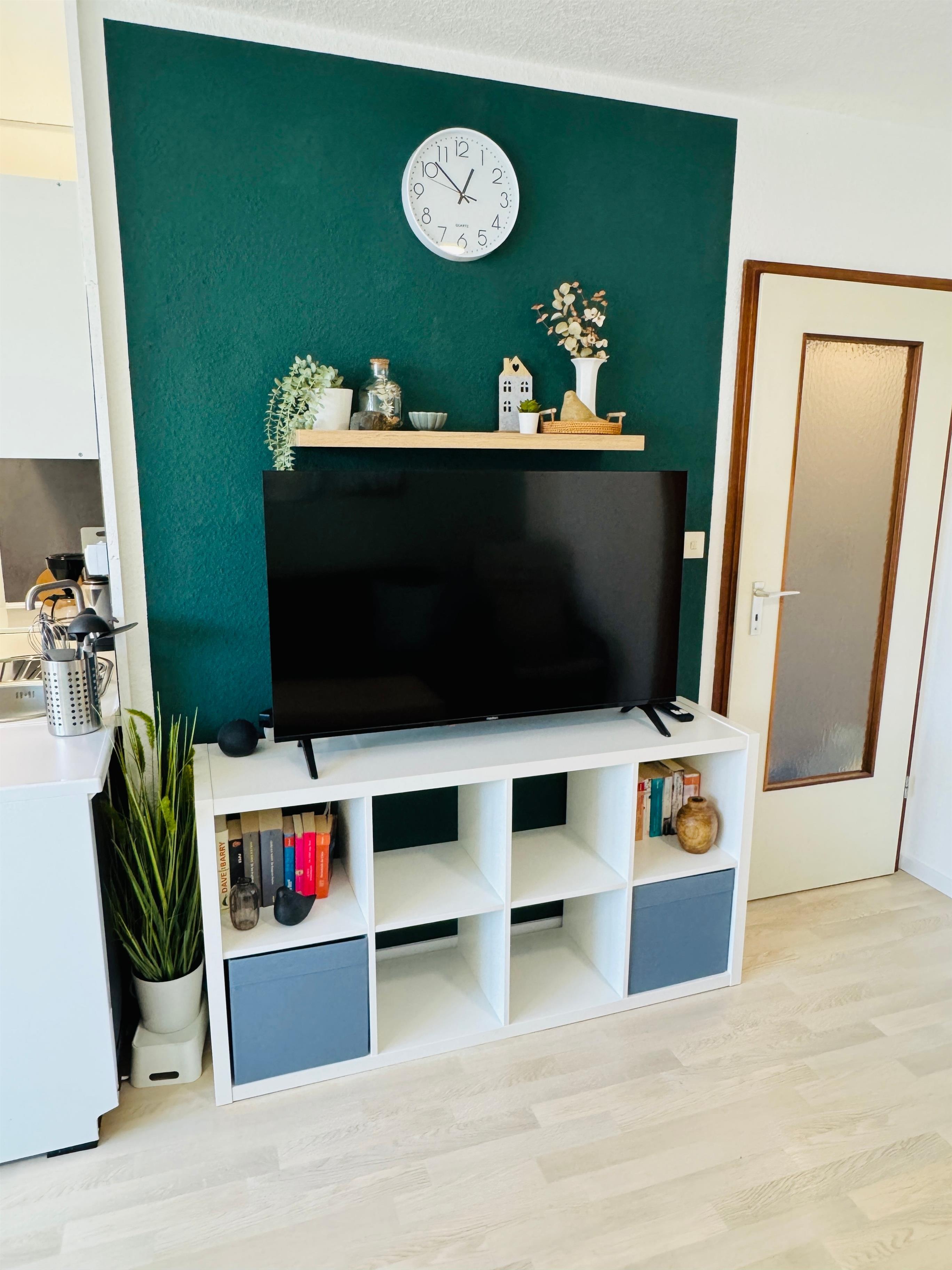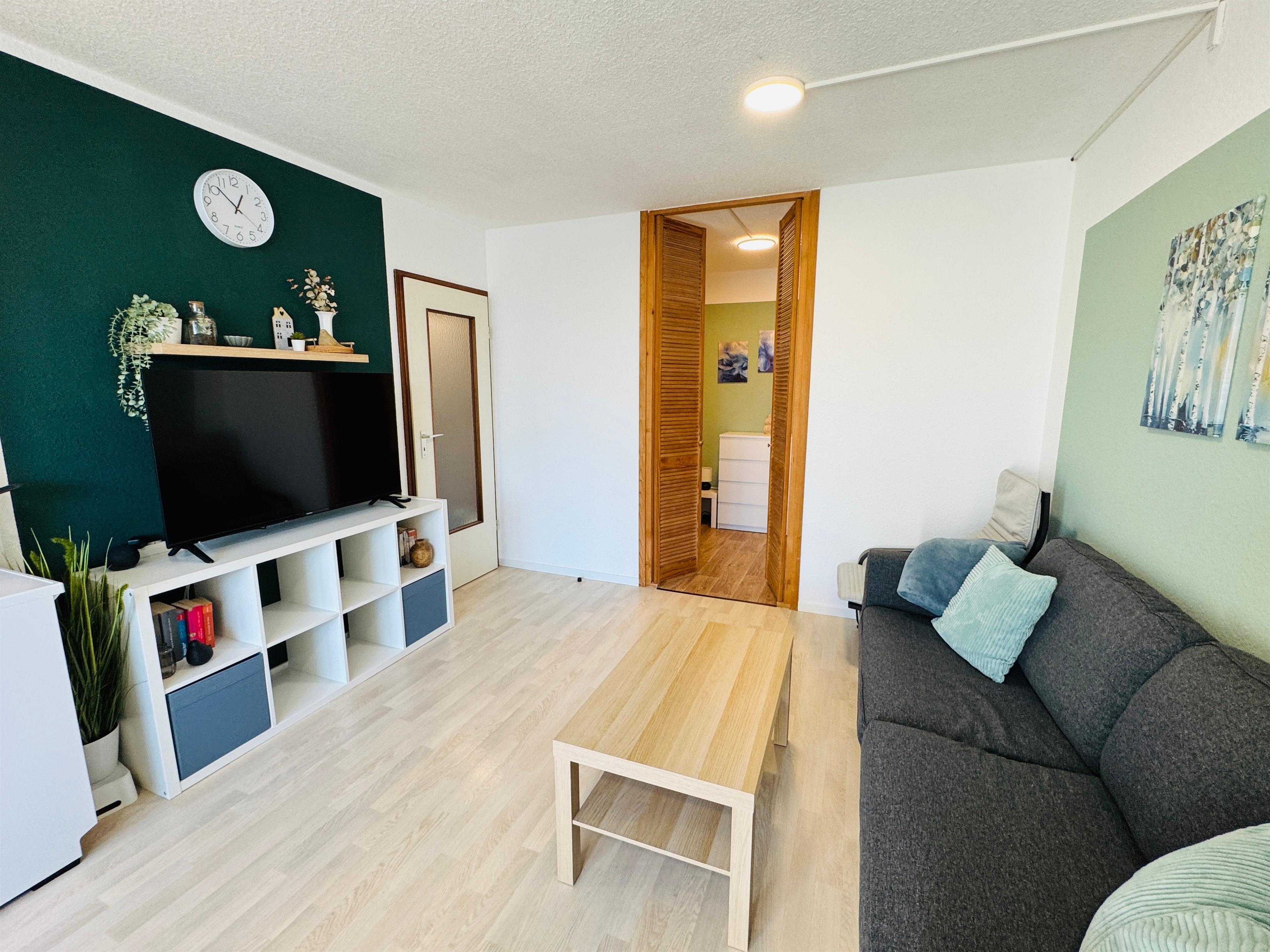 • Heller Wohnbereich mit gemütlicher Sitzecke und großem Smart-TV