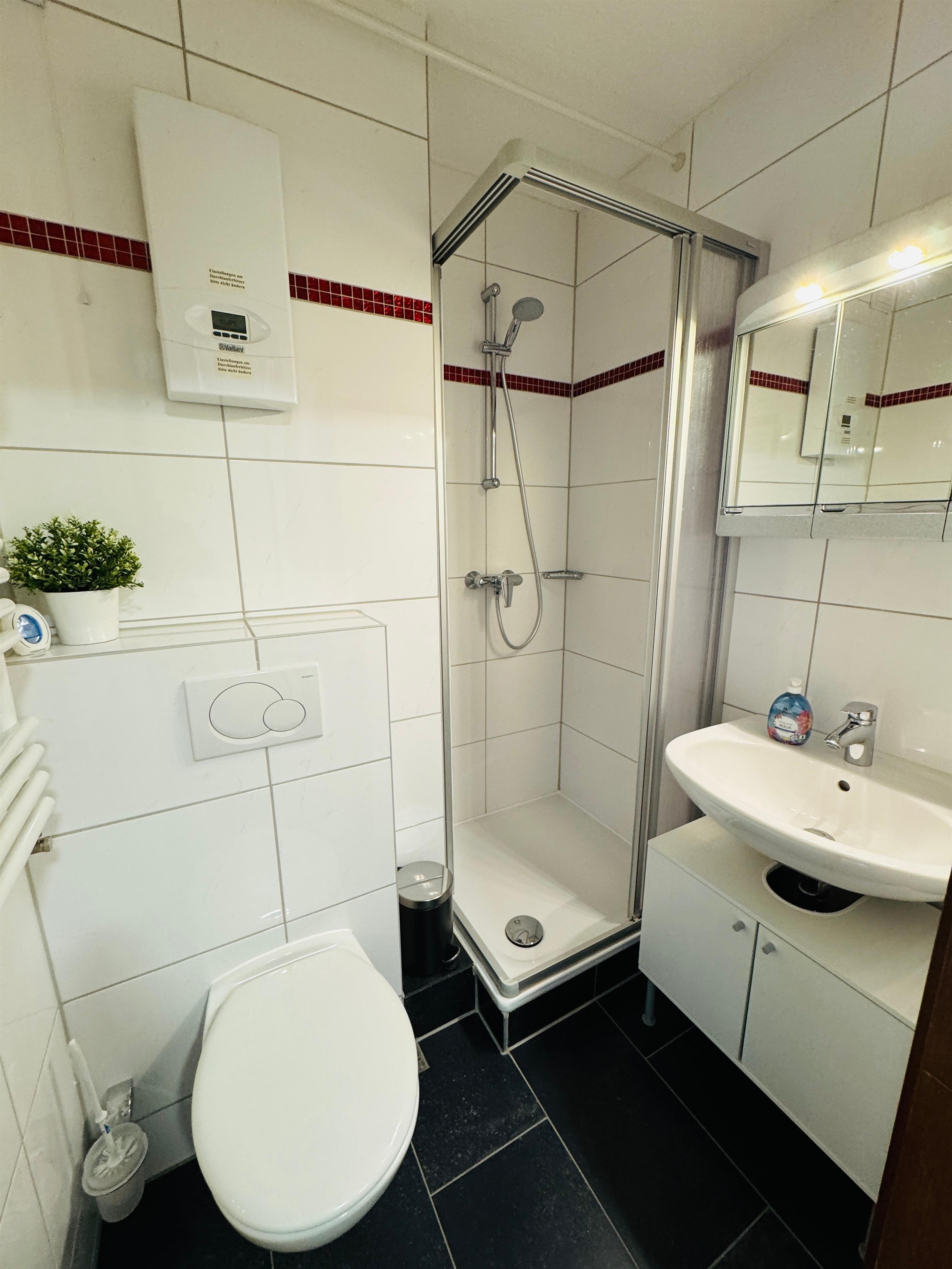 • Modernes Badezimmer (Dusche, WC, Waschbecken)