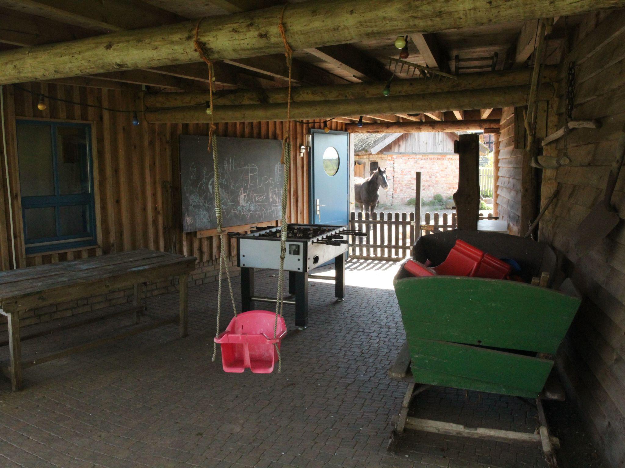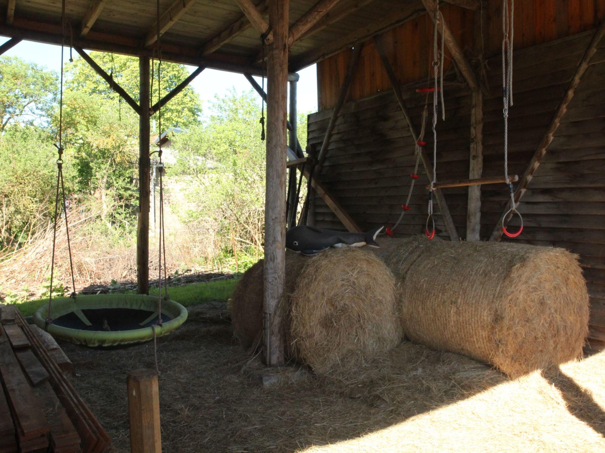 The large garden around the house invites you to play, barbecue and relax. The meadow orchard, the elder wood and the playground with hay bales provide a real farm feeling. A special highlight is the half-open barn, which offers a sheltered outdoor space whatever the weather. There are ponies and donkeys on the neighbouring farm, which can be stroked, cuddled and even ridden by prior arrangement.