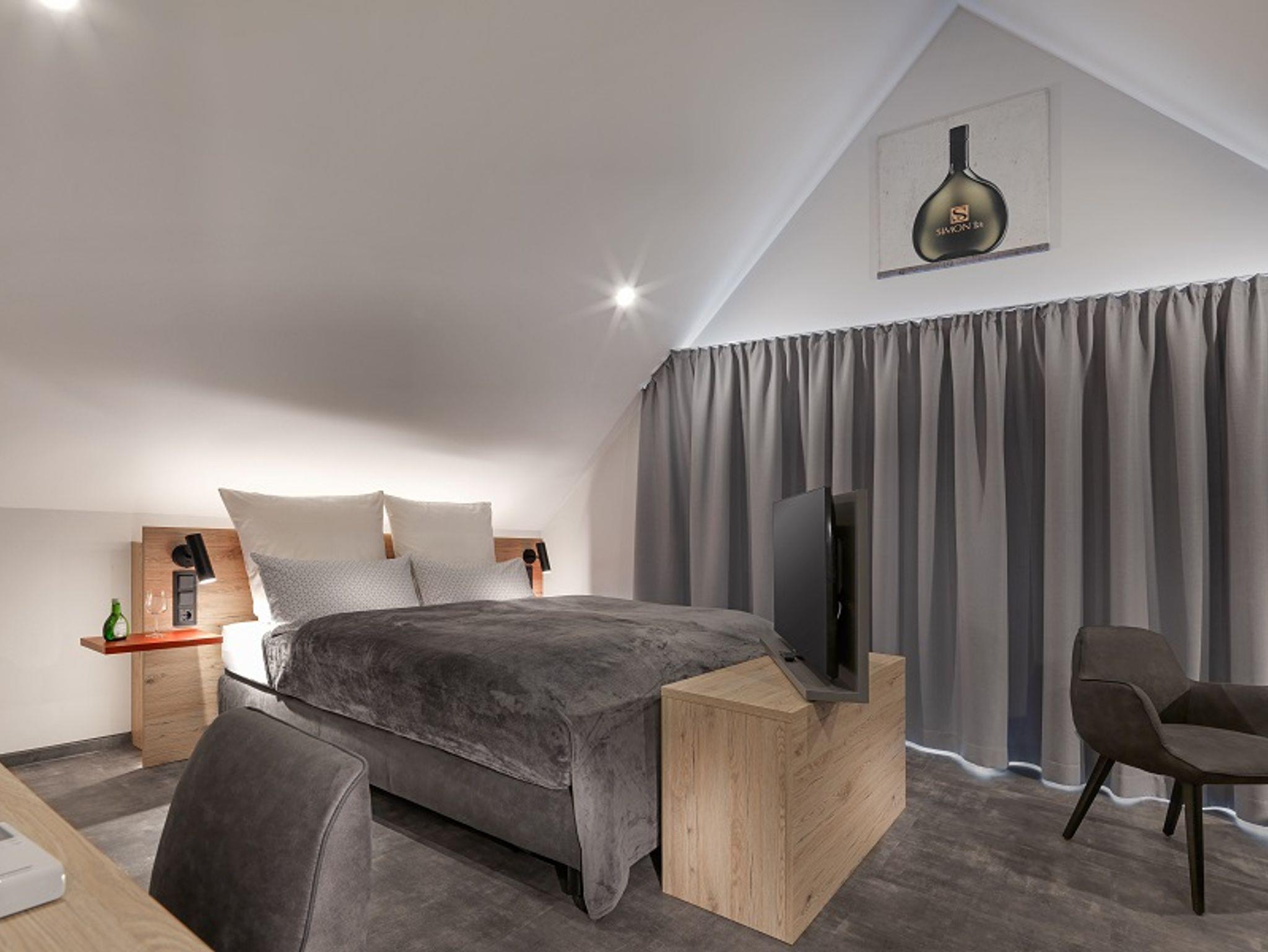 Jedes unserer stilvoll eingerichteten Nichtraucher-Zimmer hat seinen eigenen Wein-Charakter. Ein modernes Boxspringbett mit allergikerfreundlicher Bettwäsche lädt zum Entspannen ein. Alle unsere Betten können sowohl als Einzel- als auch als Doppelbetten genutzt werden. In allen unseren modernen Zimmern finden Sie einen Flat-Screen Sat-TV, einen Schreibtisch mit USB Steckdose, gratis WLAN und einen Hotelsafe. Für das optimale Klima in jeder Jahreszeit bieten wir Ihnen eine individuell regelbare Klimaanlage und eine Fußbodenheizung. Genießen Sie gerne einen Kaffee aus der zimmereigenen Nespresso Kaffeemaschine oder probieren Sie das bereitgestellte Teesortiment. Das großzügige Badezimmer verfügt neben einer Walk In-Regendusche über einen beleuchteten Kosmetikspiegel, einen Föhn und ein WC. Gerne stellen wir Ihnen auf Wunsch Hotelkosmetik und Hygieneartikel bereit. Um den Abend gemütlich ausklingen zu lassen, bedienen Sie sich gerne an dem integrierten Weinkühlschrank, welchen wir Ihnen gerne gegen Aufpreis füllen.