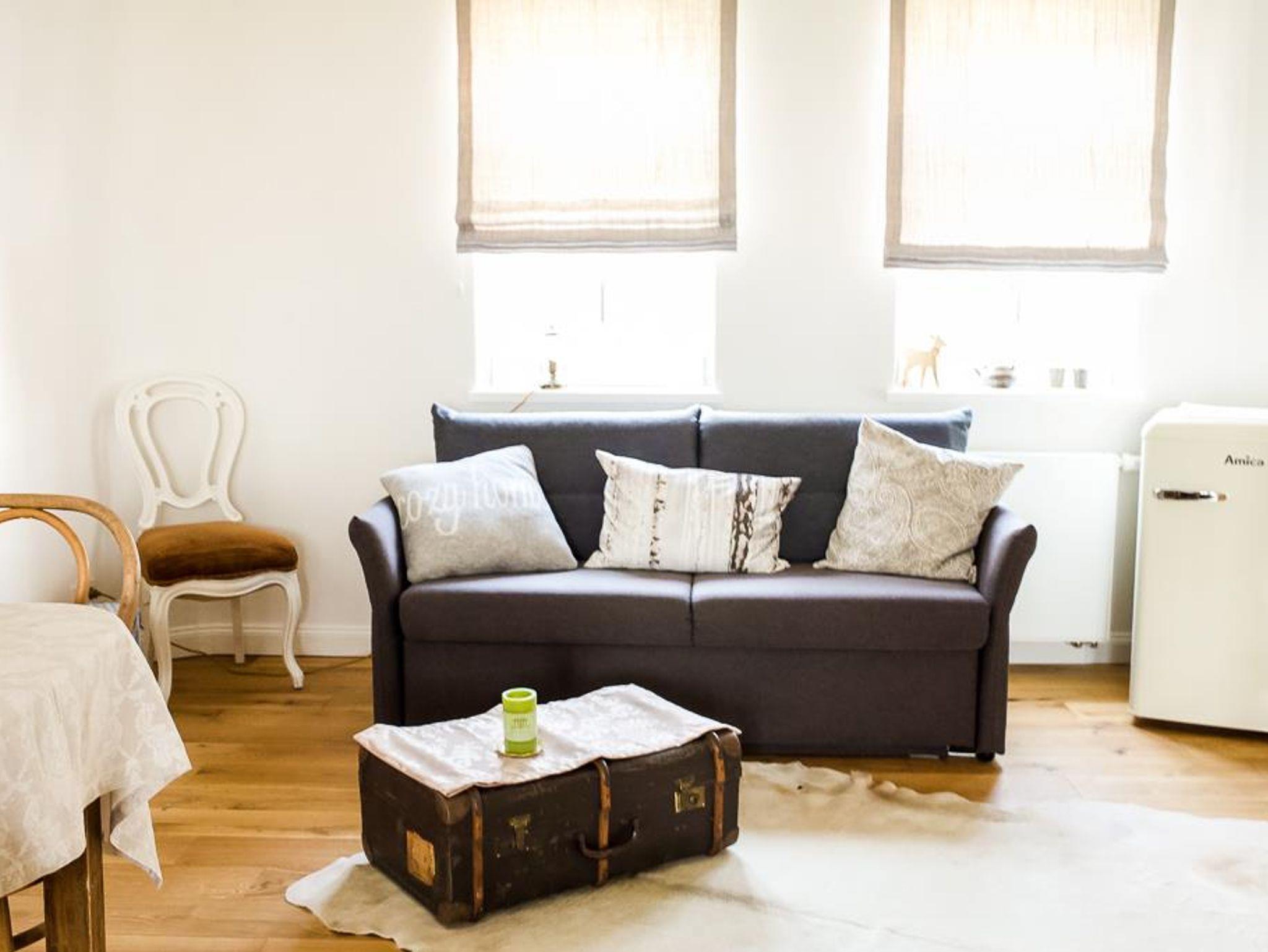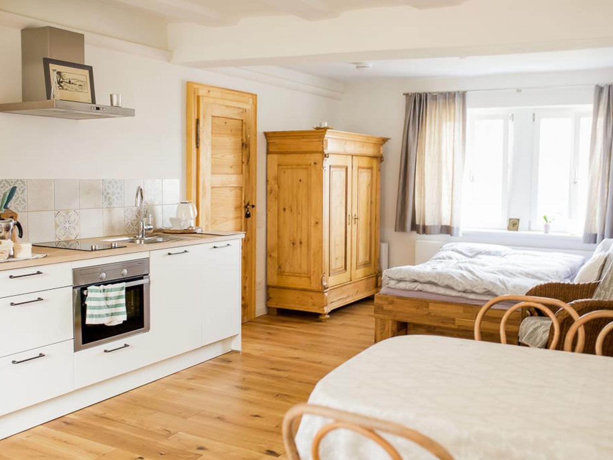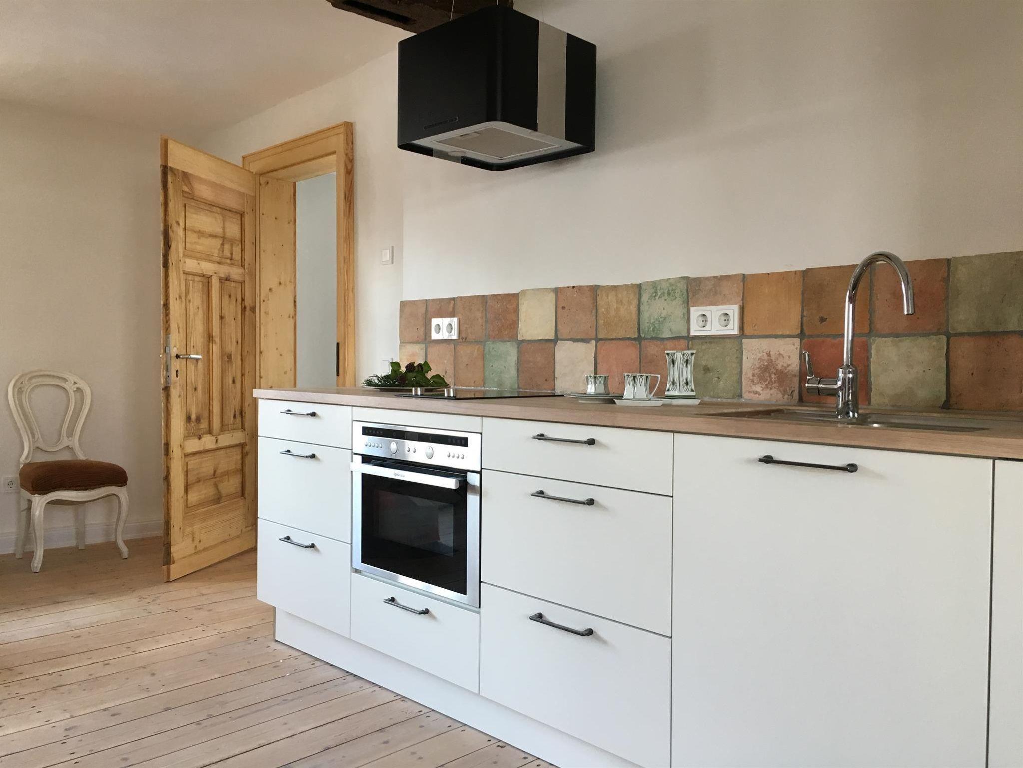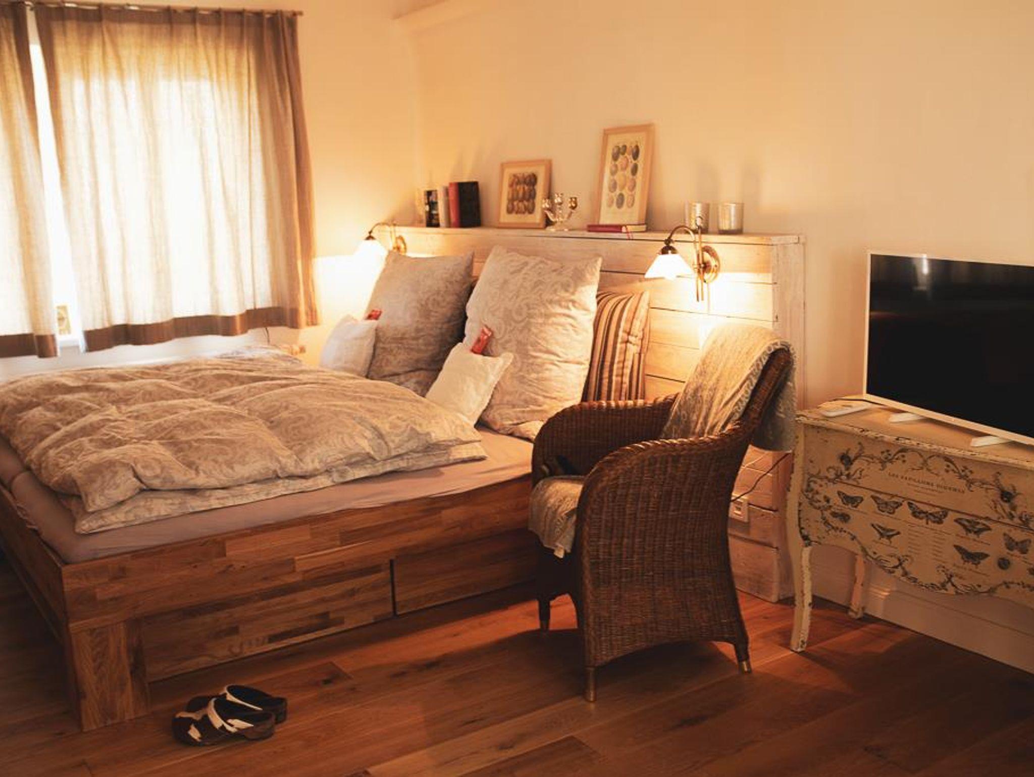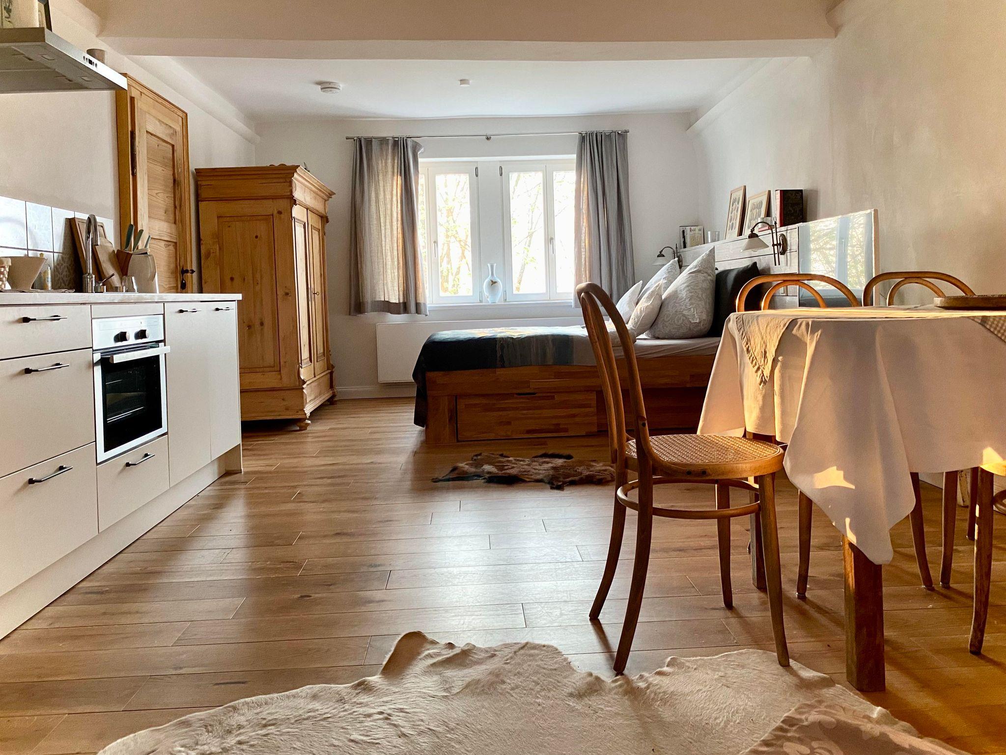 Bekassine * * * Die ehemalige Gute Stube mit der denkmalgeschützten verputzen Balkendecke bietet auf 36 qm Wohn- und Schlafraum für 2 Personen (Zustellbett auf Anfrage). Hochwertige Ausstattung und solides Handwerk prägen den Stil dieser Wohnung: Ankommen und sich zuhause fühlen. Vom Deutschen Tourismus Verband mit drei Sternen zertifiziert. Alte Dielenbretter fanden nach einem Anstrich mit Holzveredlung einen neuen Einsatz als Kopfteil des neuen Bettes. Je nach Bedarf werden dicke und dünne Daunendecken (allergikergeprüft) bereitgehalten. Auch wenn es draußen regnet- drinnen lässt es sich gemütlich machen. Für gekühlte Getränke steht ein Kühlschrank zur Verfügung - oder vielleicht einen heißen Tee/Kaffee machen? Die Küchen sind alle umfangreich ausgestattet: Wasserkocher, Toaster, Mixer. Weitere Haushaltsgeräte auf Anfrage. Tee und frisch gemahlener Kaffe, Milch und Zucker stehen täglich bereit. Hunde sind gestattet.