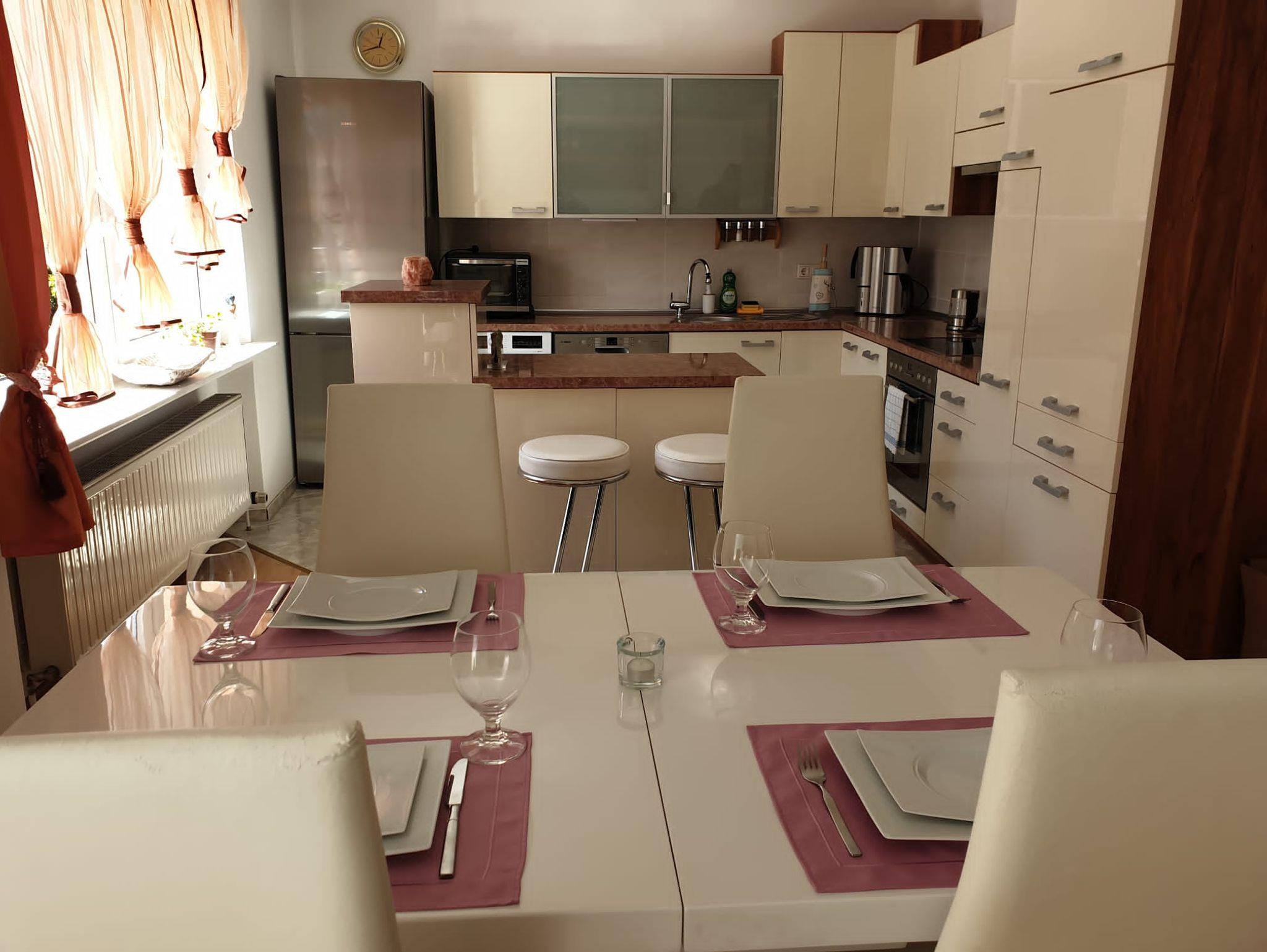 Herzlich Willkommen in der Ferienwohnung Nella. Die (65m² große) Wohnung mit Balkon befindet sich in einer ruhiger Lage und liegt im 1. Stock unseres Hauses. Sie verfügt über 1 Schlafzimmer mit einem Doppelbett (1,80-2,00) und 1 Wohn/Esszimmer mit Schlafcouch (1,60-2,00) mit Sat.TV. Die großzügige Küche ist mit allem ausgestattet was man braucht. Desweiteren finden Sie ein Bügeleisen sowie ein Bügelbrett, Bettwäsche und Handtücher sind inklusive. Unser Haus verfügt über kostenfreies WLAN und einen Parkplatz vor der Tür.