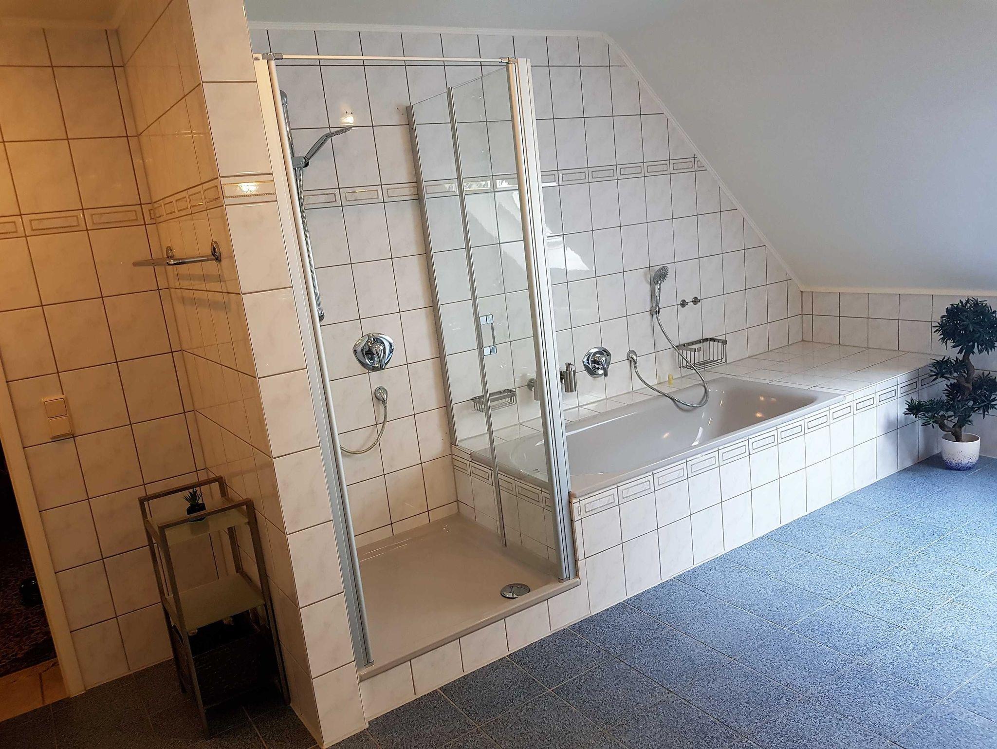 Bad mit einer Dusche, einer Badewanne und Infrarot-Sauna, Handtücher und Bettwäsche sind bereits im Preis inkludiert.