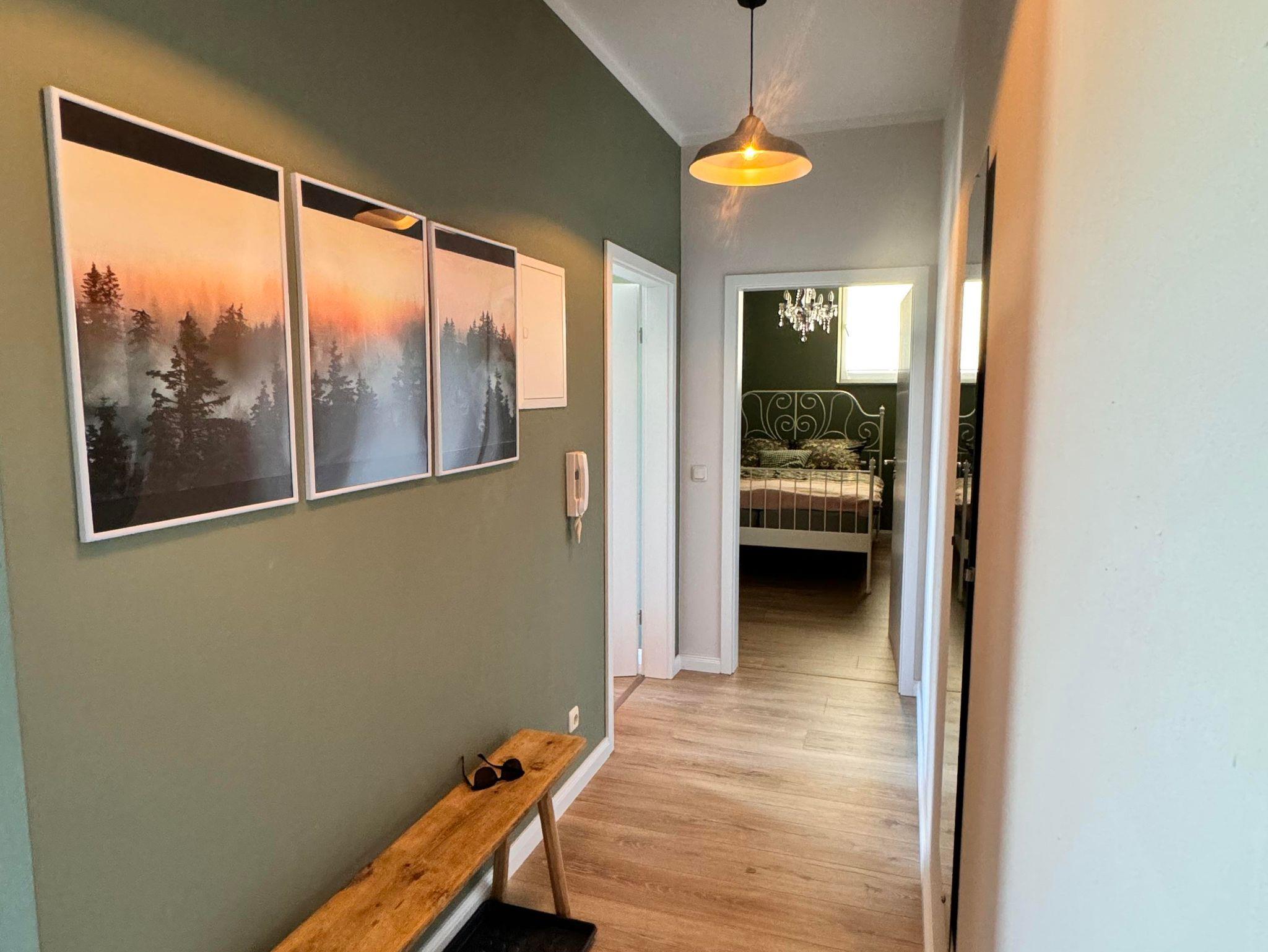 Die Wohnung hat einen Flur, ein Badezimmer mit Dusche, ein Schlafzimmer mit Doppelbett und Kleiderschrank, eine kleine Küchenzeile sowie einen angegliederten Wohnzimmerbereich mit gemütlichem Ledersofa und großem TV. Die Einrichtung erfreut mit einem Mix aus traditionellen Elementen (z.B. einem historischen und aufgearbeiteten Esstisch) und modernem Komfort.
