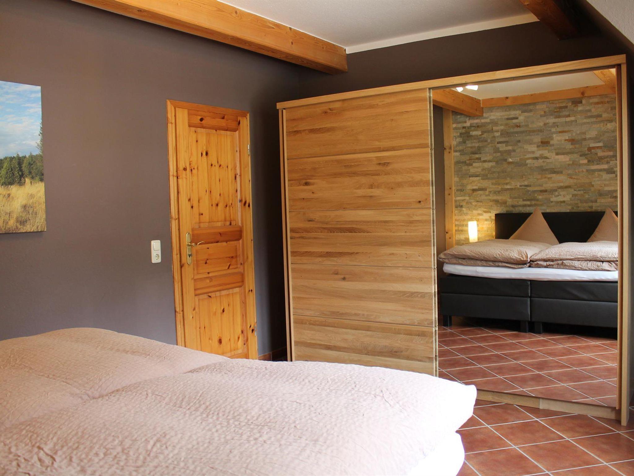 - Galerie: Treppe im Wohnbereich nach oben zur offenen Schlafgalerie mit Boxspringbett 1,60m x 2,00m und Einzel-Boxspringbett 0,90m x 2,00mm, Einbauschrank, von hier aus mit Tür getrennt Zugang zum zweiten separaten Schlafzimmer mit Boxspringbett 1,80m x 2,00m und Einzel-Boxspringbett 0,90m x 2,00m