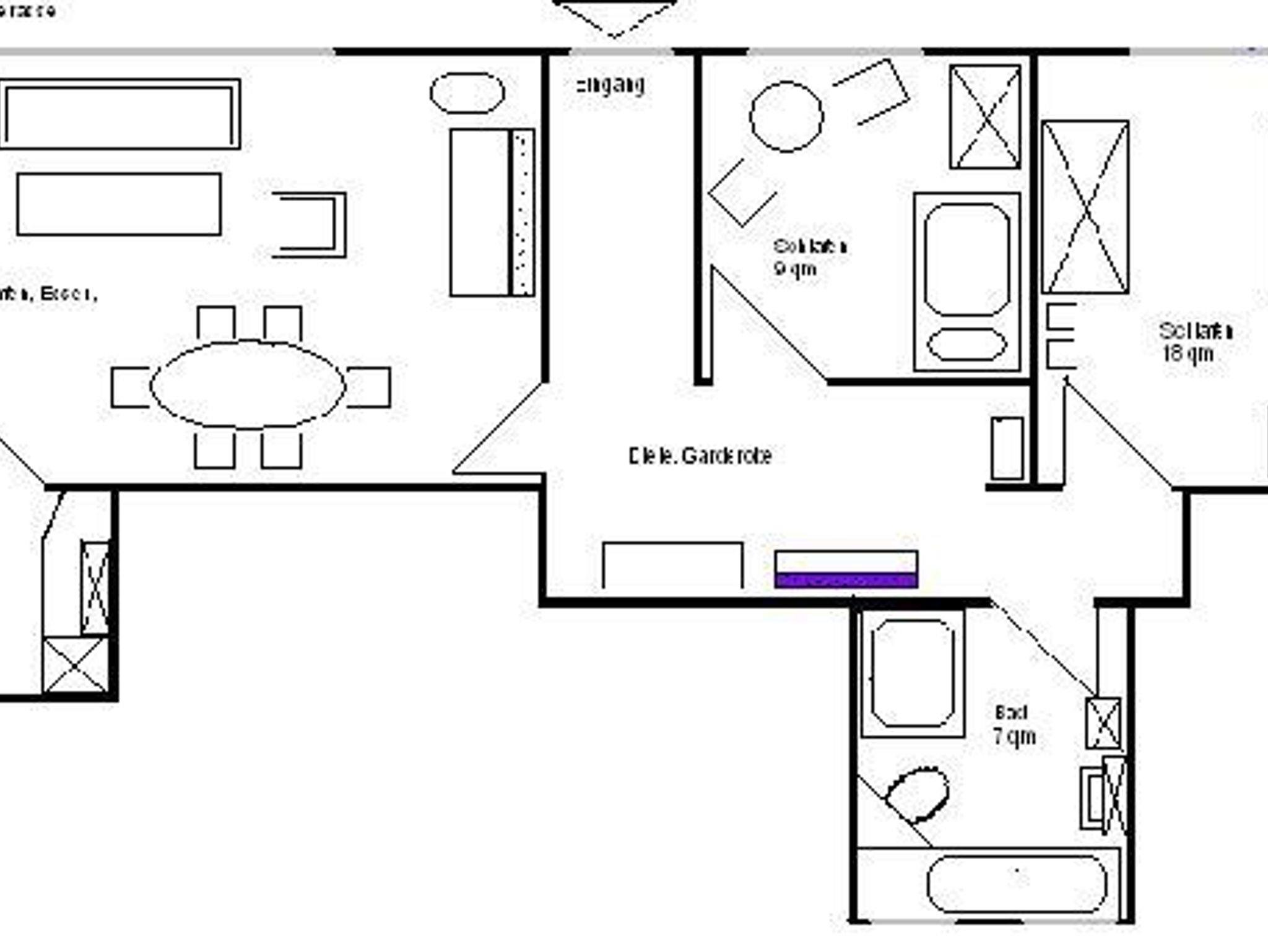 EG, seperater Eingang, ein Wohn-/Esszimmer mit TV, DVD, Radio und CD, Flur und Diele, Küche mit 3-Sterne-Gefrierabteil im Kühlschrank und 4-Platten E-Herd mit Backofen, ein Schlafzimmer mit Doppelbett, ein Schlafzimmer mit Etagenbett, Bad mit Badewanne und Dusche, 1 Waschbecken, Terrasse mit Markise